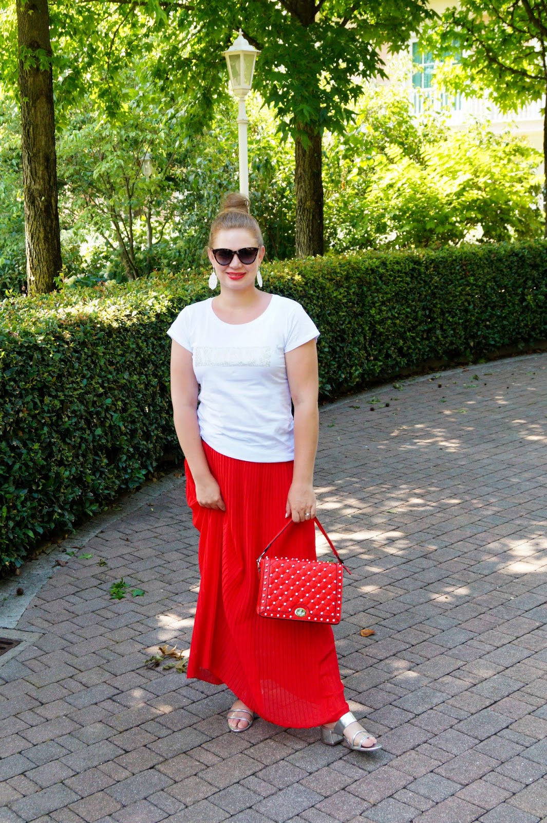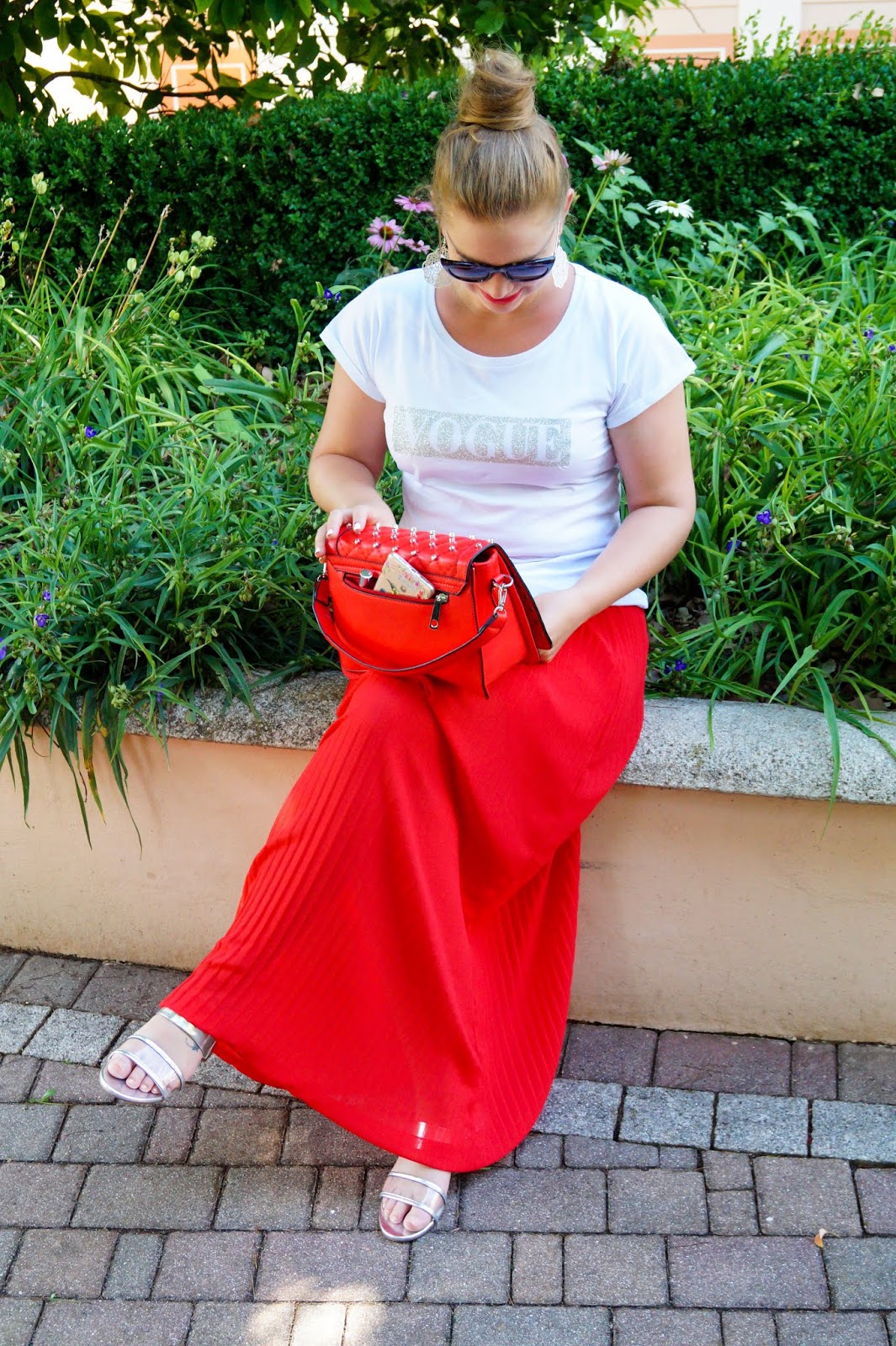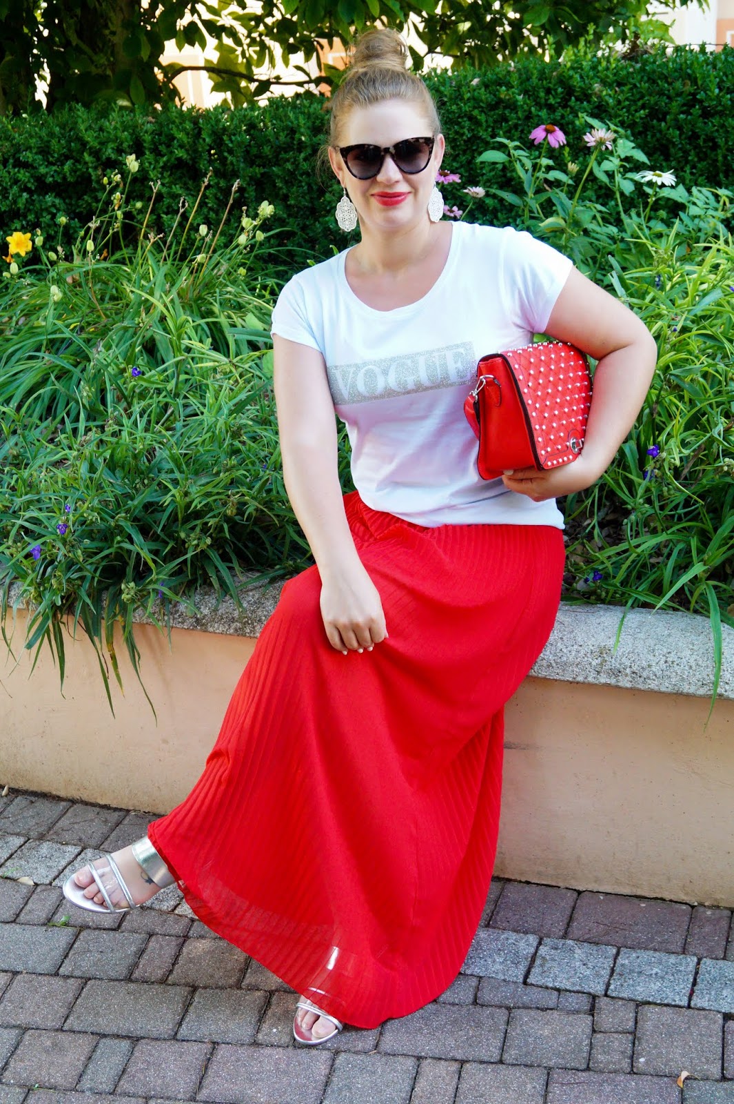 similar Vogue t-shirt here other one here / red pleated skirt similar here and here / slides Zara similar here and here / red studded bag from a local shop similar here and here