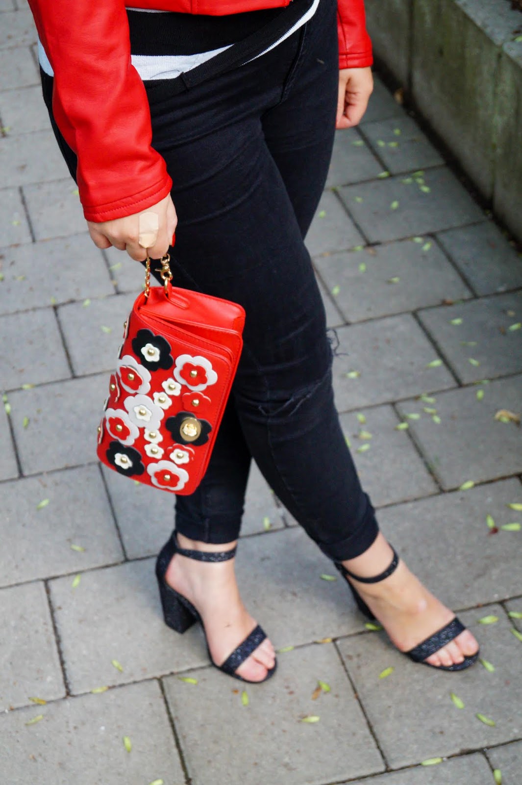 shirt local store similar here and here / lips MAC Red / sandals even&odd sold out similar here and here / destroyed denim even & odd last season similar here and here / red leather jacket Only sold out similar here and here / flower clutch Christmas present similar here and here