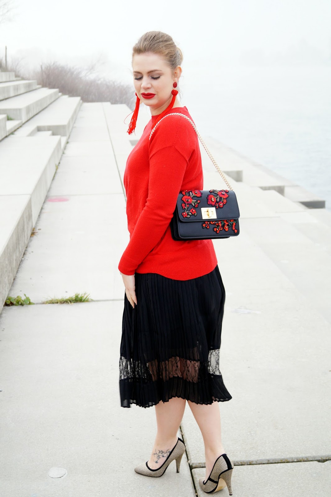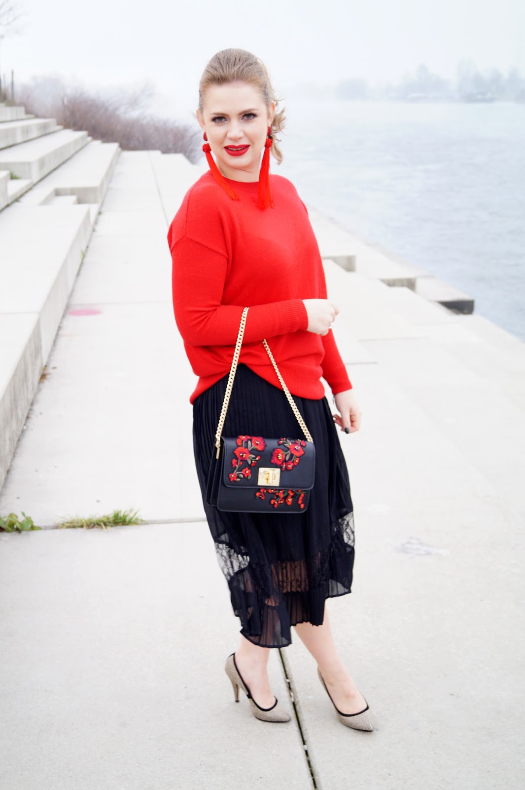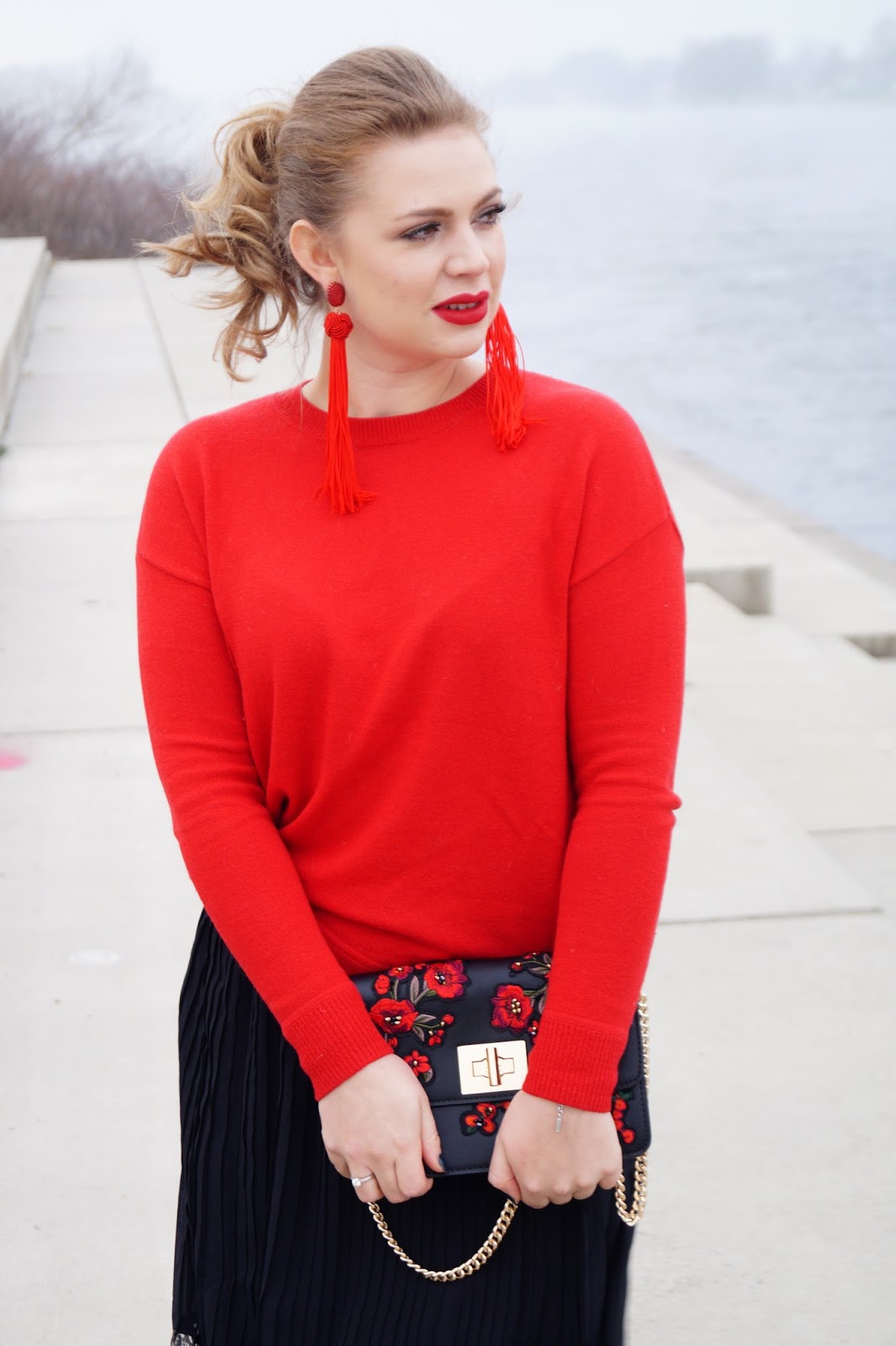 The red pullover is a H&M staple and is available every year in several colors. I paired it with these super cute tassel earrings I got for Christmas from my MIL and the black and handbag with red flower embroidery also from Mango and also a gift from my MIL.