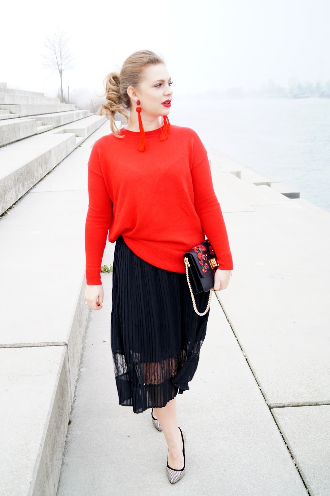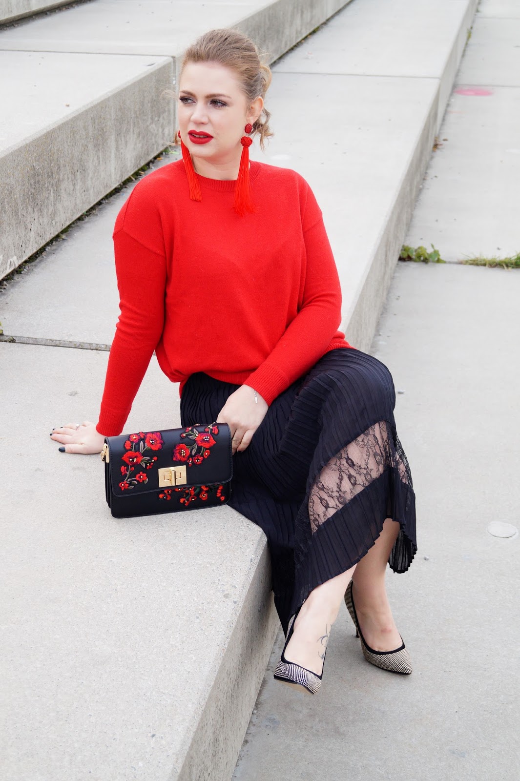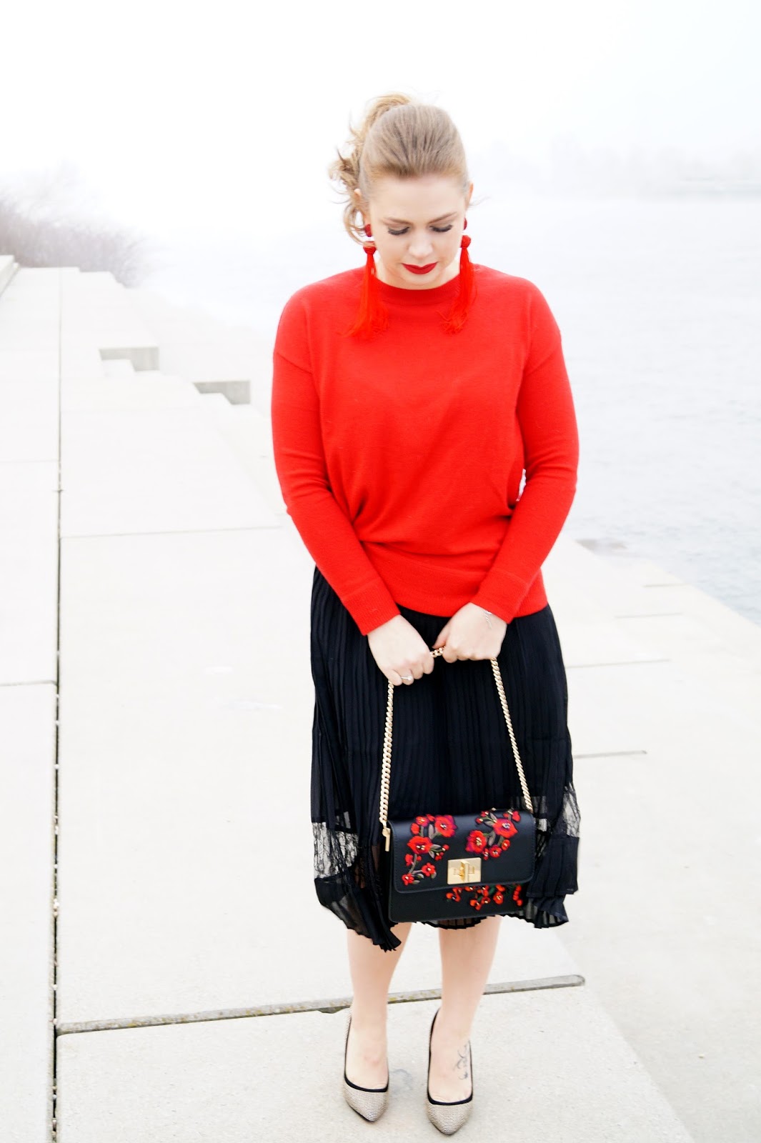 The red pullover is a H&M staple and is available every year in several colors. I paired it with these super cute tassel earrings I got for Christmas from my MIL and the black and handbag with red flower embroidery also from Mango and also a gift from my MIL.