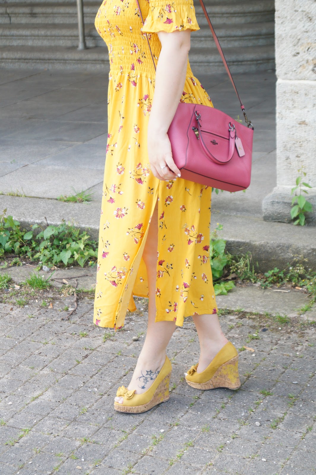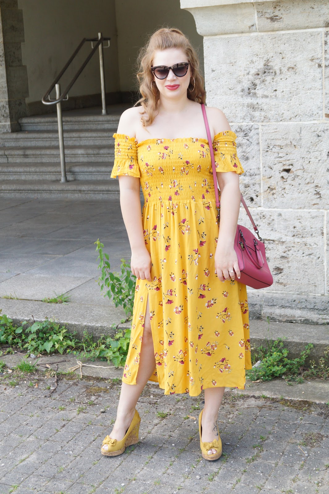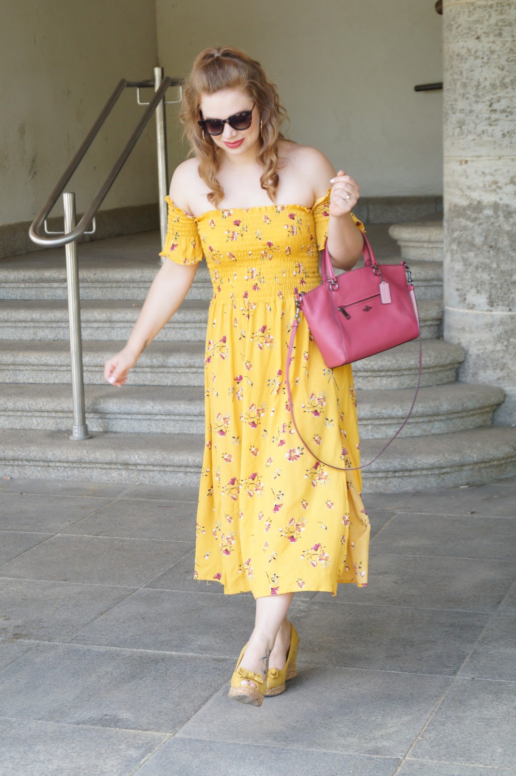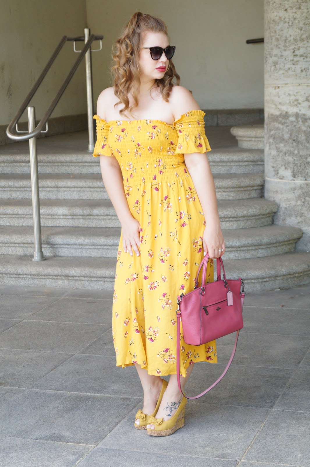 For this reason I have teamed up with Zaful to share this fabulous dress with you guys. It is the floral slit smocked off shoulder midi dress. Mine is in the mustard color but there are also 3 others available (loving the pink one too).