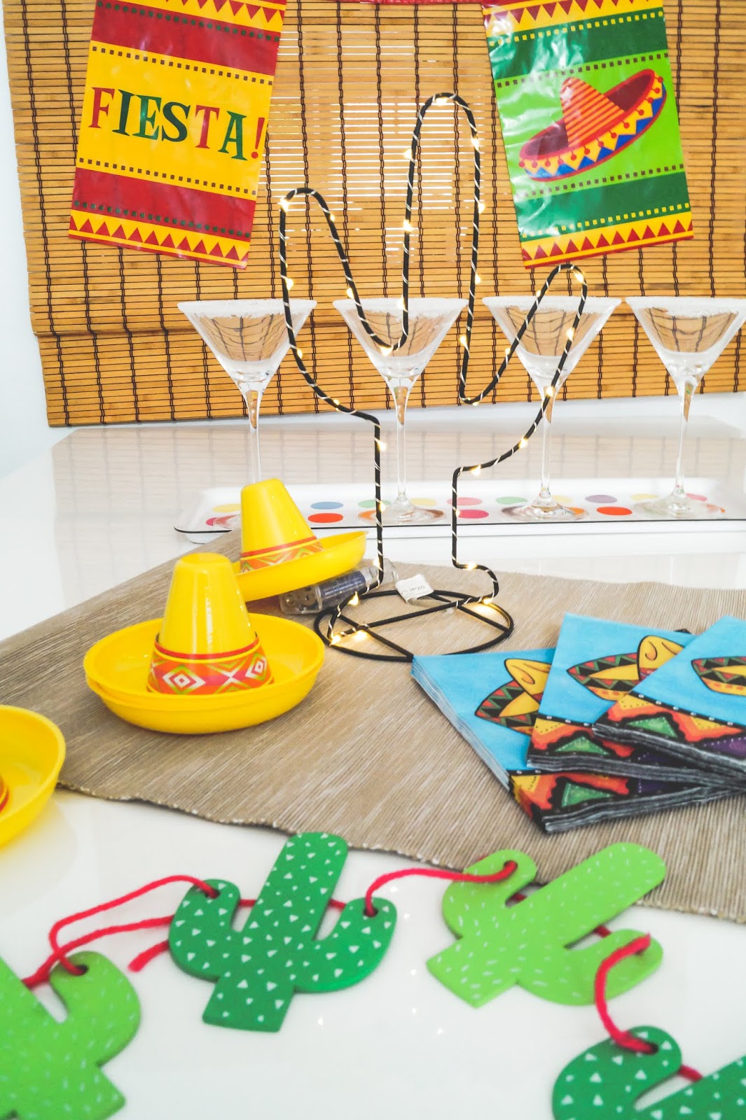 So for our Mexcian theme I got these little sombreros, matching napkins, a wooden cactus garland, some colorful pompoms to hang up and this adorable black metal cactus with a led-wire around it.