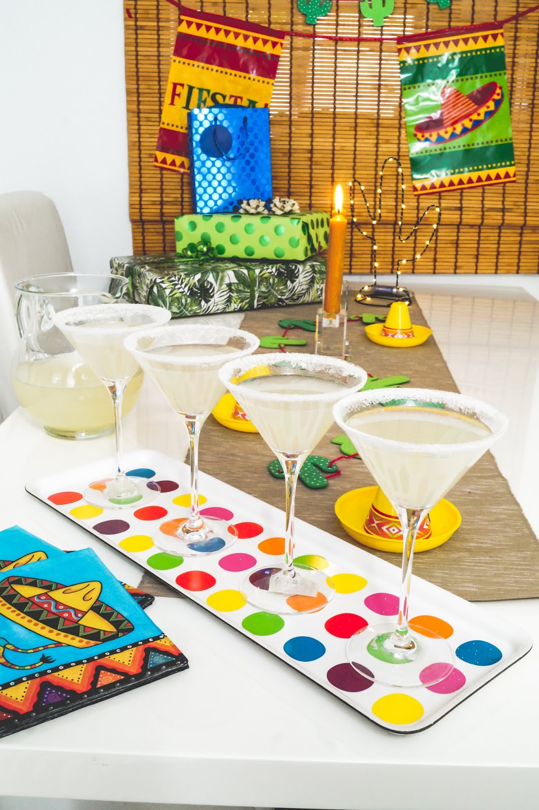 Paperless Post has so so so many different invitations for all kinds of parties, showers and even weddings. For our Mexican Fiesta theme I picked the Fiesta Frame invitation and started to customize it. Totally love the baby blue lines on the yellow backdrop. To make the yellow pop I went with a navy blue background. And aren´t the little glasses with the limes and the umbrella really make it work.