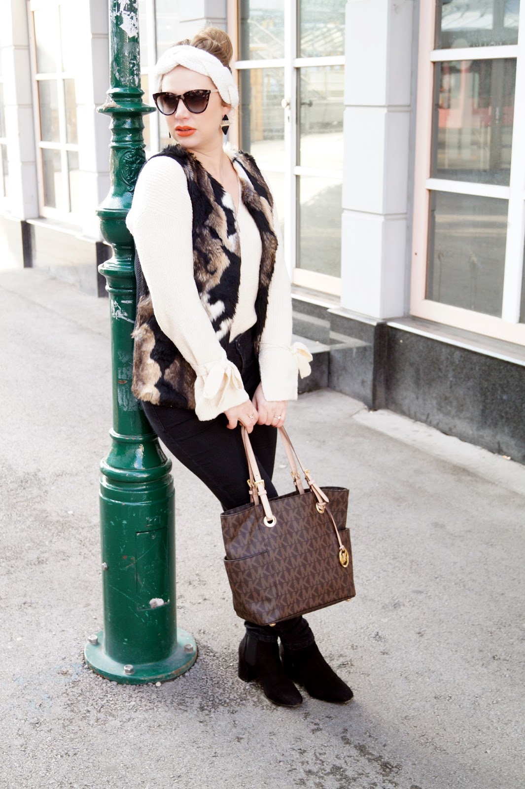 denim even & odd sold out similar here and here for tall girls / pullover Mango sold out similar here / faux fur vest old similar here / booties H&M last season similar here and here / bag Michael Kors / heandband / sunnies
