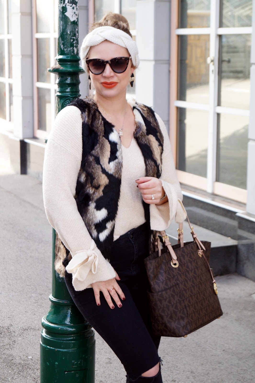 Combined with a pair of black distressed denim and black booties the focus was on the top of the look To round up the outfit I combined my brown Michael Kors shopper, the creme headband and a pair of statement earrings too it. The sunnies are also a pair I love and I had in black first but I really love the turtoise style so I had to have these.