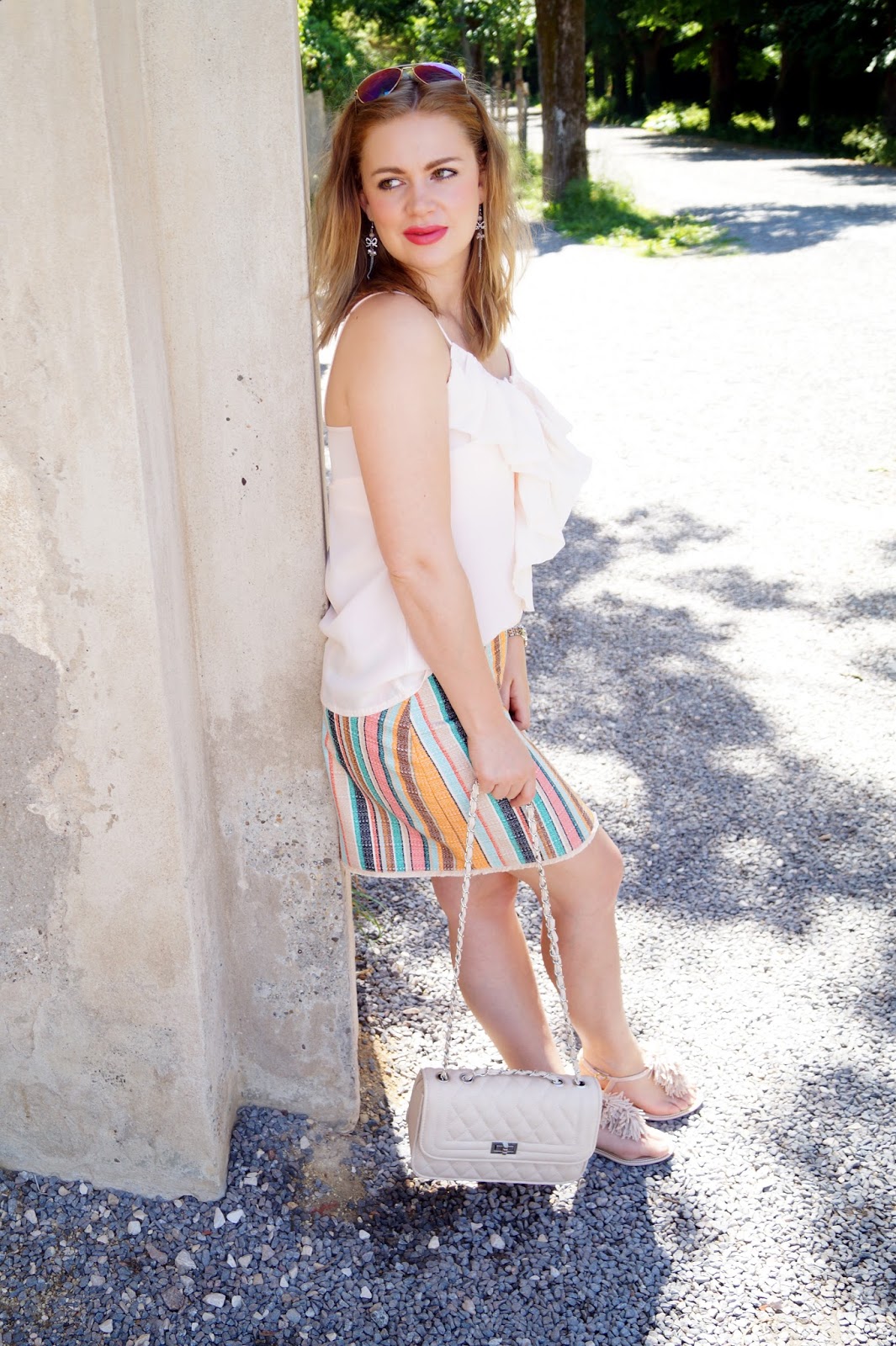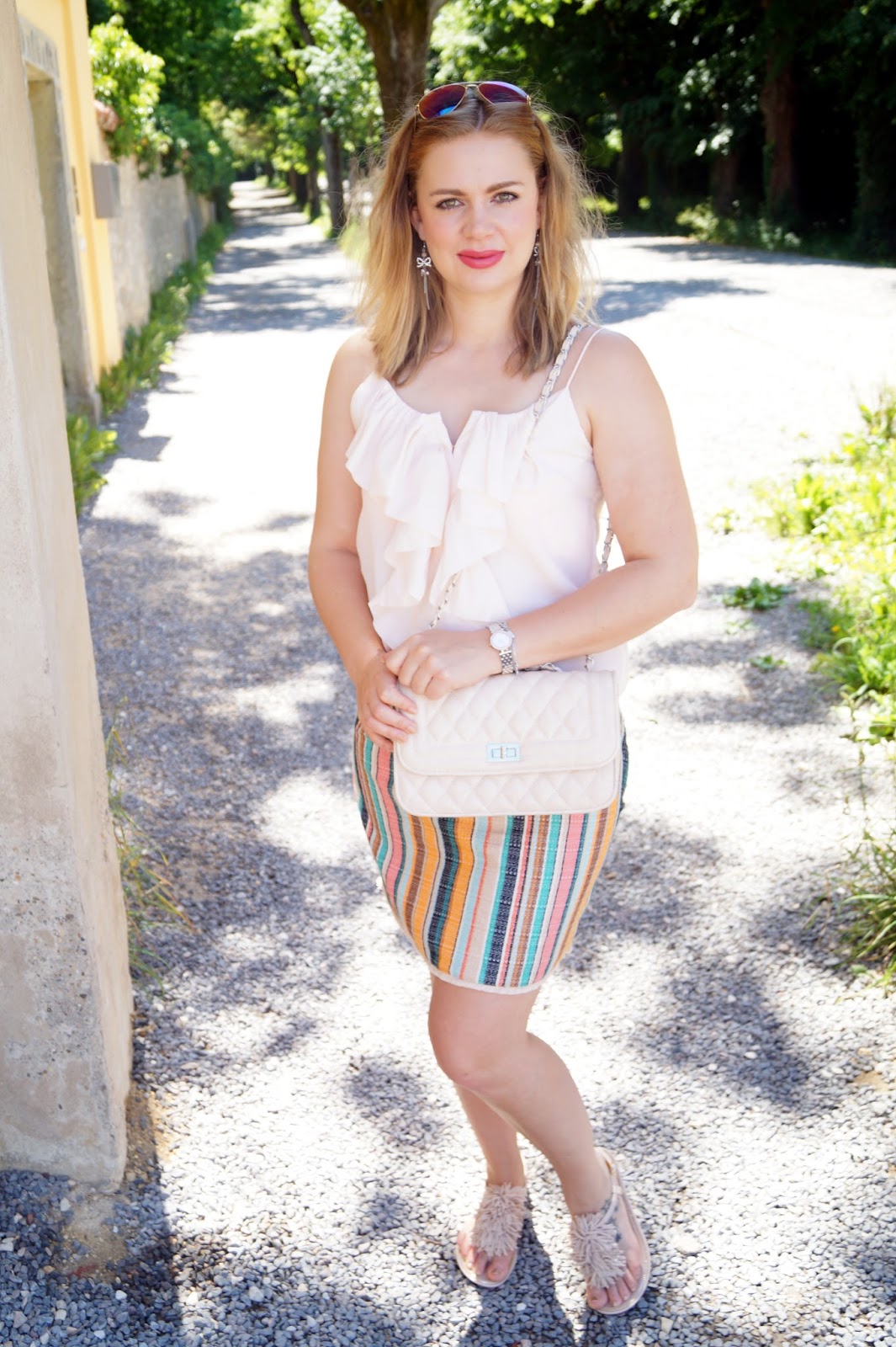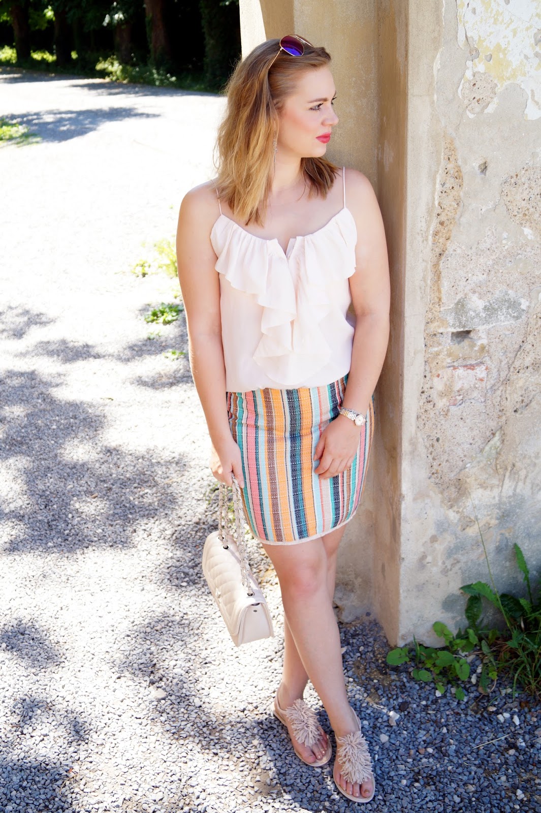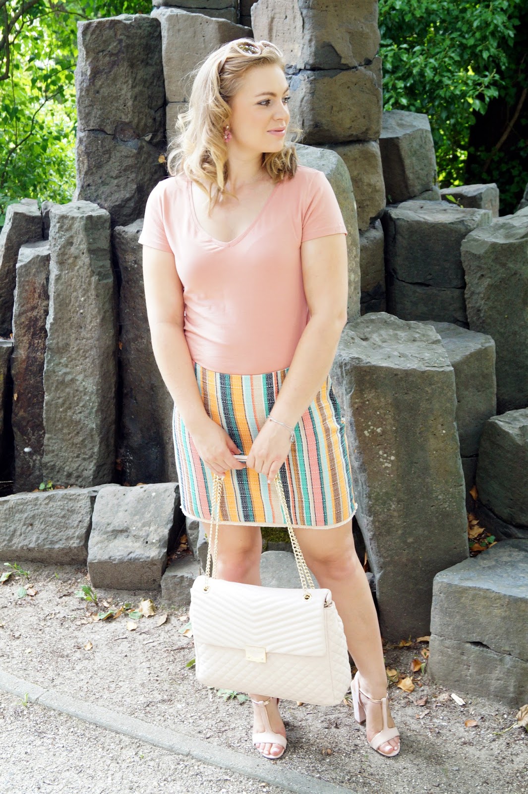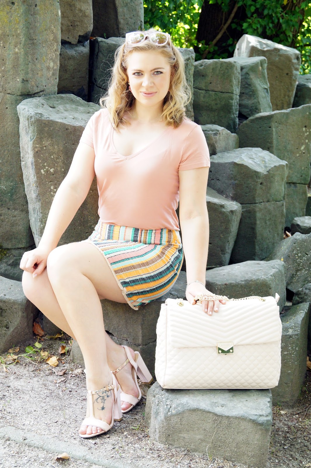 So in fact styling this one was a little tricky for me (it wouldn´t have been at all cause you can work so well with all the different colors the skirt gives you but you know, I had about ten different ideas and got a little overwhelmed by with which color to go). So I went with a blush basic t-shirt for the first look. I wanted to have the shirt casual cause I added a pair of blush block sandals with metalic details and a big quilted flap bag from Mario Valentino I recently got from amazon. I was searching everywhere for this style (and would have take every available color) cause it is a little older and is sold out everywhere. But amazon has it all right!!!