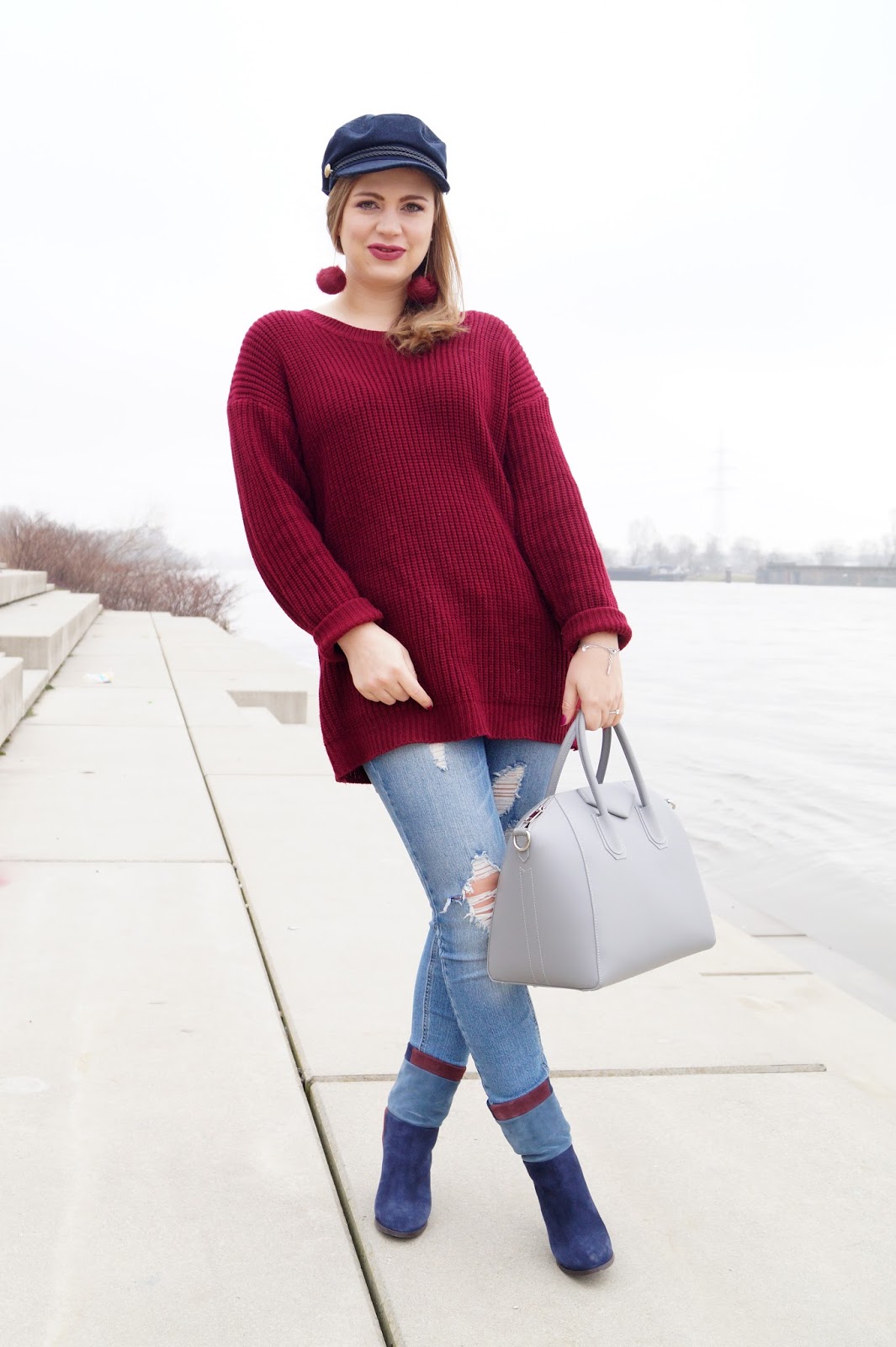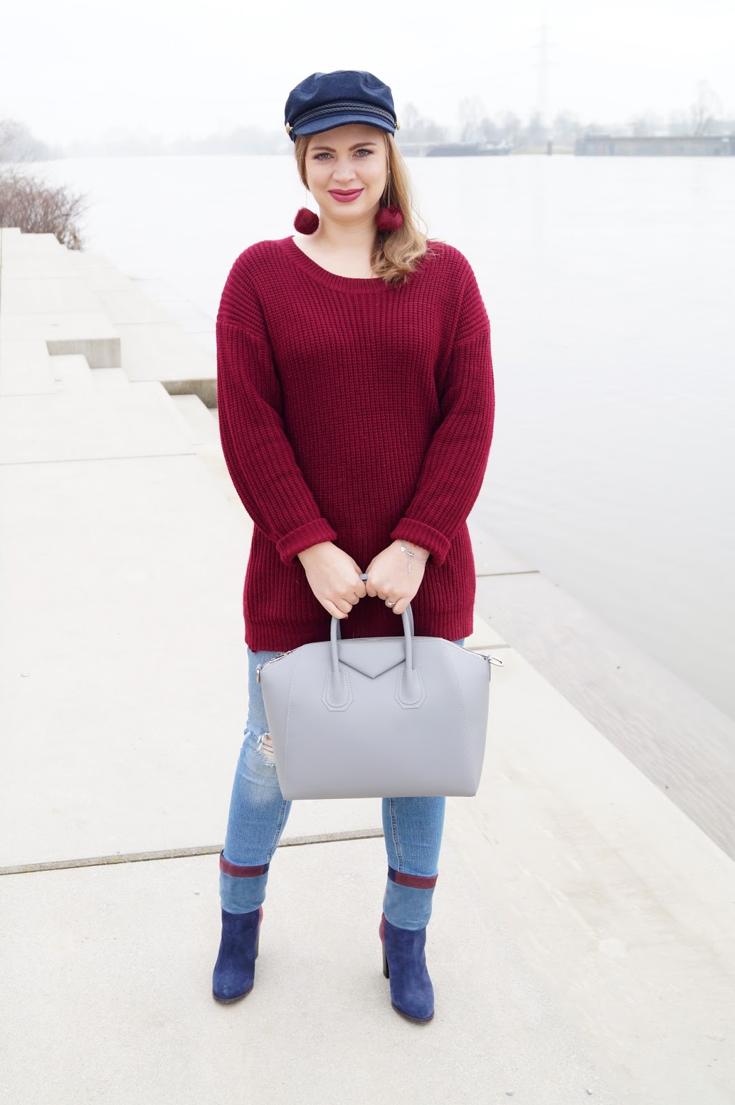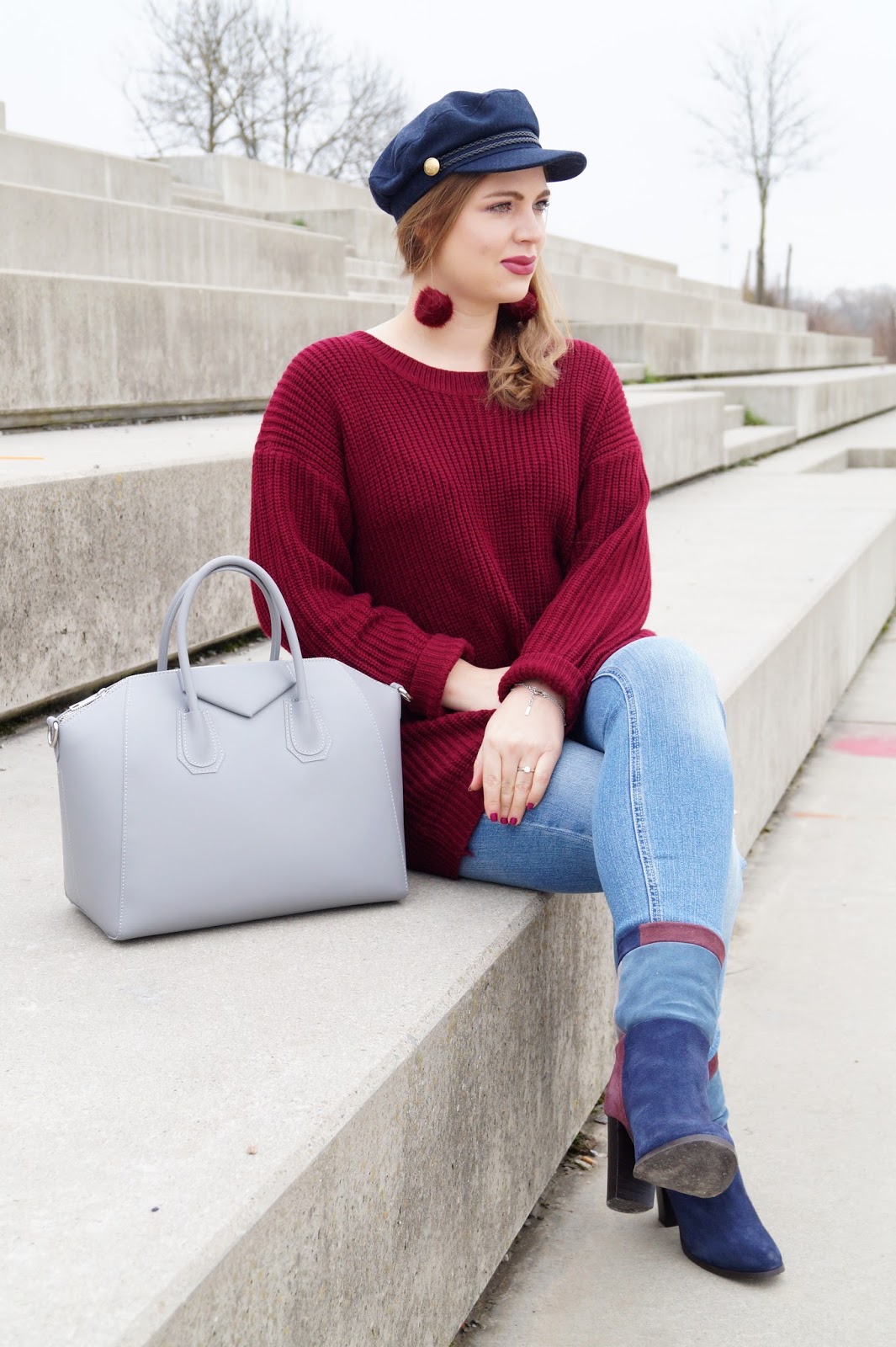 Speaking of combining – to bring in a third and lighter color I took the gray of the booties and paired my Givenchy Antigona dupe handbag from Fashion Drug to the whole look. The round up of the look was the navy blue cadett cap and the softest pom pom earrings I have ever seen.