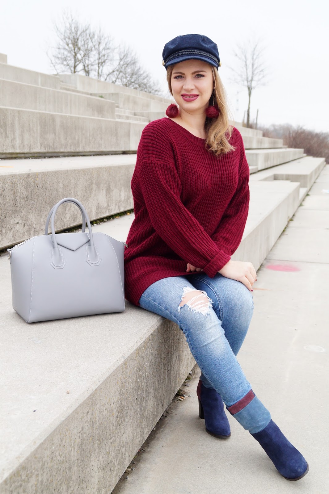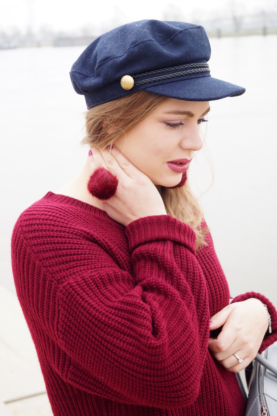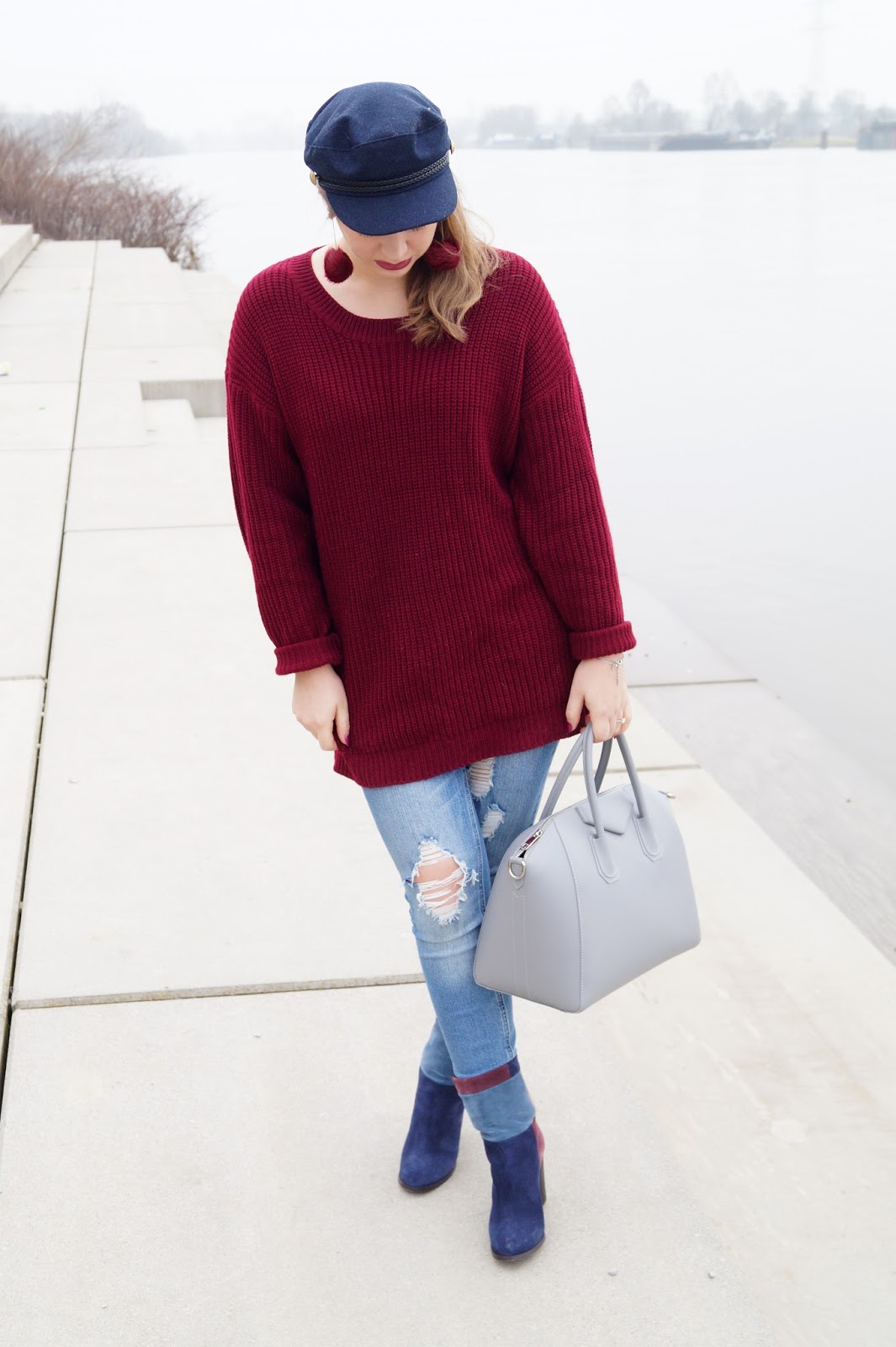 Speaking of combining – to bring in a third and lighter color I took the gray of the booties and paired my Givenchy Antigona dupe handbag from Fashion Drug to the whole look. The round up of the look was the navy blue cadett cap and the softest pom pom earrings I have ever seen.