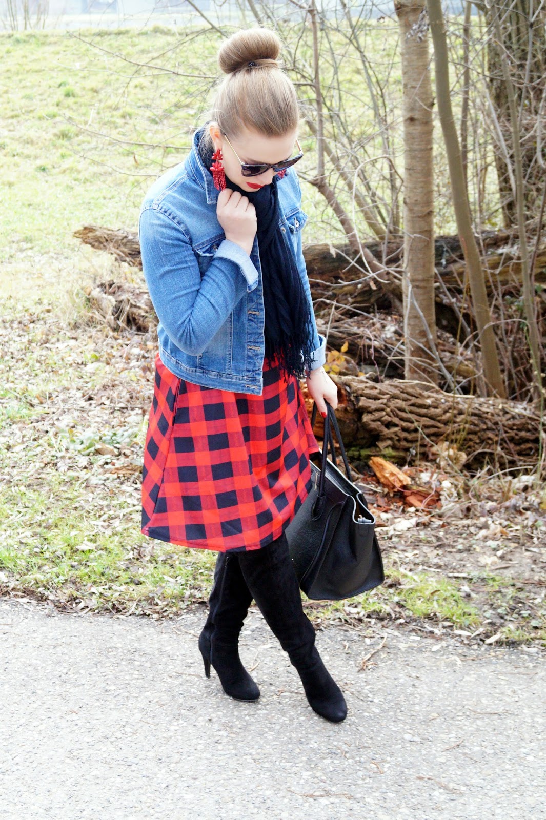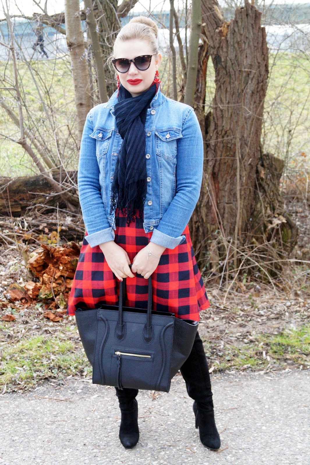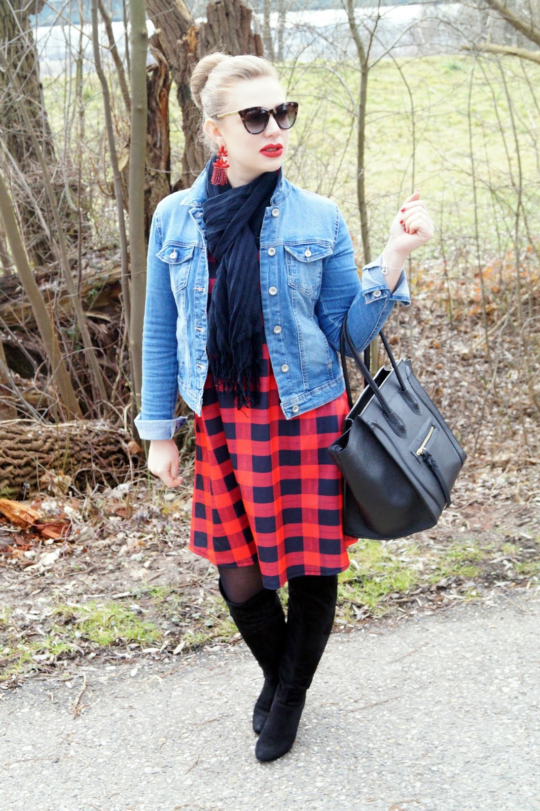 the Christmas Plaid Swing Midi Dress from Rosegal with a black scarf and a denim jacket to break the black and red theme
