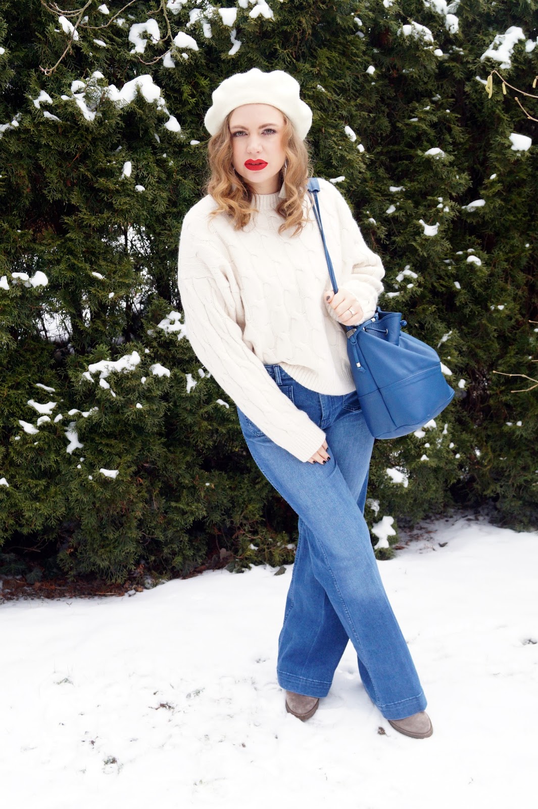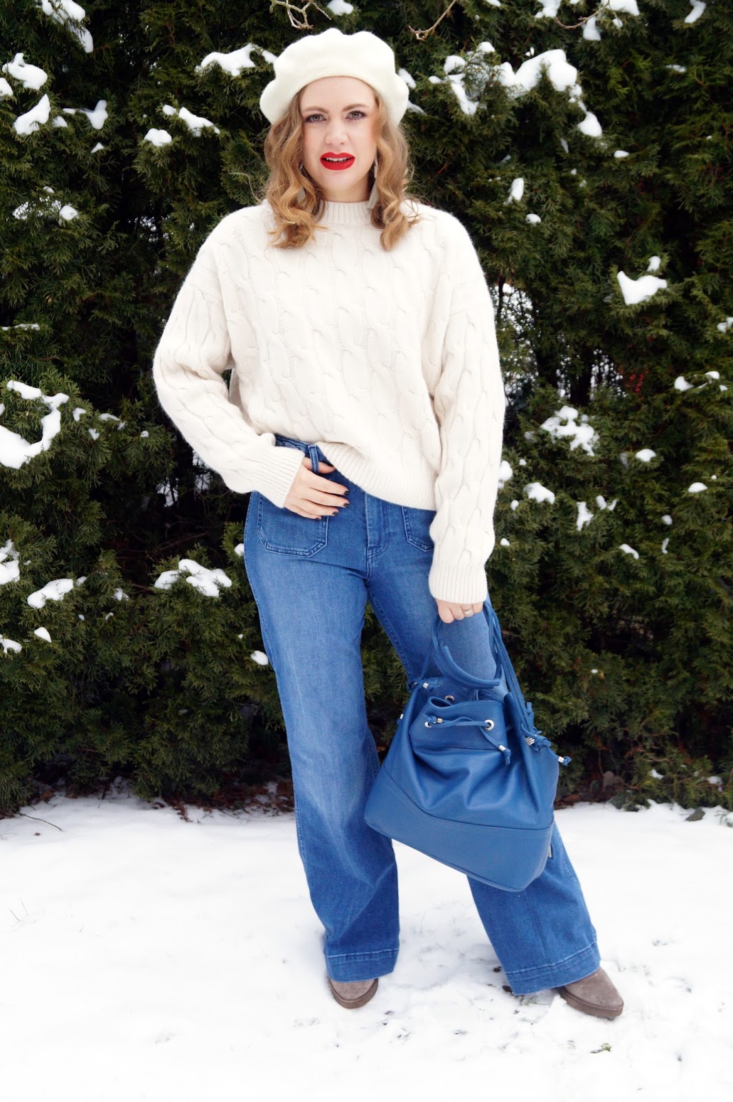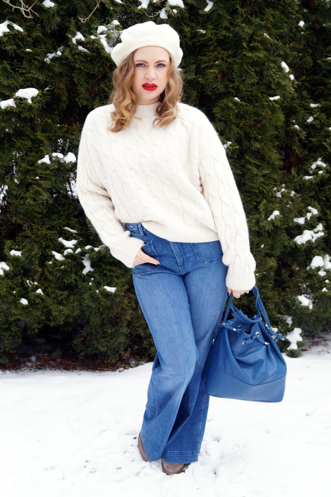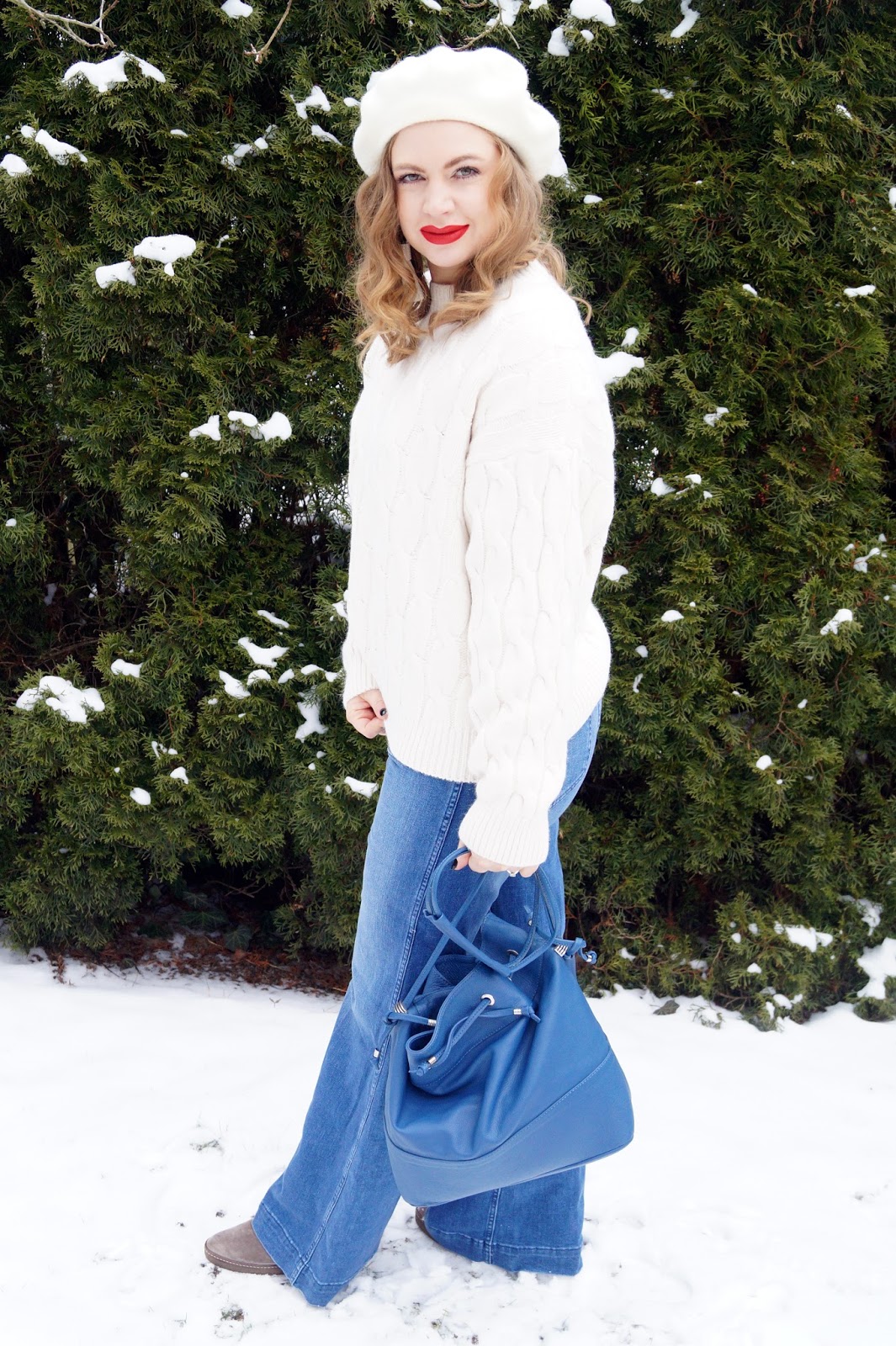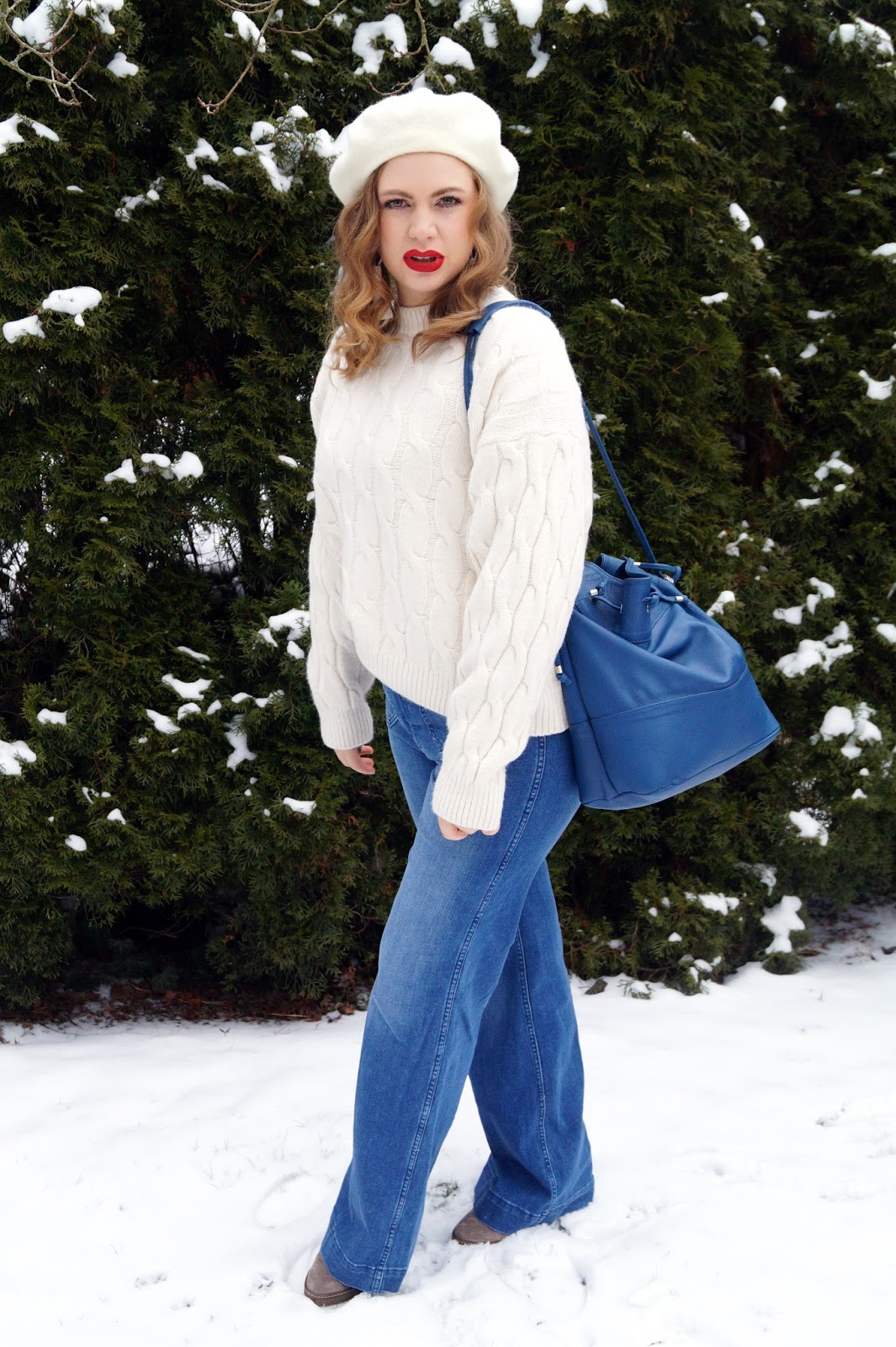 Winter white – knitted sweater / flared denim and a bucket bag…