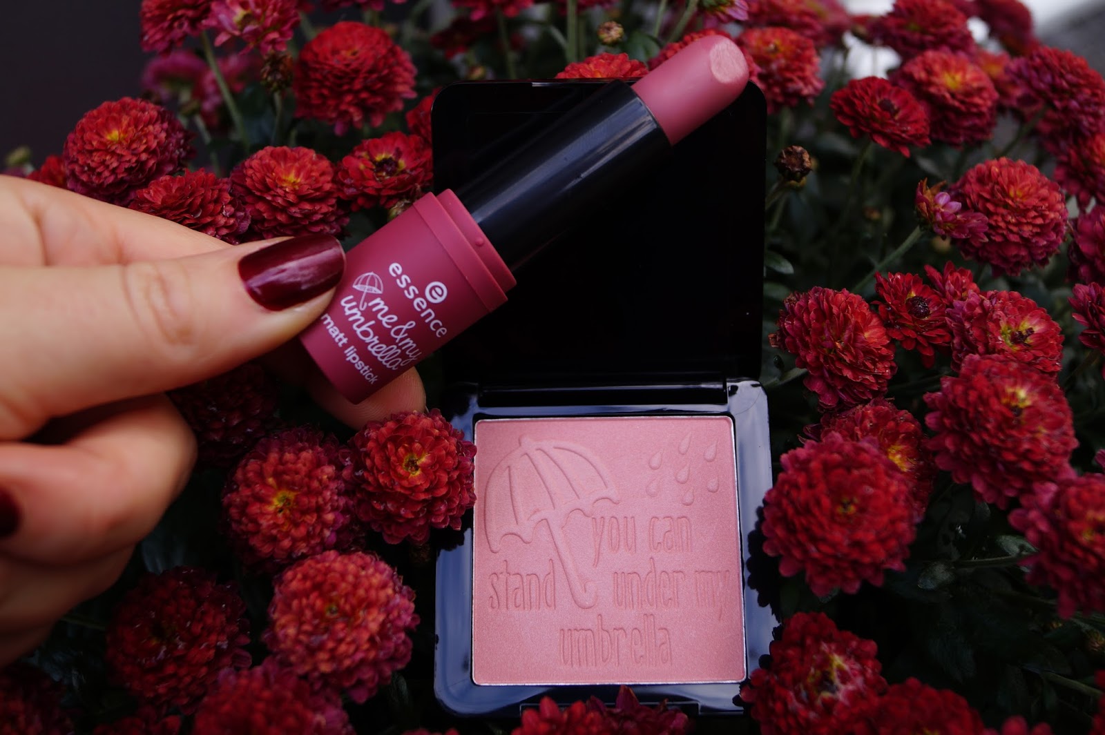 The Essence Trend Edition of October „me & my umbrella“ had two products I liked a lot. The matte lípstick in 02 I love rainy days and the 01 you can stand under my umbrella blush. Both are Rosewood shades I am currently craving every product for. So this wasn´t a coincidence.