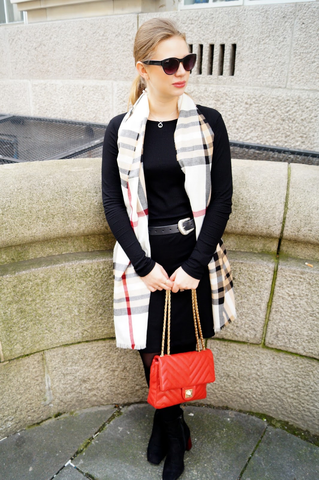London Outfit – Black midi dress / checkered scarf / double buckle western belt….