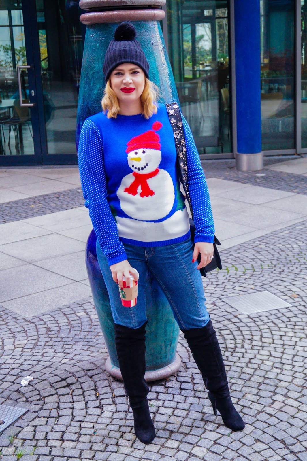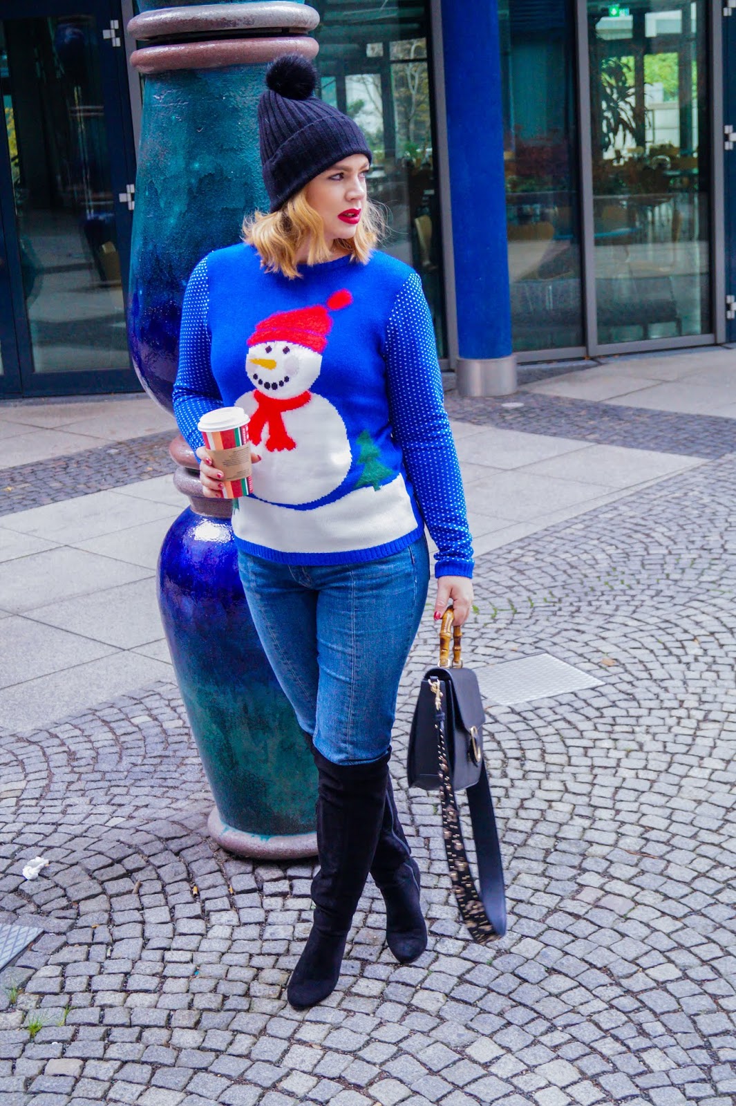 sweater Galeria Kaufhof sold out similar here, here and here / denim H&M old similar here and here / overknee boots last season similar here / pom pom beanie Asos sold out similar here and here / lips Blazing Yule by MAC / bamboo handle bag Mango sold out similar here