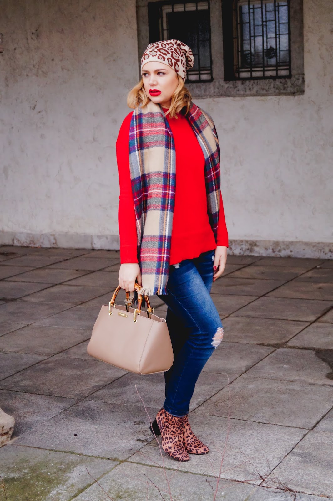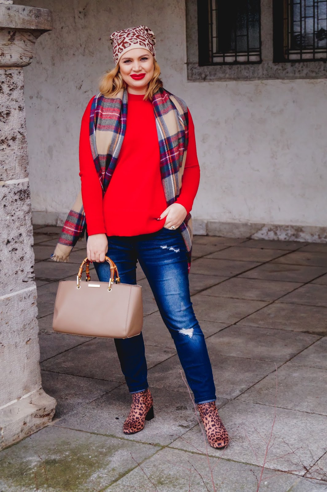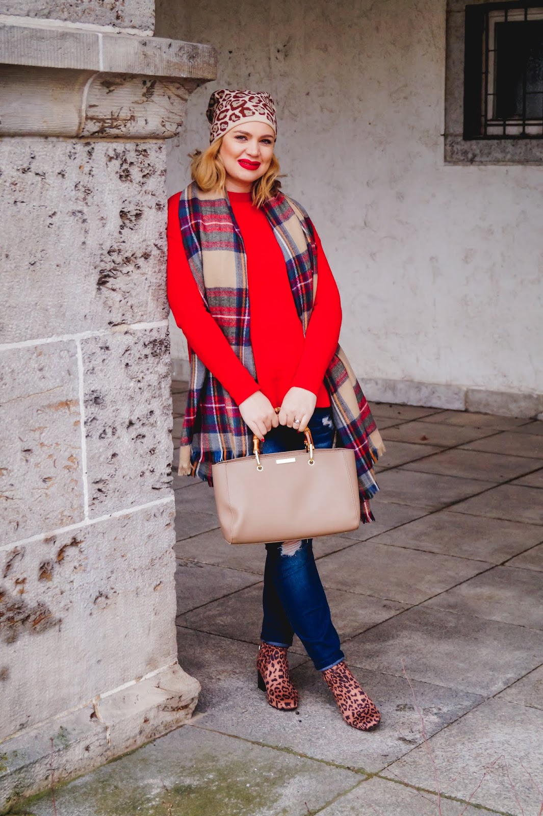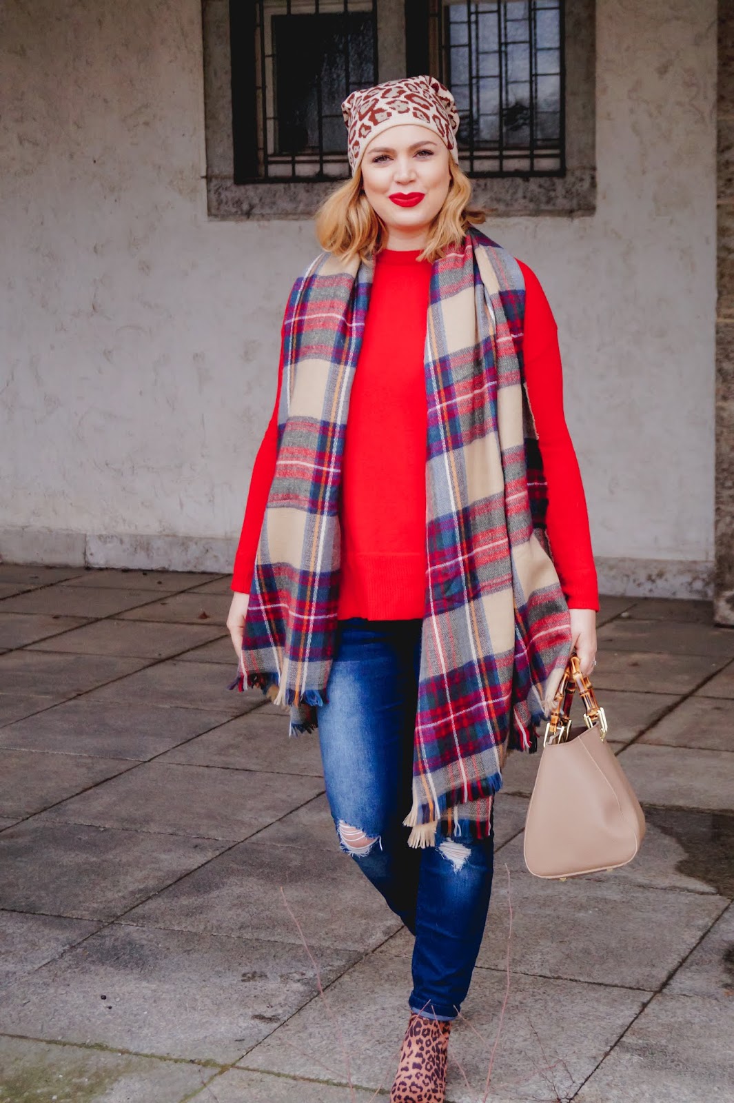 red pullover H&M old similar here and here / leopard print booties New Look sold out similar here and here / plaid scarf old similar here and here / Katie Loxton hand bag similar here and here / leopard print beanie similar here and here / lips MAC Red