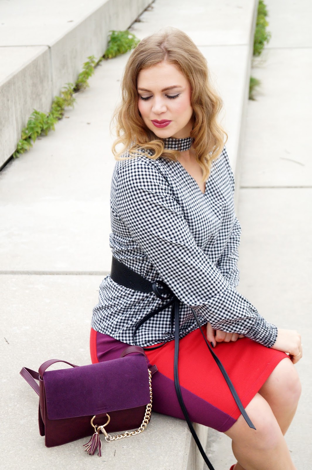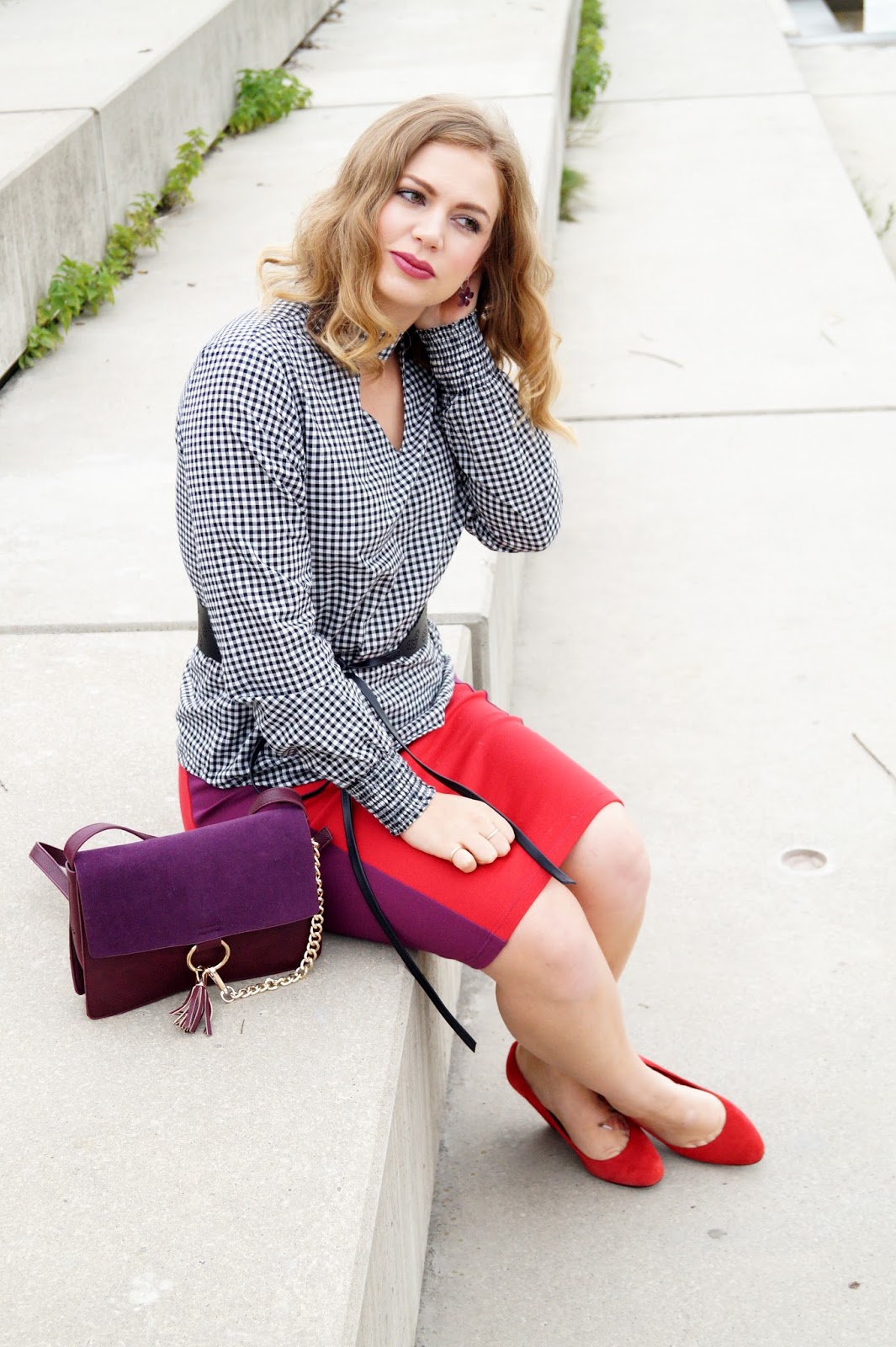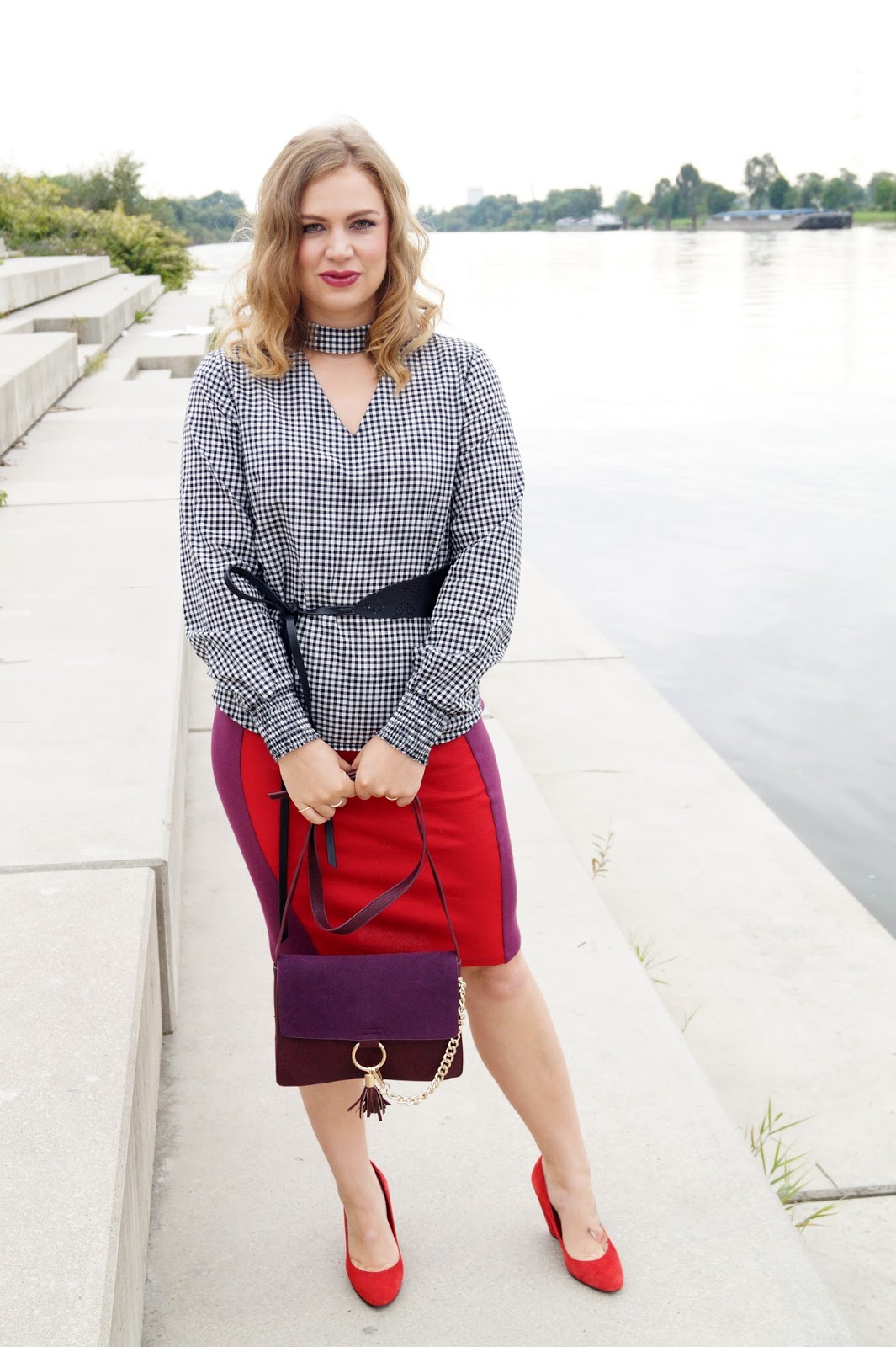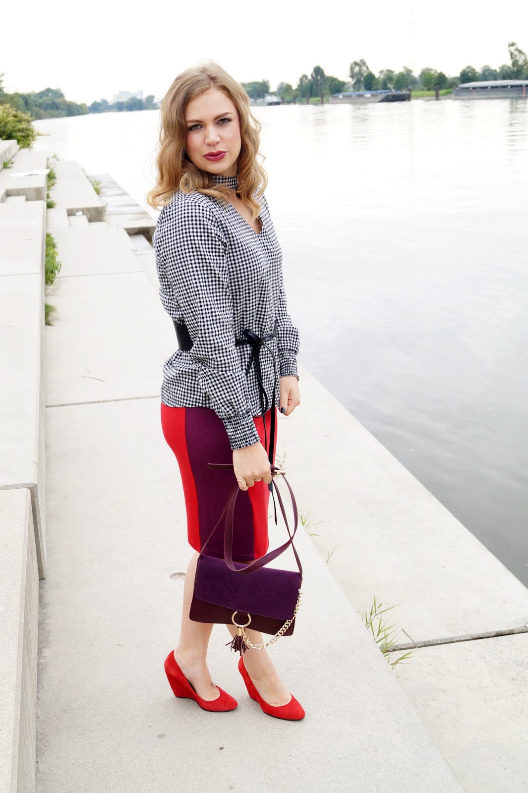 Date night style for under 100 €/$ – Gingham keyhole blouse / color blocking skirt / designer bag dupe….