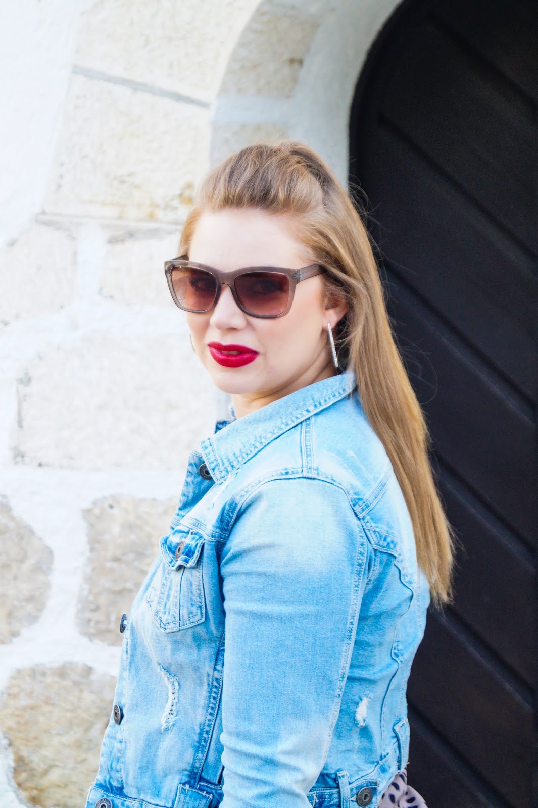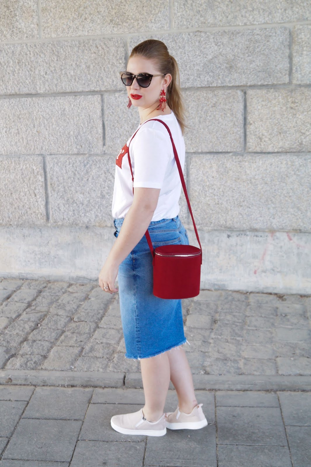 Exactly. It includes red and so I am able to pair it with my favorite lipstick. To go on with the pops of red I also added a pair of statement earrings to the look and my red suede crossbody bag. I personally love that it has the shape of the old leather bags where you could carry your binocular around.