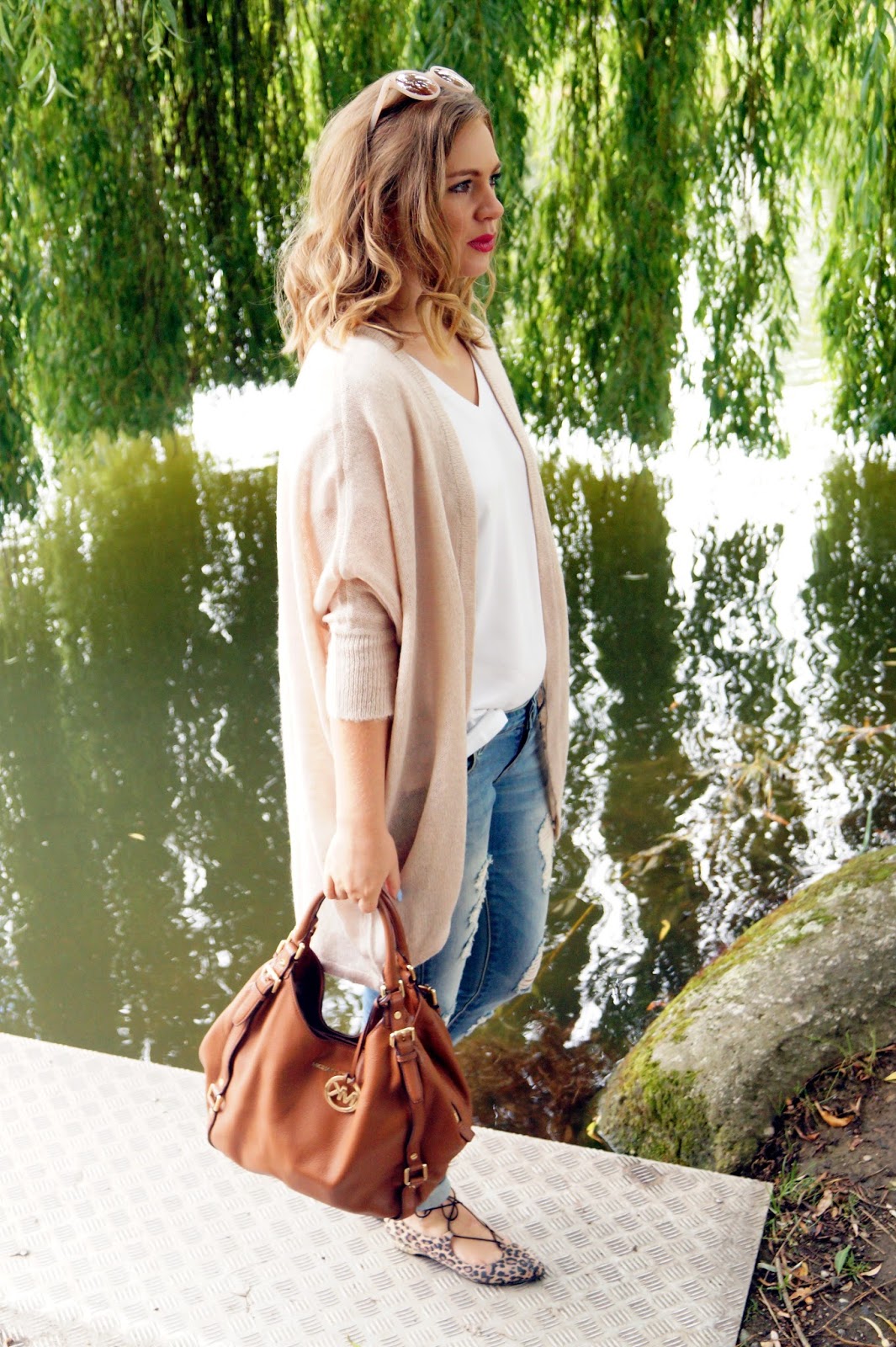 For this look I took a basic white tee and paired it with a pair of distressed, light blue boyfriend jeans. Since it is chilly in the mornings I added a cardigan in a creamy color. The pair of leopard print lace-up flats and the Michael Kors Bedford shopper in this rich cognac brown color complement the whole look.