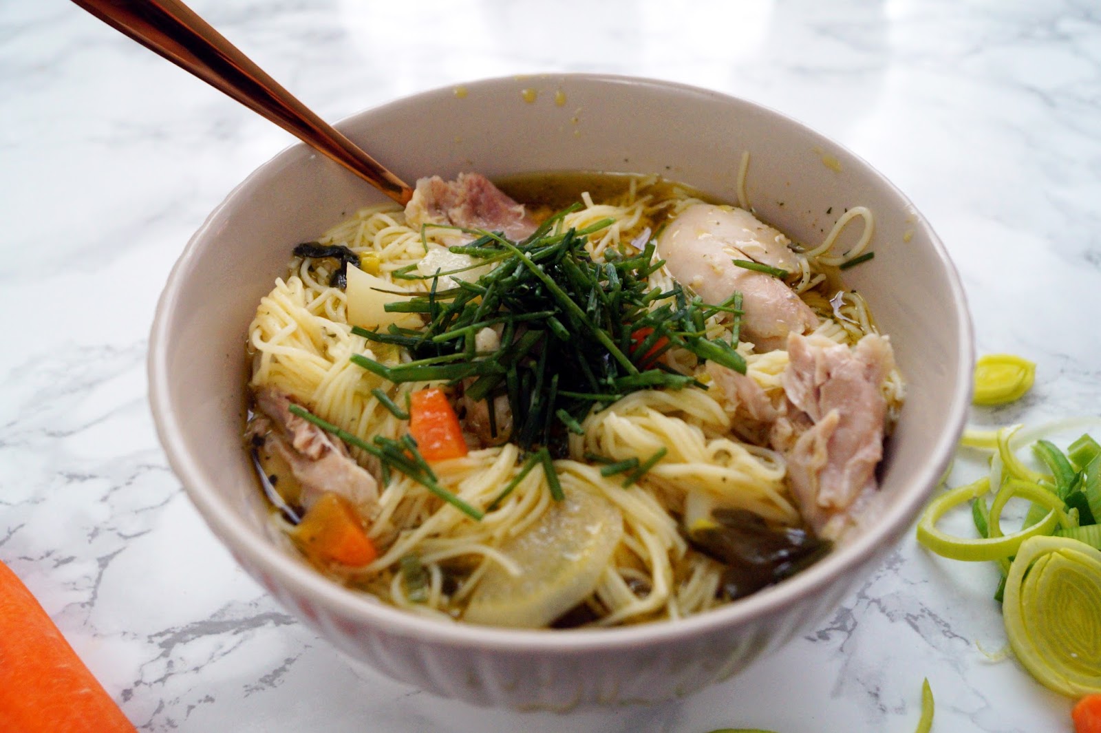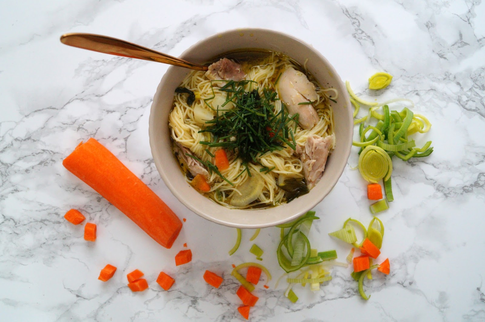 A healthy chicken noodle soup. This kind of soup is supposed to keep you healthy or to help you get on your feet again.