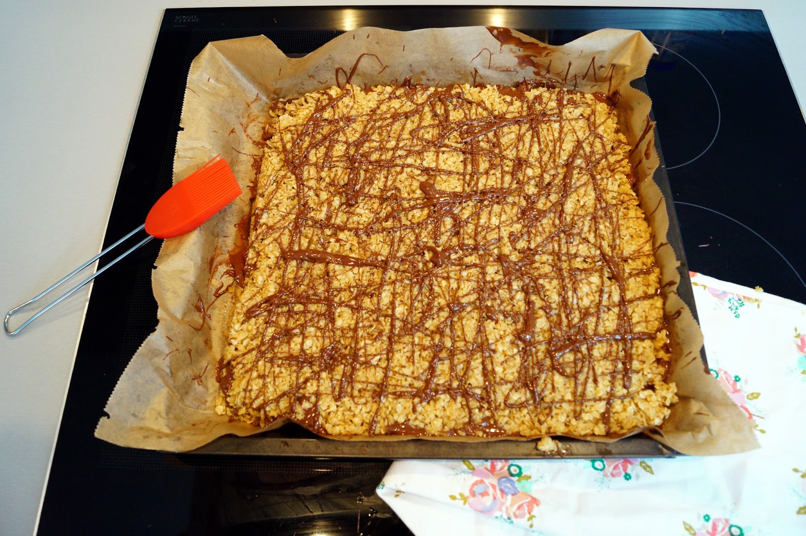 ^spread the chocolate batter evenly onto your oats on the baking sheet^