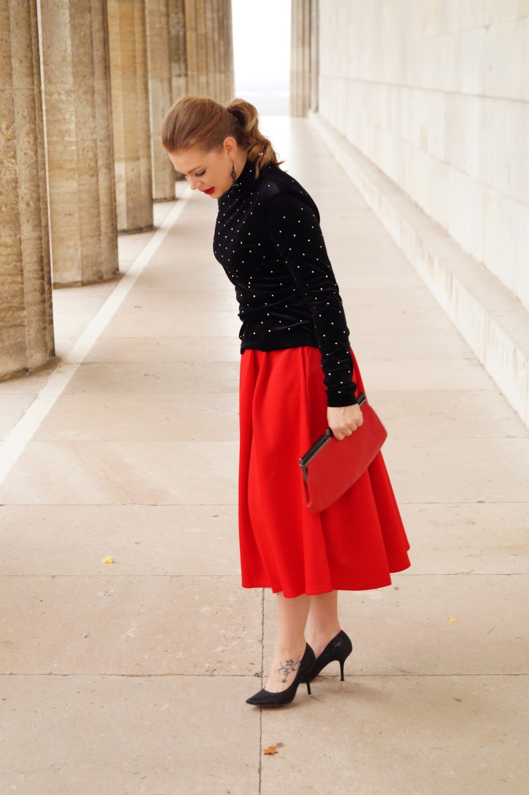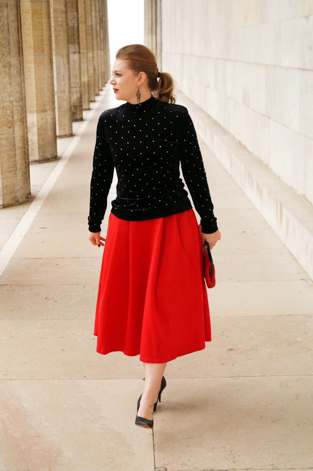 red is the perfect holiday color for me and if it is also yours you can maybe relate to the fact how happy I was about finding this beautiful red skirt (from SheIn) which was way more than affordable. It is under 30 € and perfect for Christmas. The a-line style in a midi lenght is just gorgeous. I really love it.