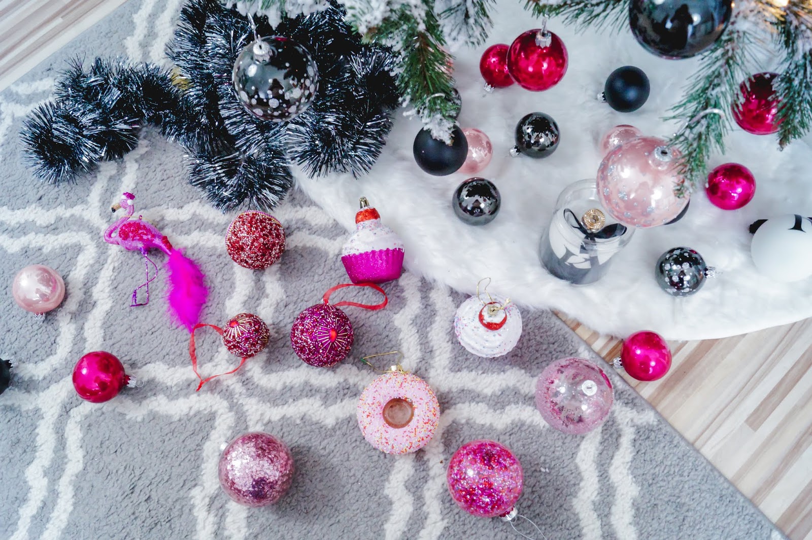 The pink, blush and black ornaments are our classic shaped ornaments on the tree. I got them in a medium and large size to mix and match as I like. I like different size ornaments a lot, also matte and glossy are great to get add texture and deepth to your tree.