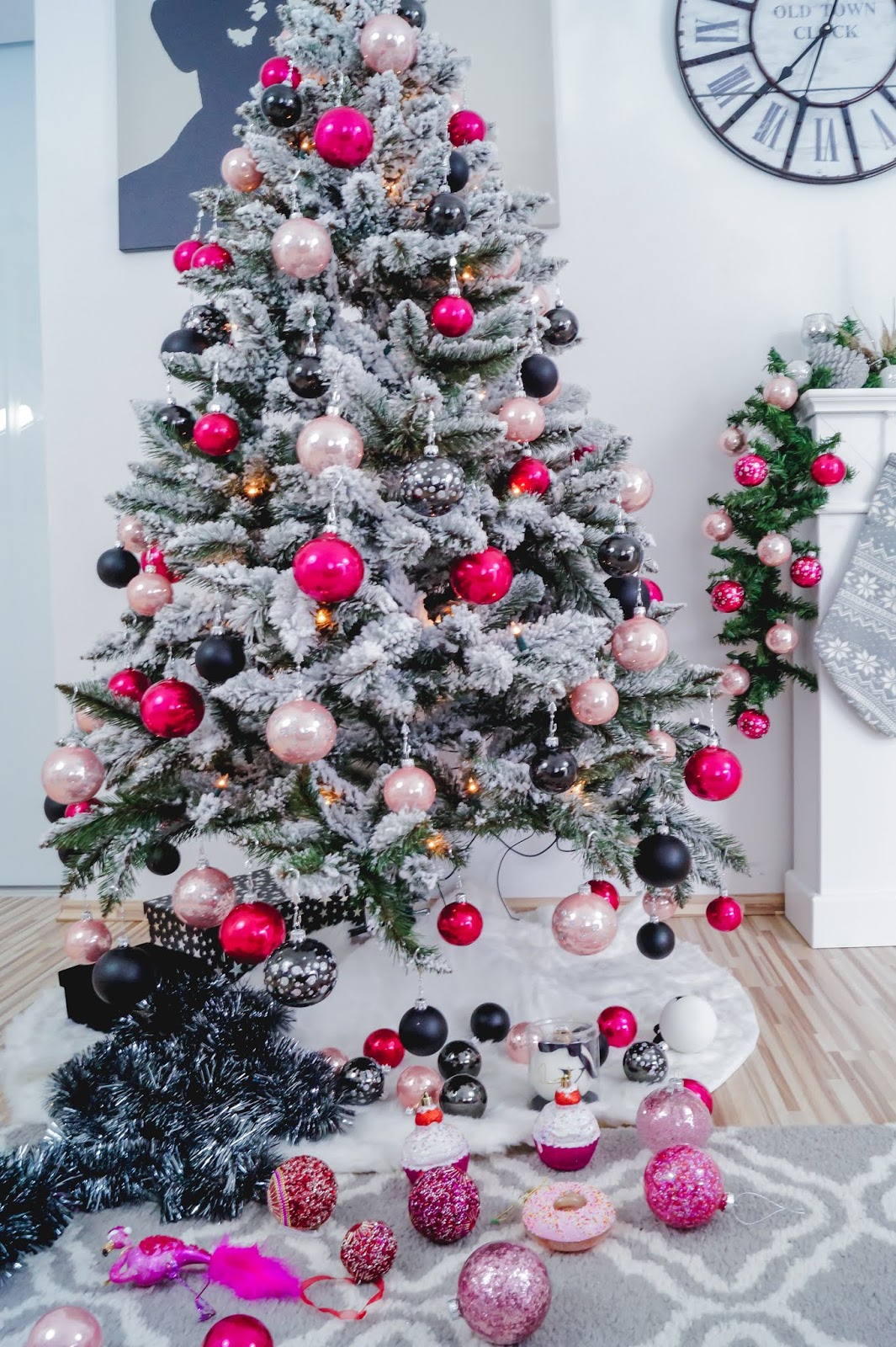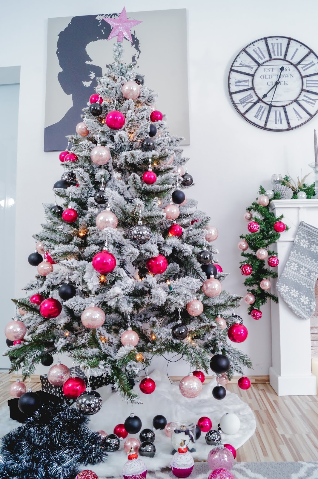 Of course our family room is the most used place in the whole house so this is where most of the magic happens. I do have a different color theme every year and usually I am not straying far aside from the classics but I have gone wild this year and went with a totally fashionable Christmas tree in pink and black. Yes you hear that right but if you are a regular reader you already read my Christmas tree decoration post last week and are no further surprised.