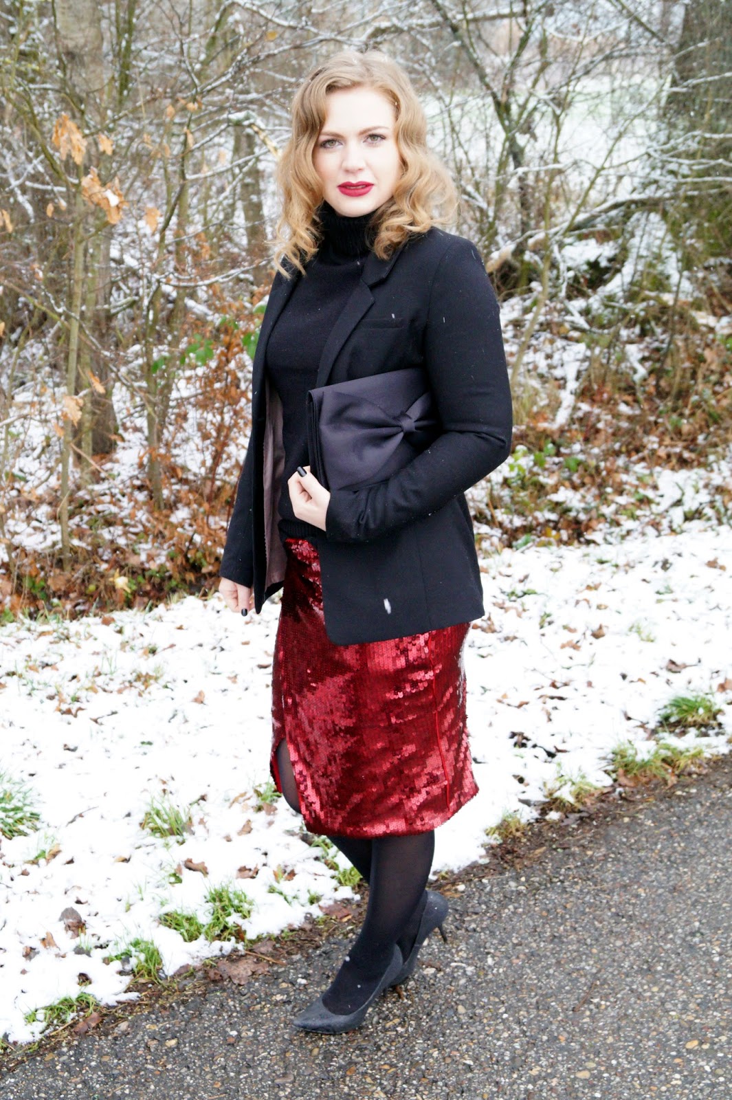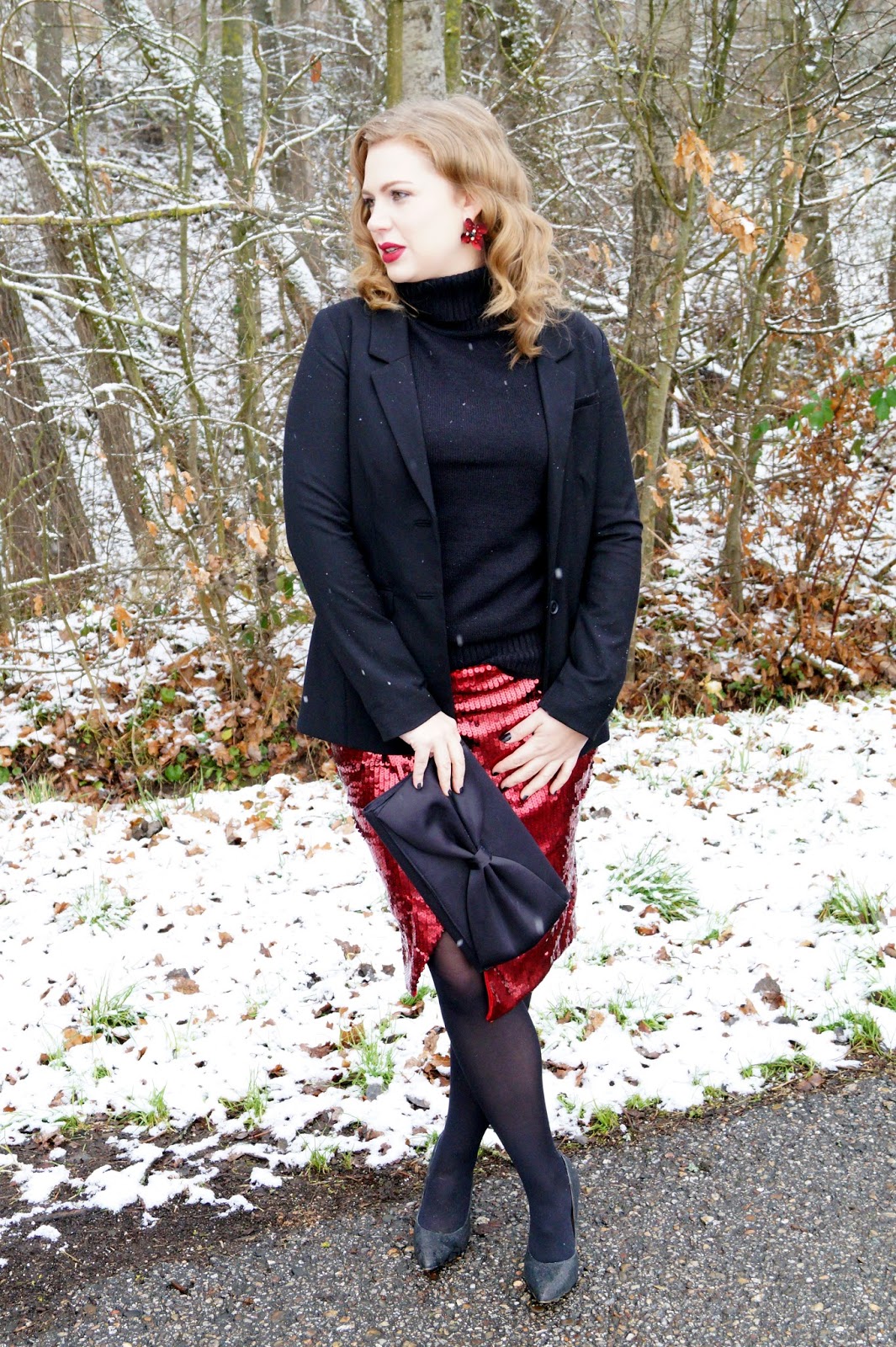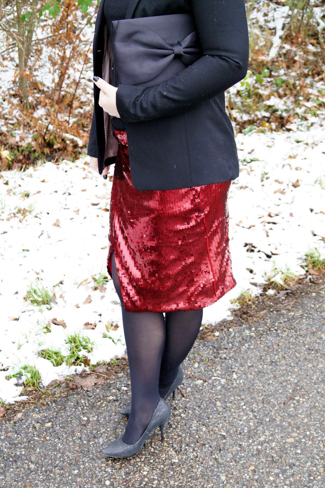 Holiday look – red sequin skirt, bow clutch and sparkly pumps….