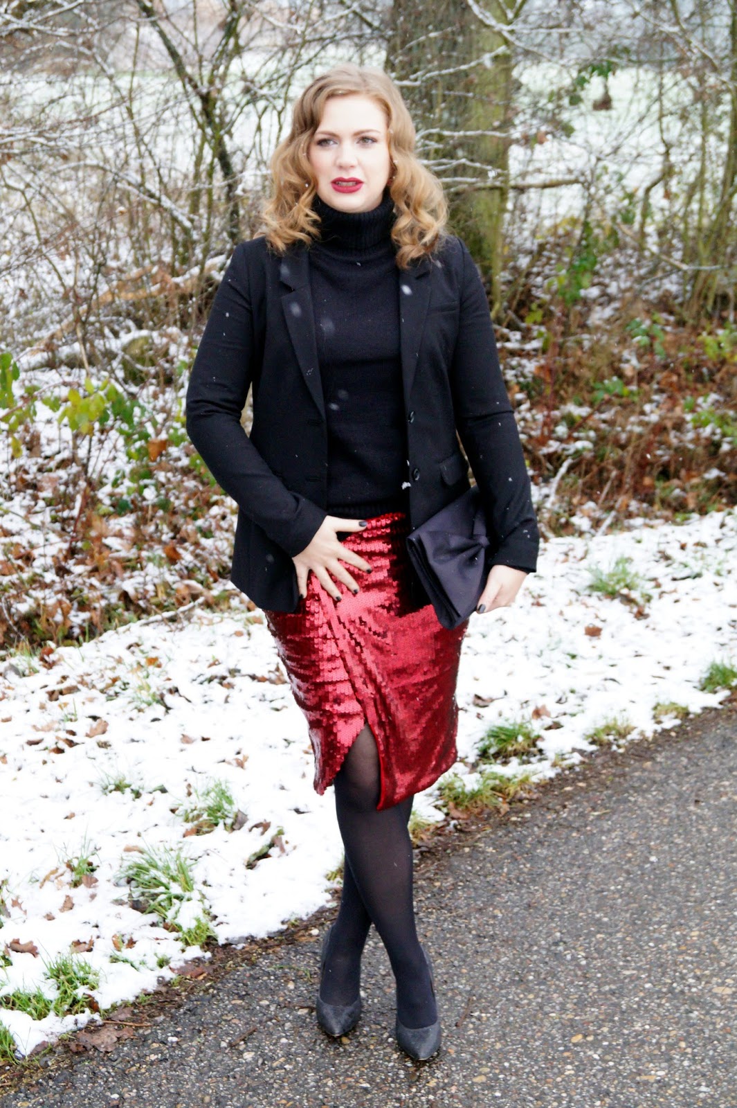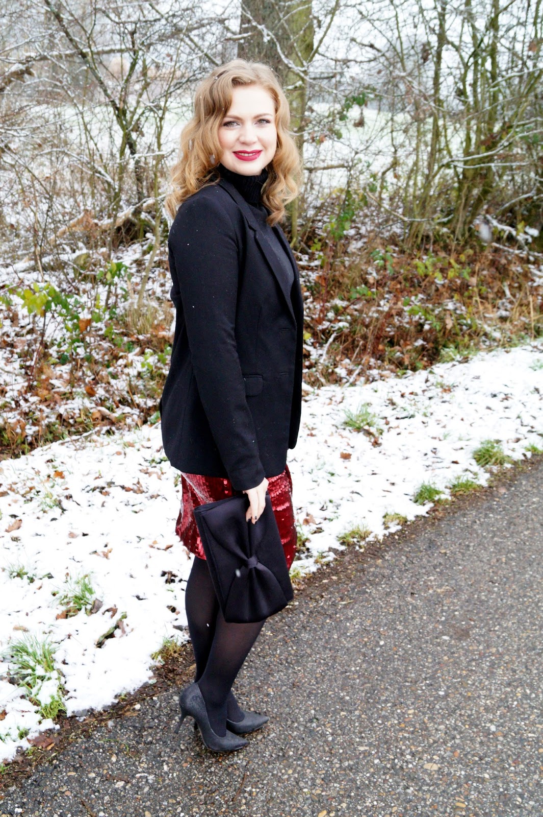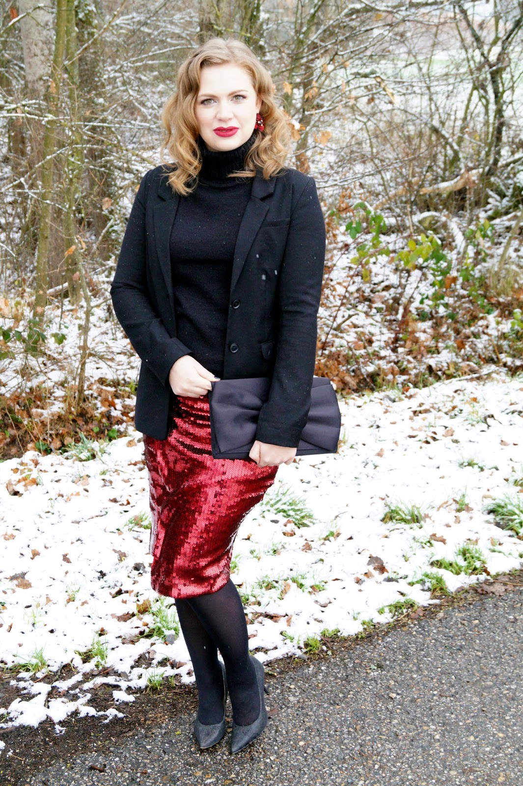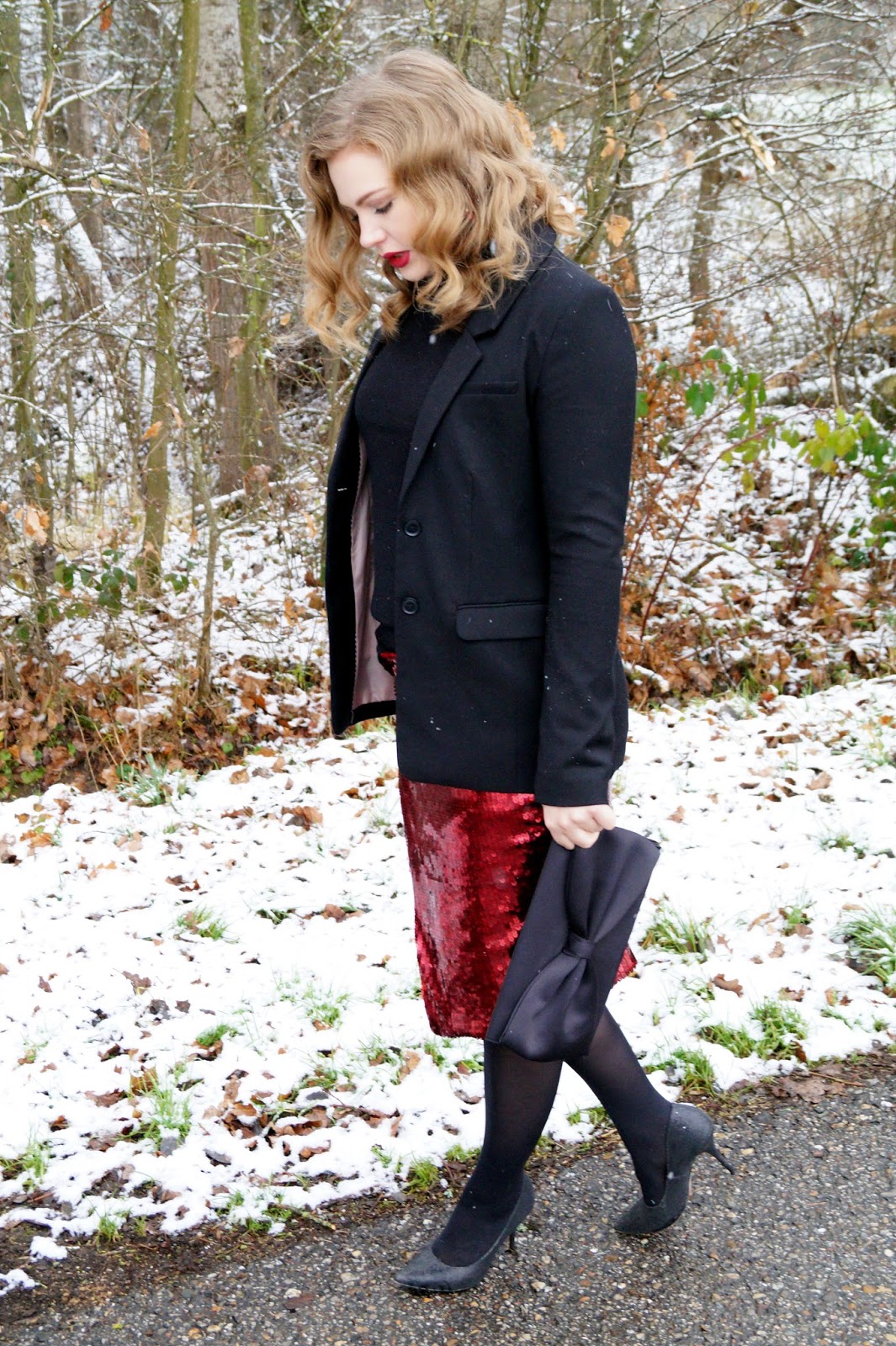 Holiday look – red sequin skirt, bow clutch and sparkly pumps….