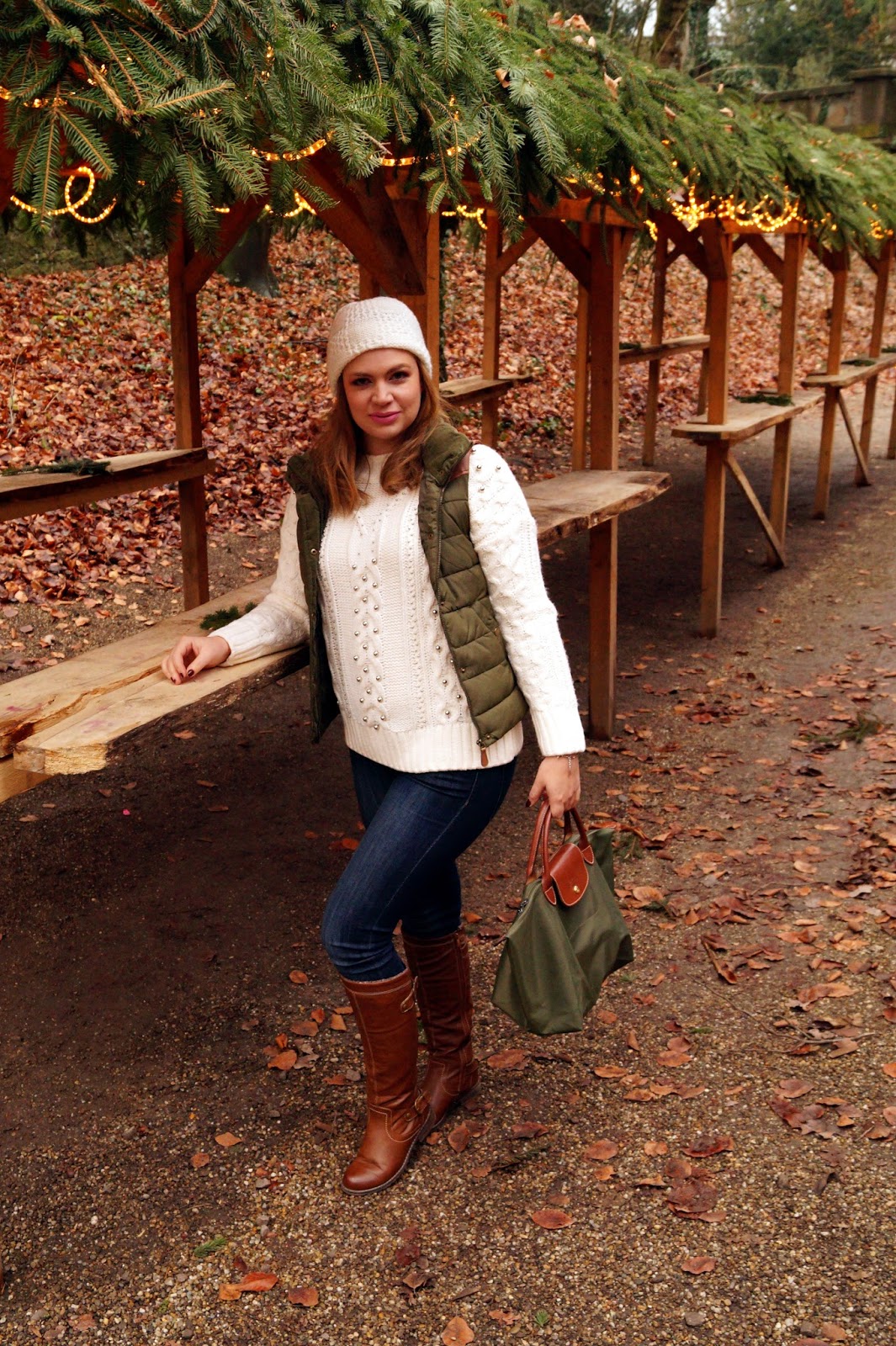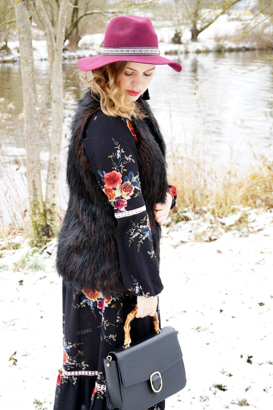 I opted for a long and flowy dress – the empire waist floral print maxi dress was perfect – so I could easily wear a pair of leggins and a shirt underneath. The faux fur vest also helped a lot cause it is pretty thick and keeps you warm around your back and waist. The boots I have worn underneath helped to keep my feet warm and the hat protected my head from the snow ( you could easily change the hat into a beanie).