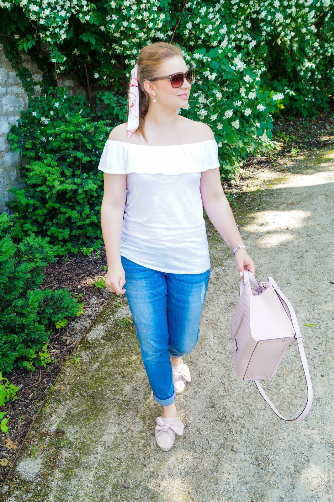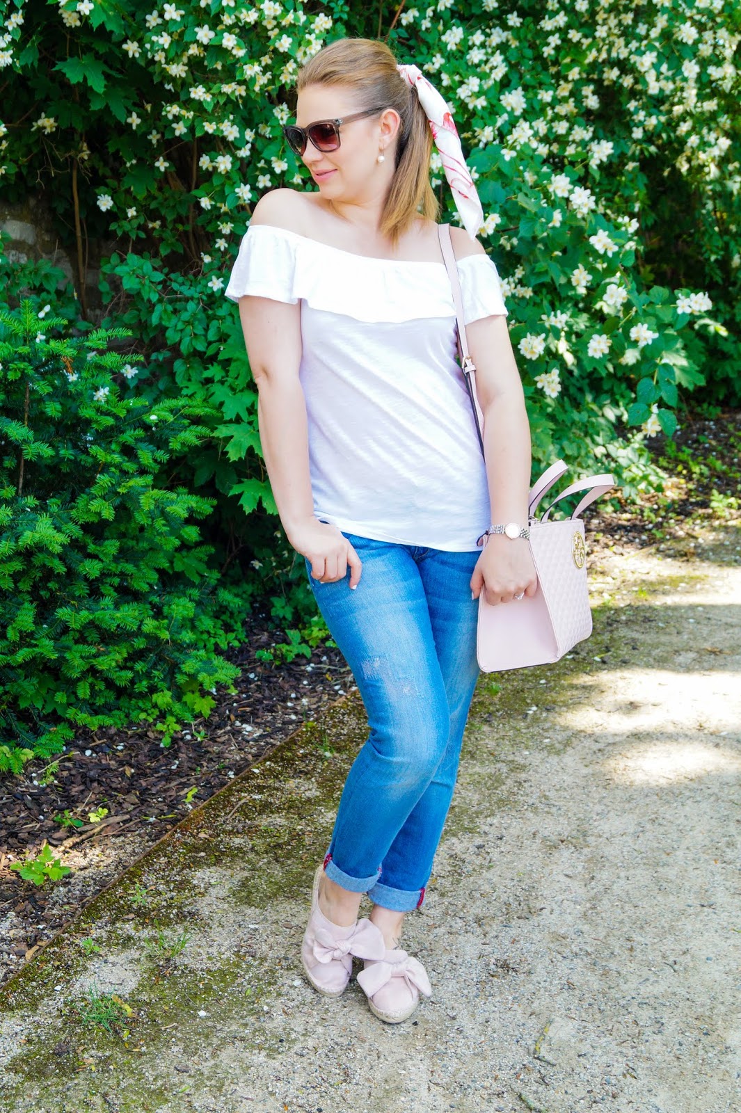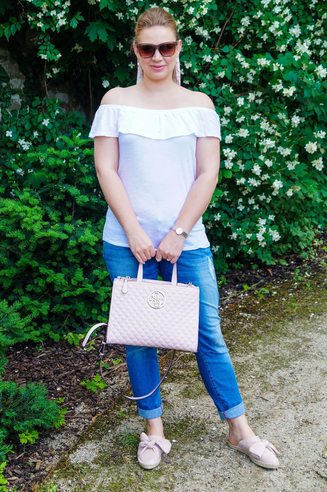 off-shoulder shirt old similar here and here / Guess hand bag sold out similar here and here / jeans Mango old similar here and here / mules Esmara similar here and here / earrings Bjou Brigitte old similar here and here / hair tie sold out similar here and here