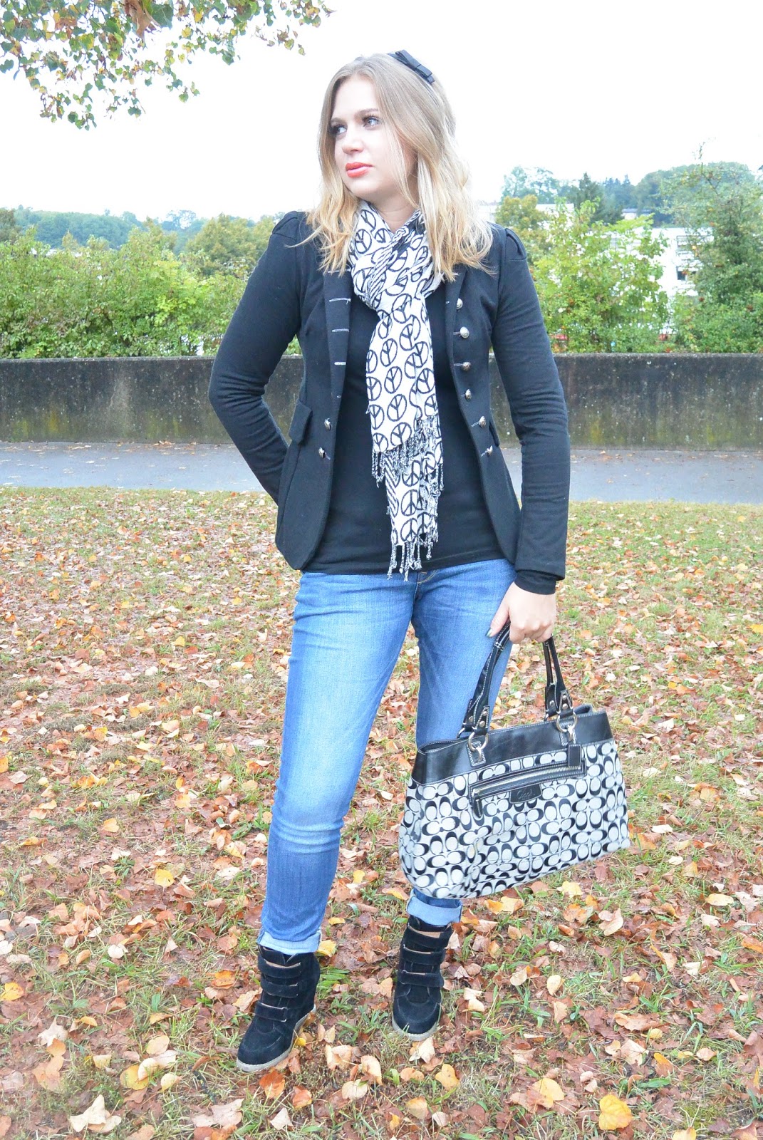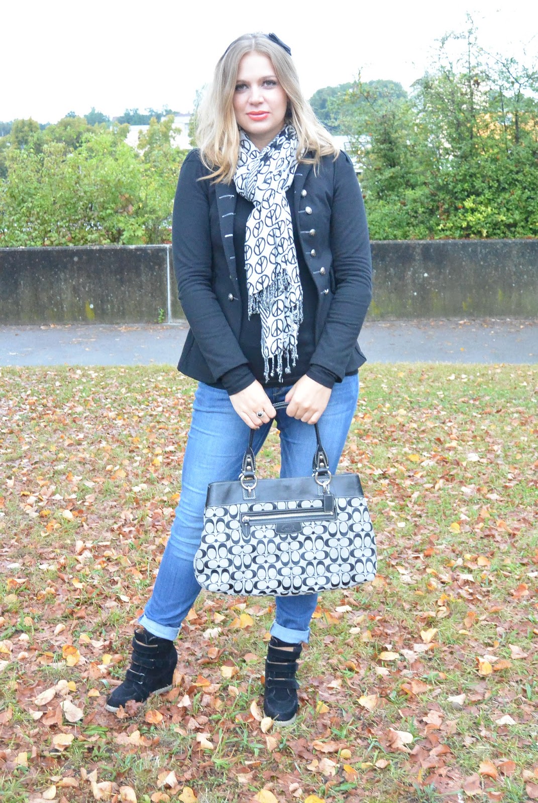 This jacket became one of my favorites. I like the uniform style with the buttons and that it has a longer back. Paired it with a pair of jeans and a casual black shirt. Took a black and white scarf covered with lots of peace signs to get some color and black wegde sneakers.