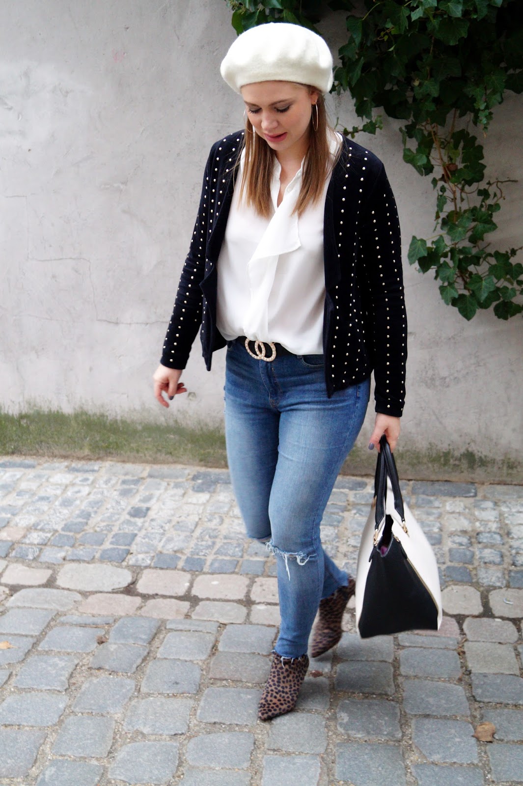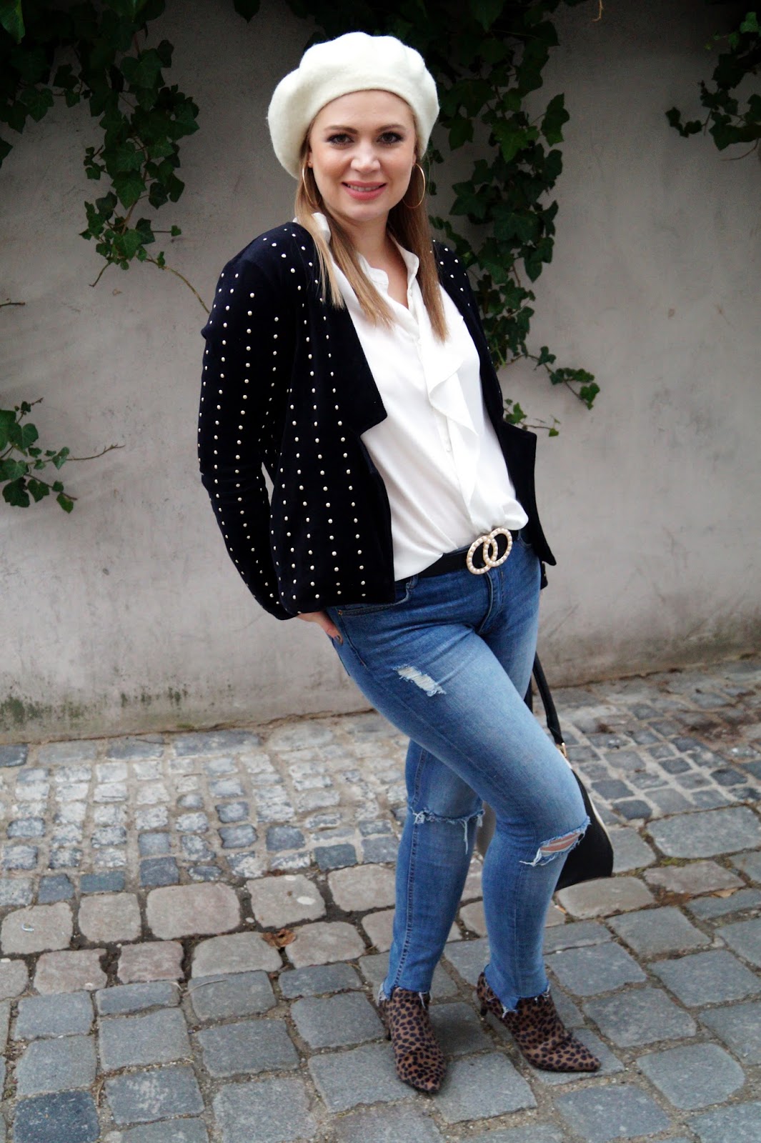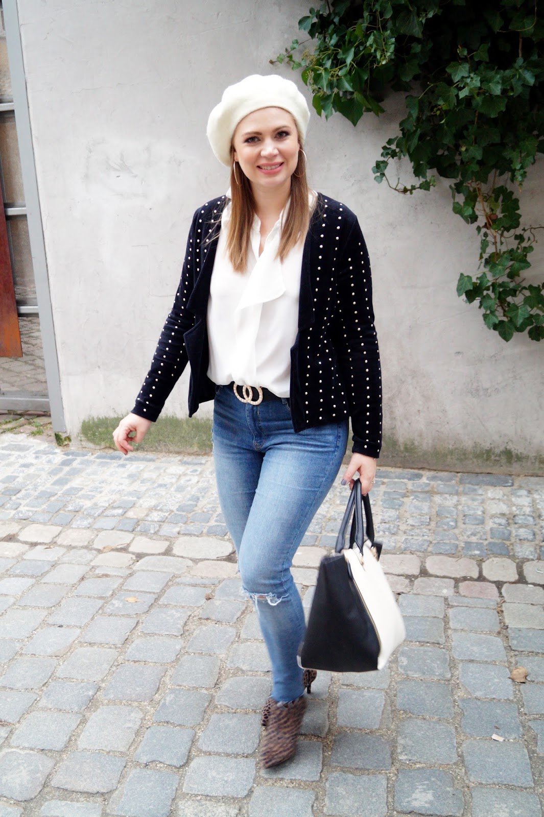 beret Asos / velvet blazer Only old similar here / bag bonprix old similar here and here / booties H&M sold out similar here and here / denim H&M old similar here and here / belt Asos / white ruffle shirt H&M old similar here and here / gold hoops here