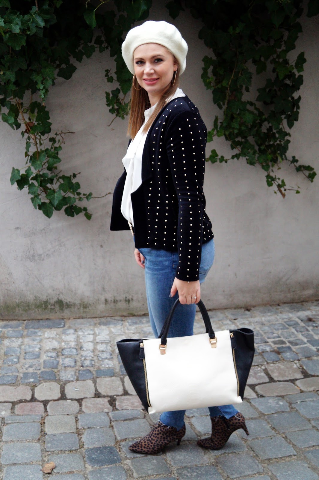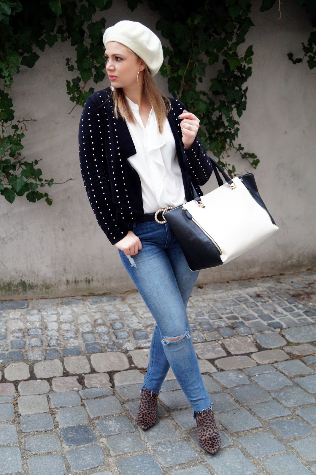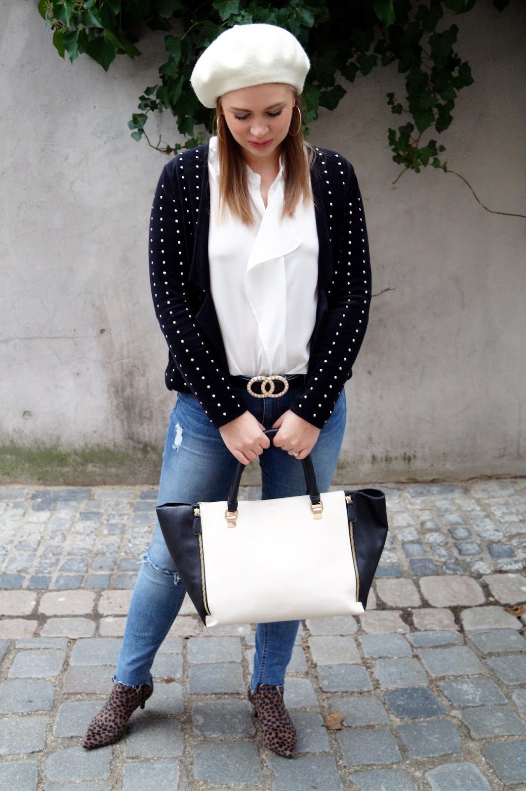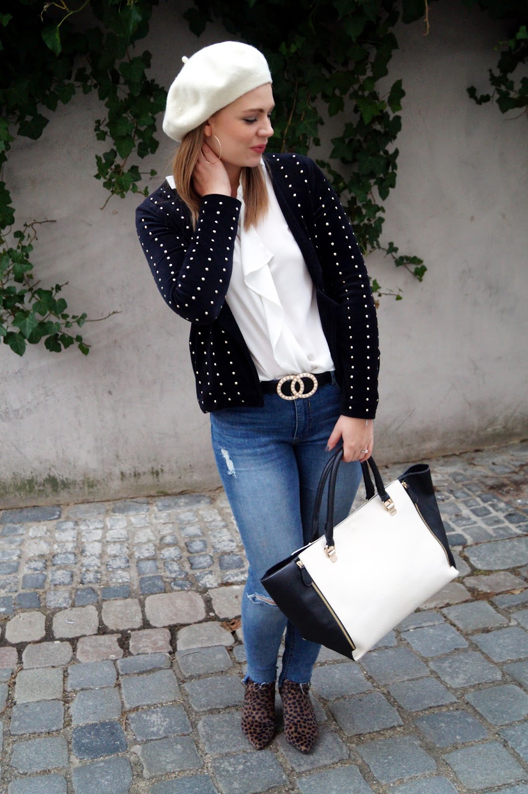 beret Asos / velvet blazer Only old similar here / bag bonprix old similar here and here / booties H&M sold out similar here and here / denim H&M old similar here and here / belt Asos / white ruffle shirt H&M old similar here and here / gold hoops here
