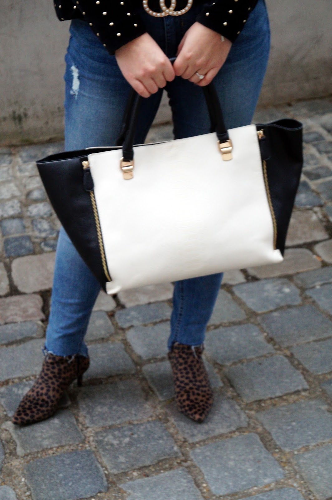 To keep the belt and the blazer jacket in the foreground I paired it with a pair of skinny jeans and a simple white ruffle blouse. The black and white bag matched the color theme perfectly and the leopard print booties added some twist to the look.