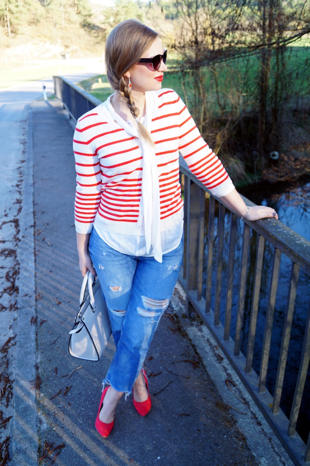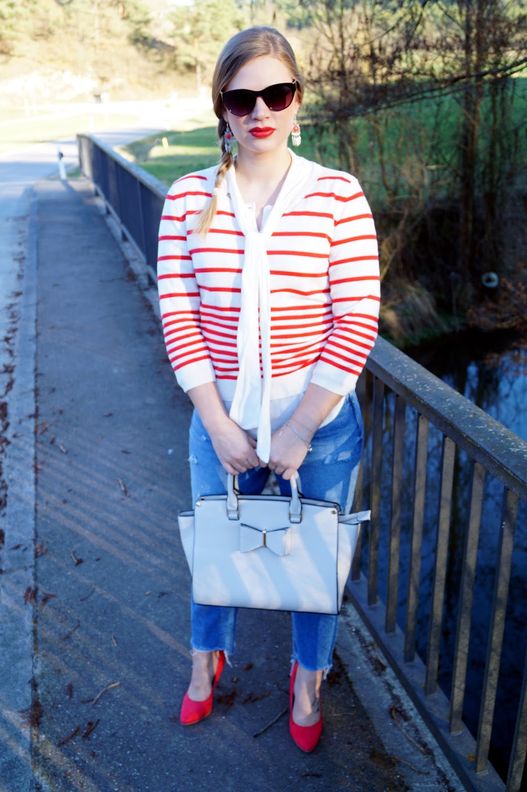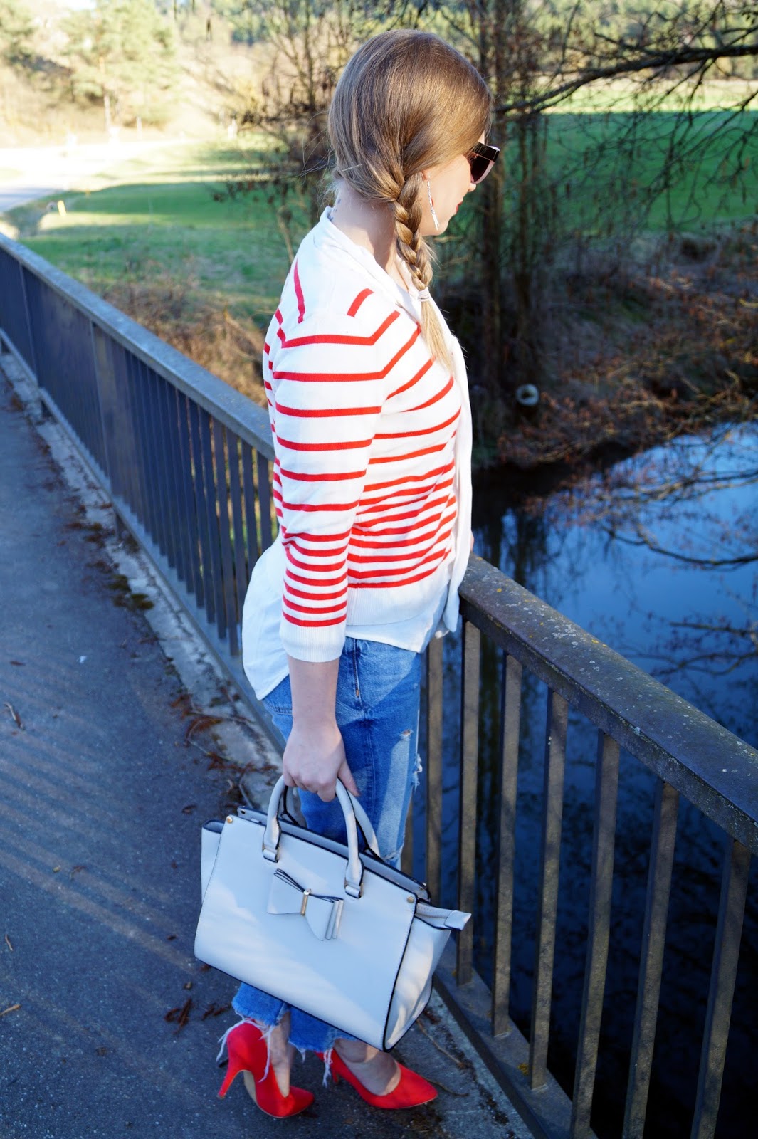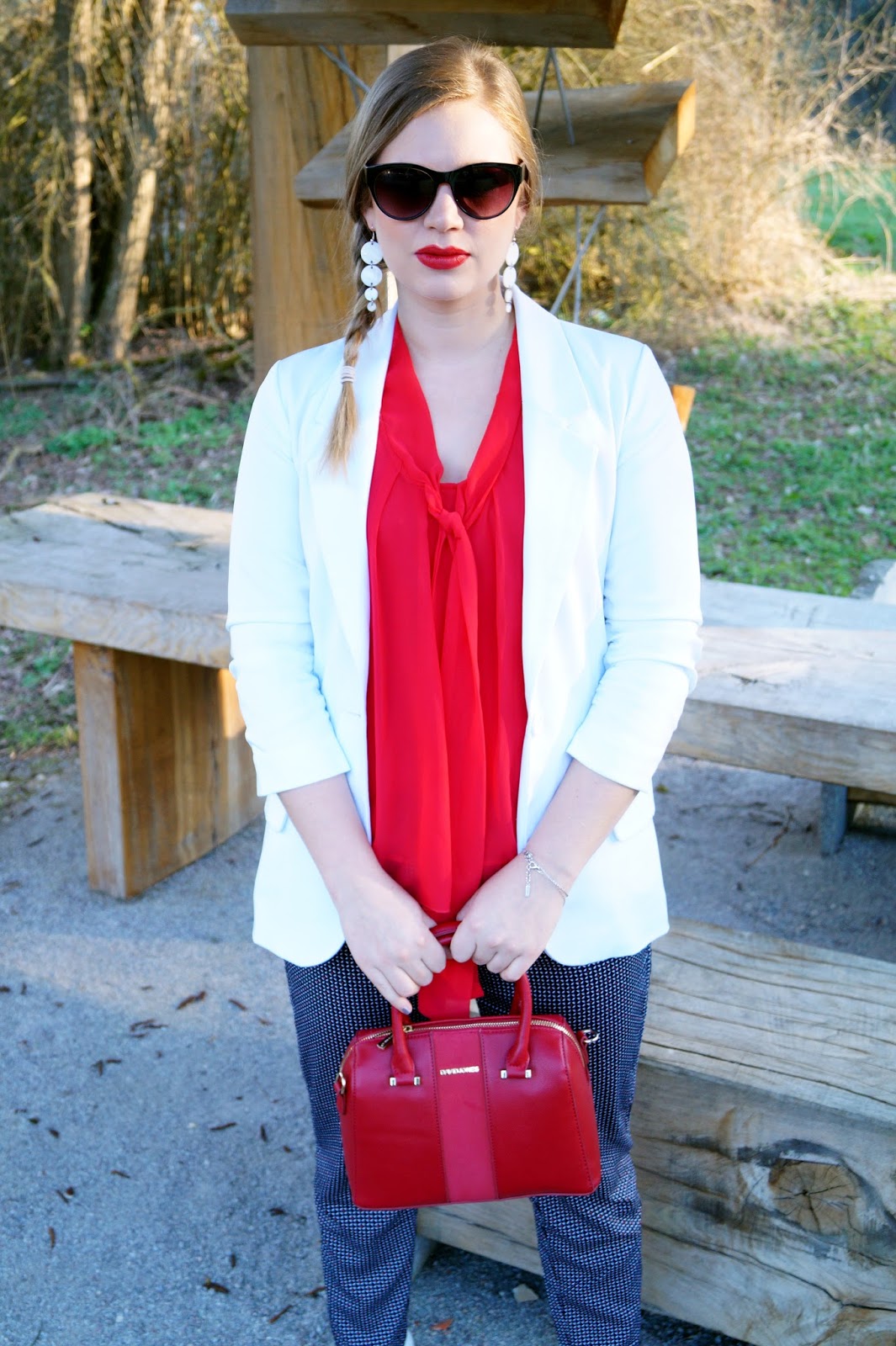 Seit es wärmer wird und ich weiß, dass ich das schon mindestens fünf Mal gesagt habe, aber wir durchleben hier ein auf und ab werden die Materialien meiner Kleidungsstücke auch dünner und luftiger. Jogger sind für dieses Wetter optimal. Meine sind von H&M und ich hätte nicht gedacht das es dort solch eine große Auswahl an verschiedenen Mustern und Farben gibt. Dazu getragen habe ich einen weißen Blazer – ein absolutes Basic Teil für mich – ein rotes Schluppenshirt um die Farbe aus dem Muster der Hose aufzugreifen und ein paar weißer Heels. Die Tasche und den Lippenstift habe ich noch zusätzlich aufeinander abgestimmt. Et voilà – der Sommer kann kommen.
