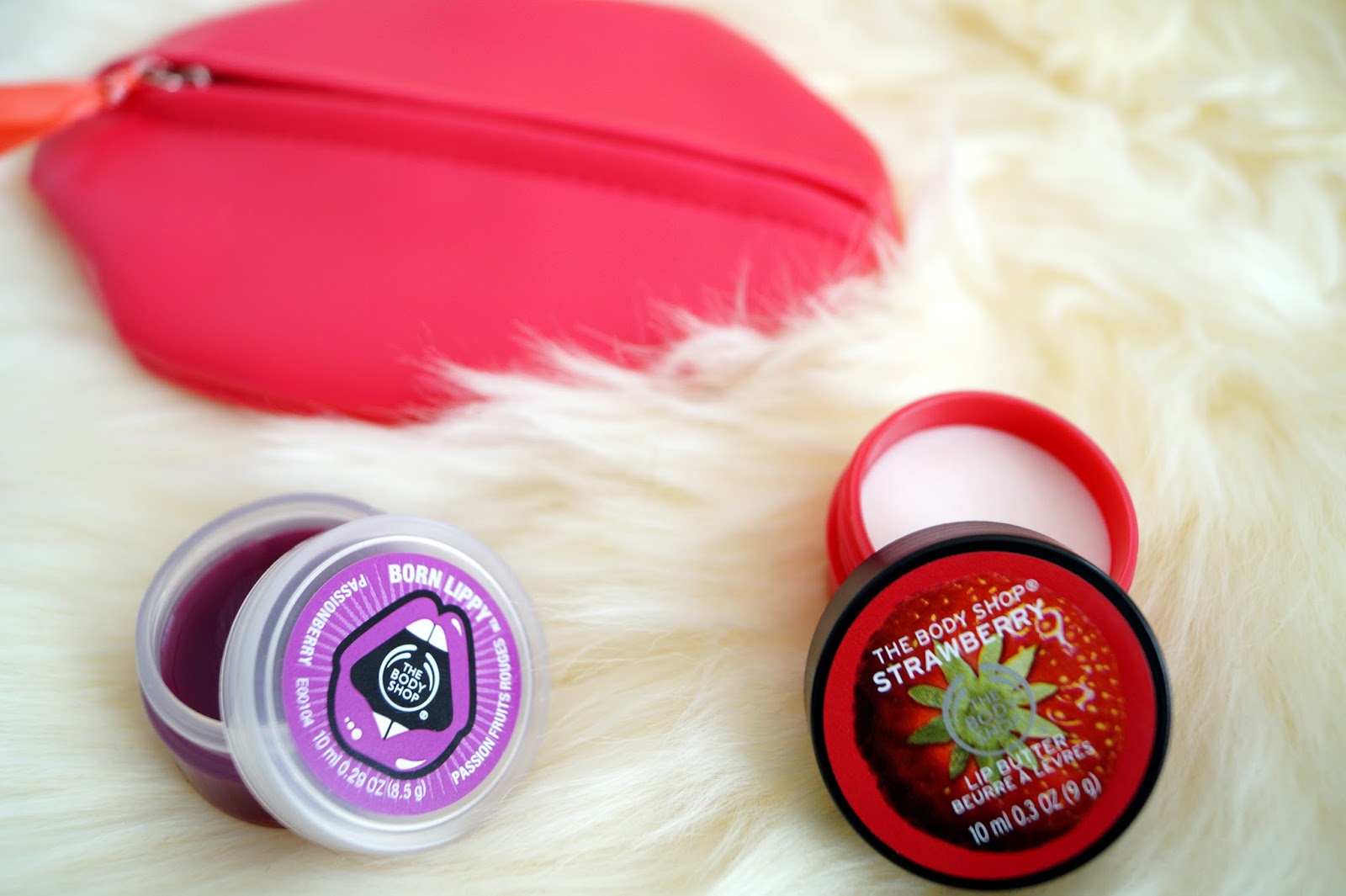 Bee natural pomegranate Burt´s Bees / Labello Caramel / Born Lippy Passionberry Body Shop / Lip Balm Strawberry Body Shop / Lip scrub stick Body Shop / Lib scrub Alverde
