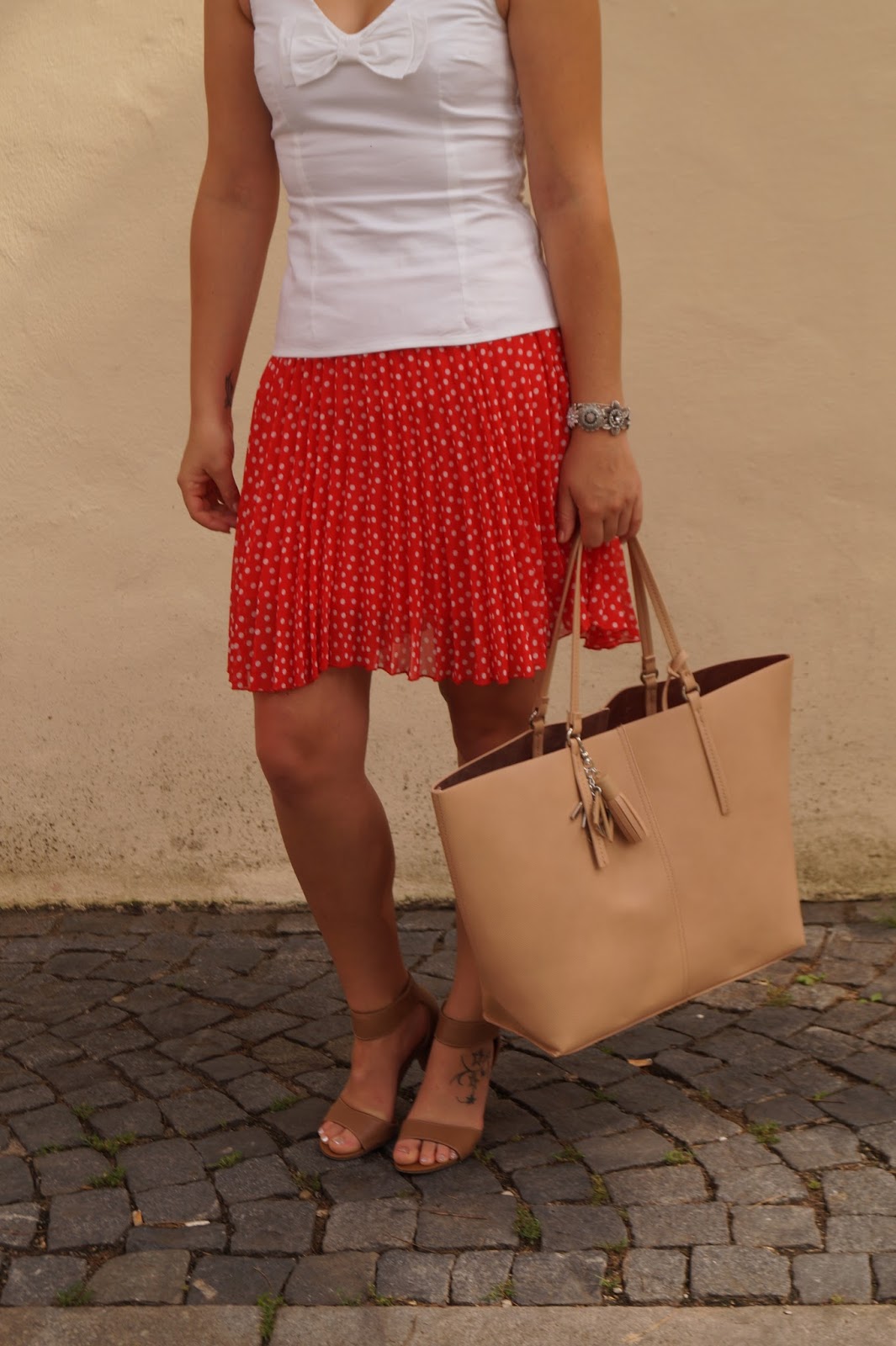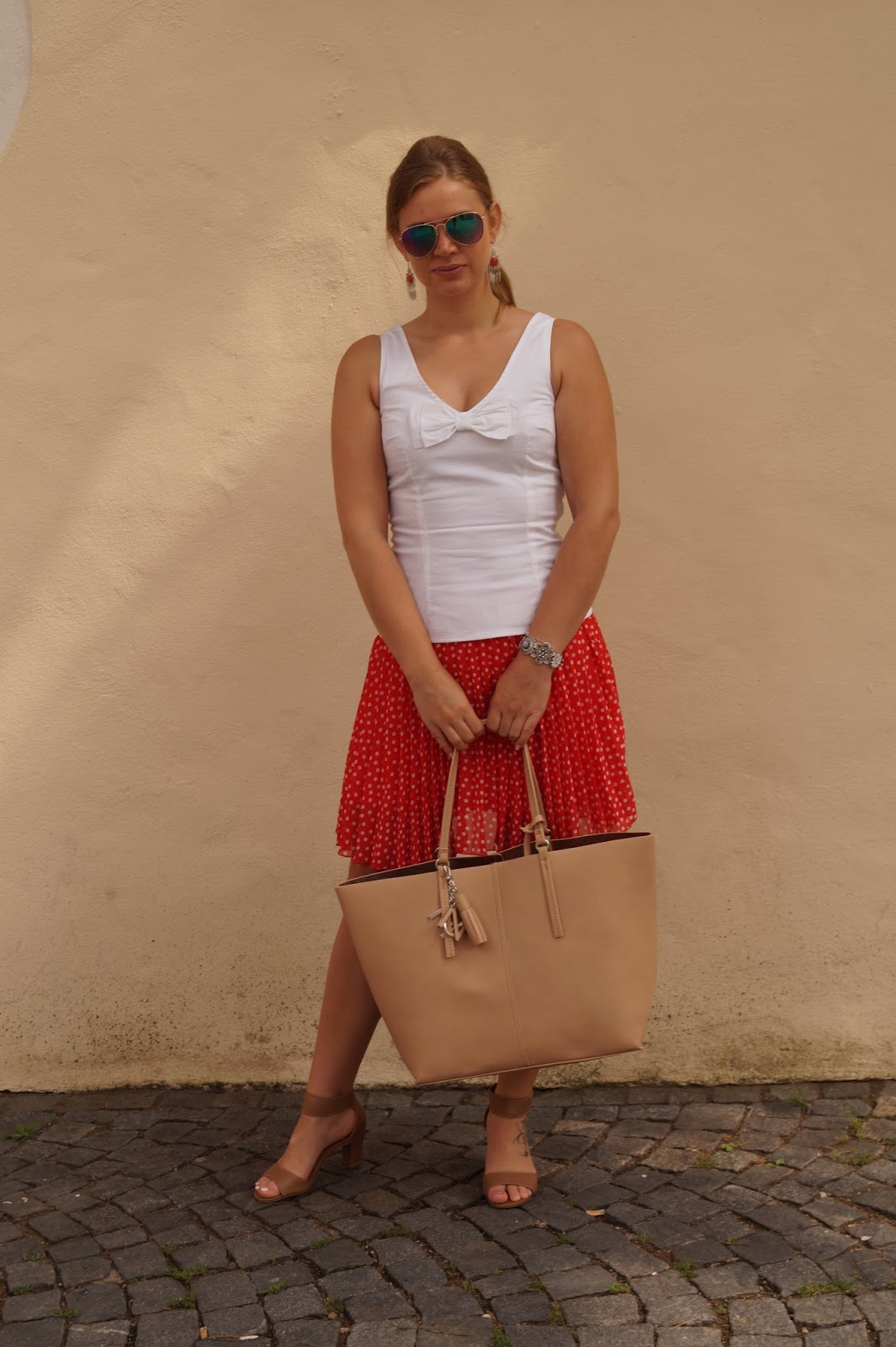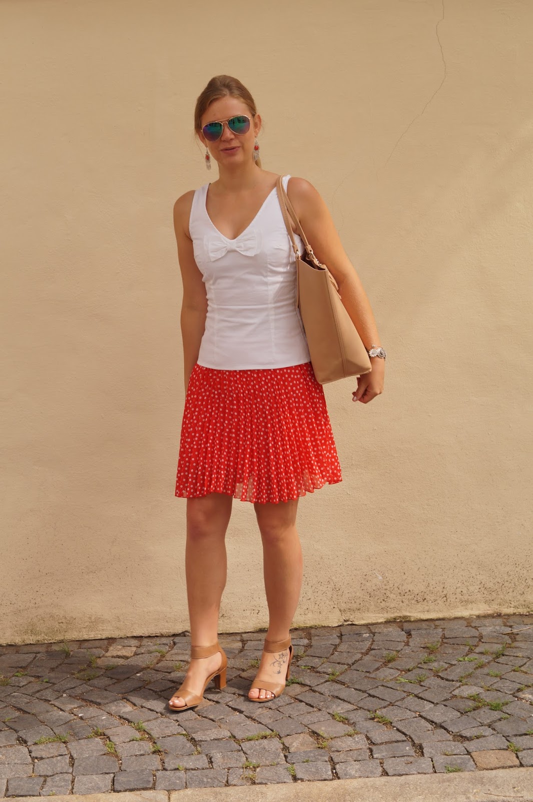 For this outfit (wore it for brunch and running some errands in the city) I paired a red polka dot skirt with a sleeveless blouse and a pair of nude sandals.