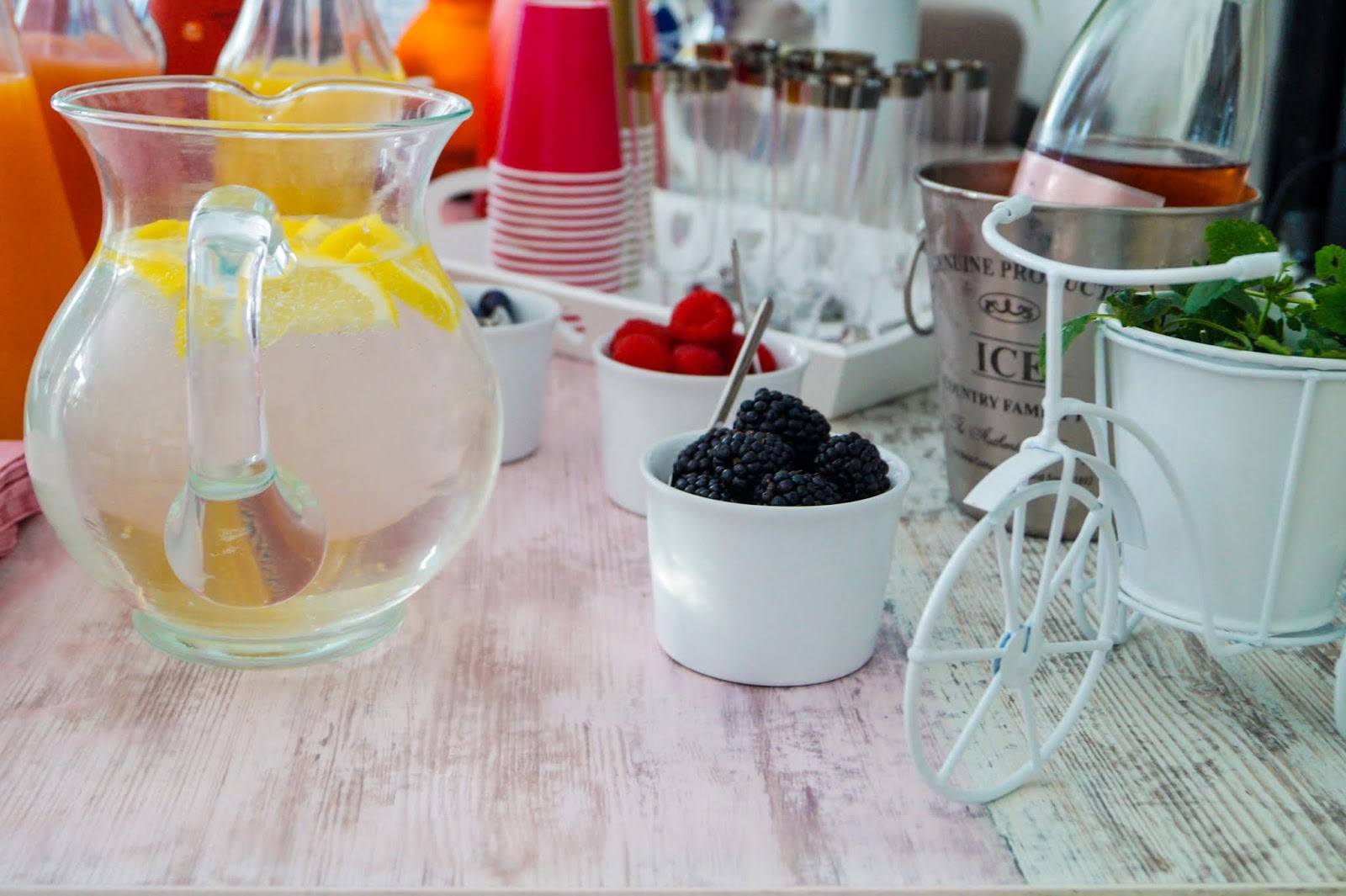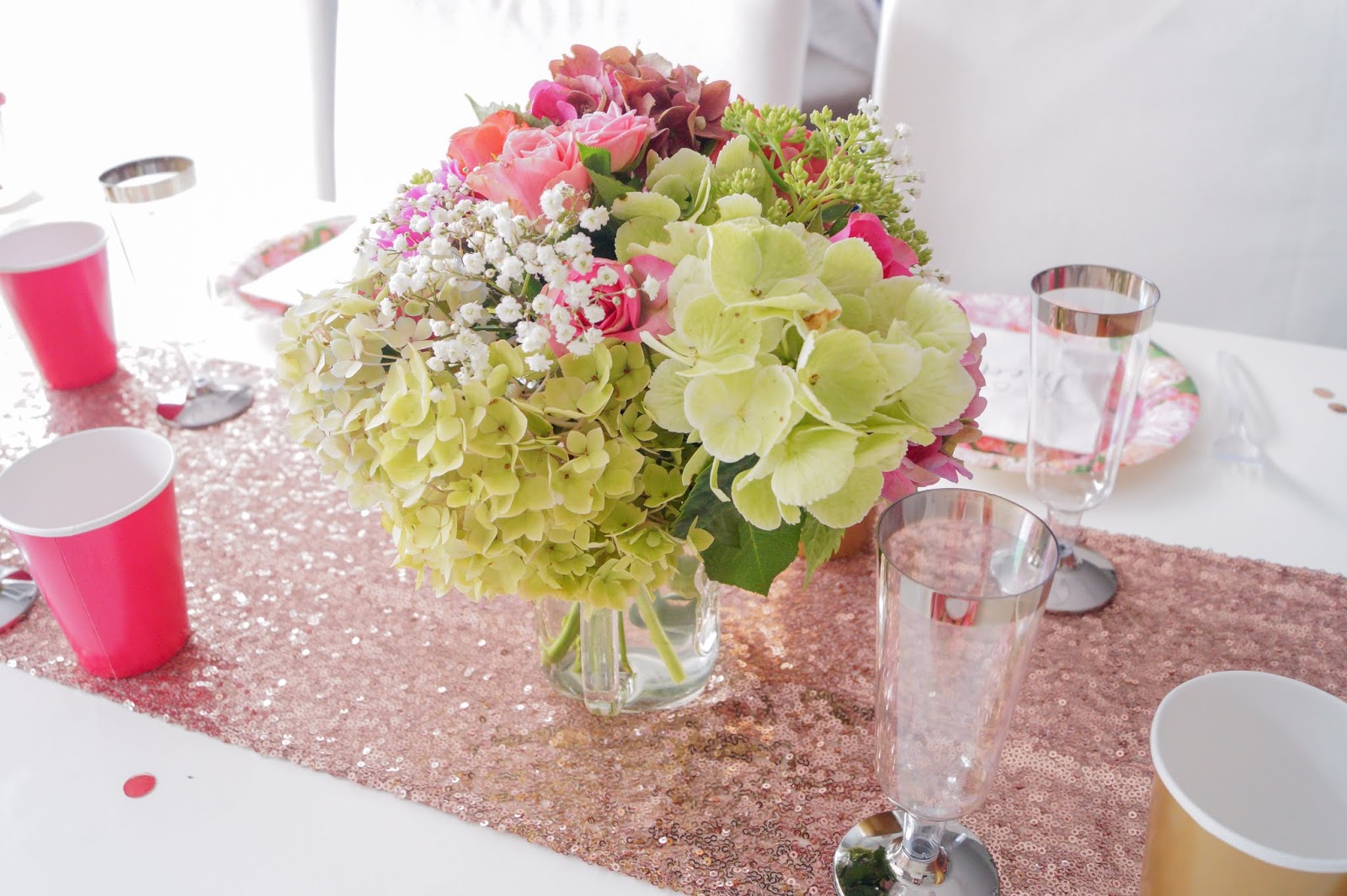 The buffet consisted of two tables I clothed with pink plastic ruffle table clothes to hide the hiddeous legs.