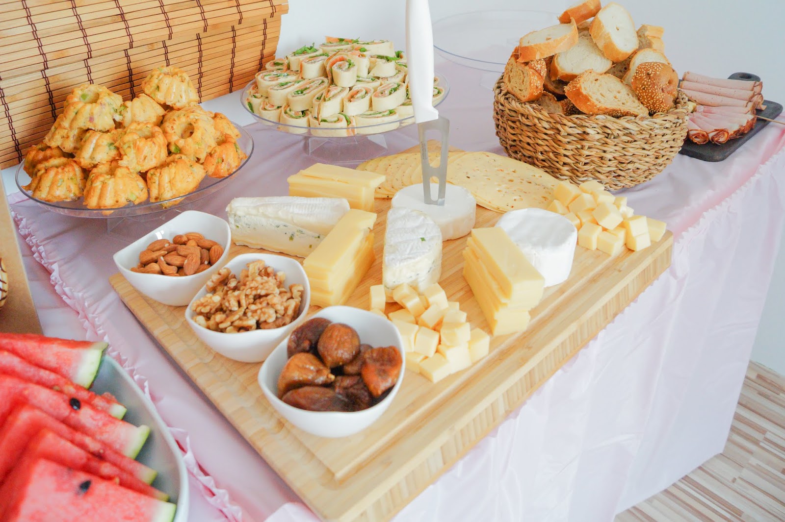 The hearty side was covered in salmon burritos and fish filled croissants. Hearty miniature bundt cakes (recipe is coming soon) and a cheese board.