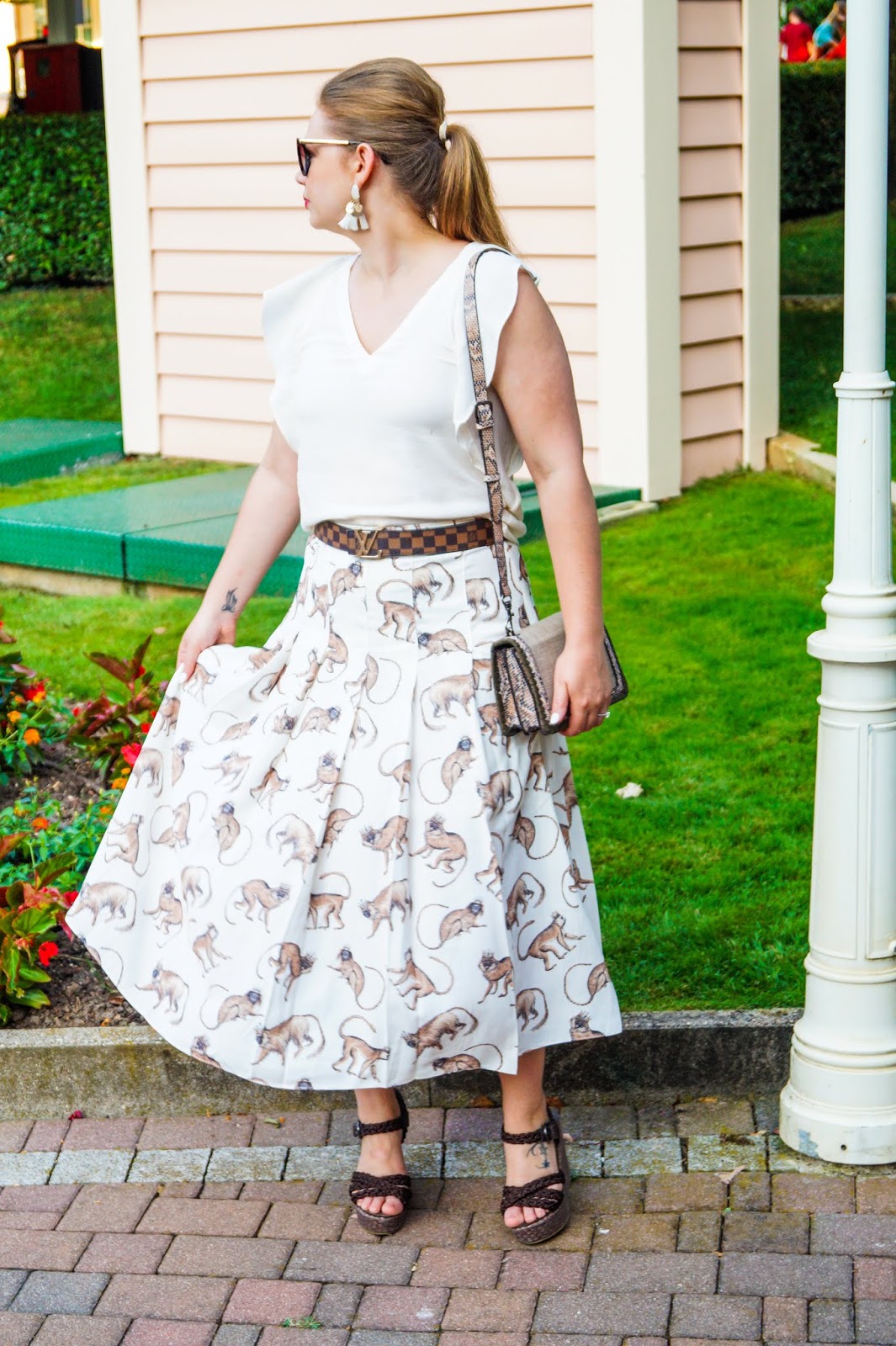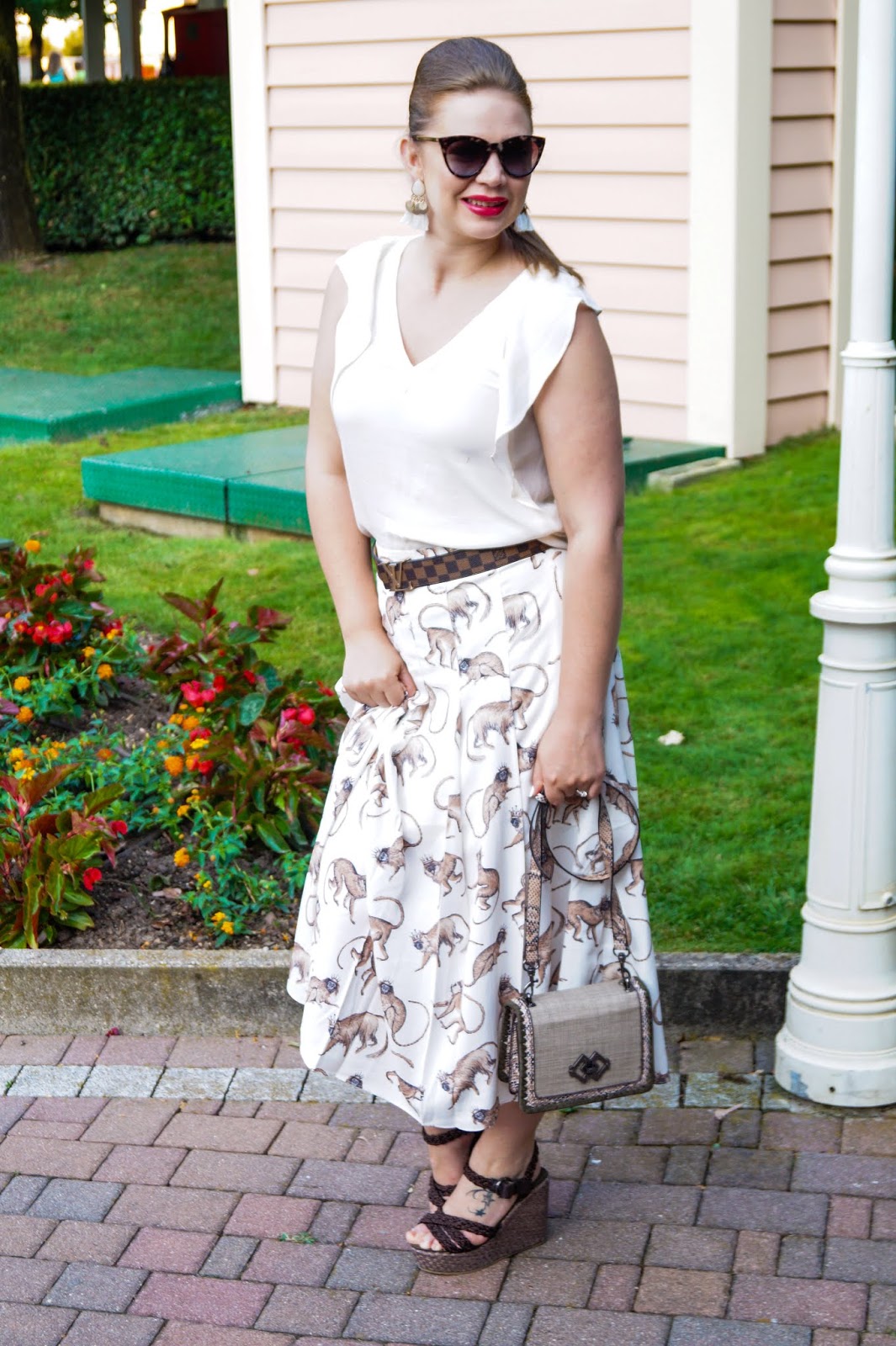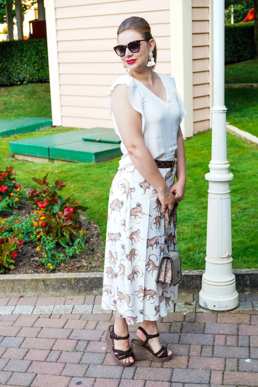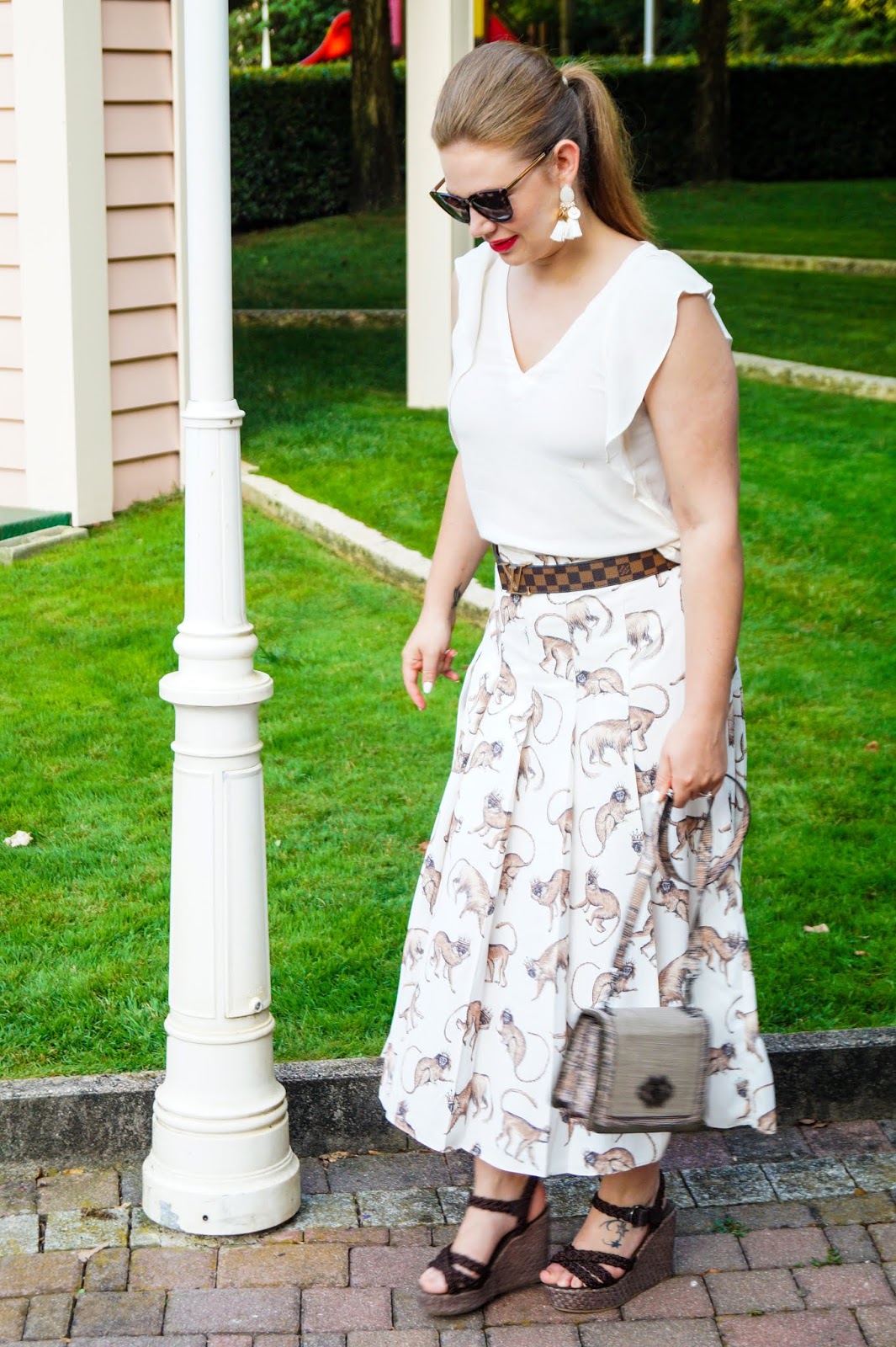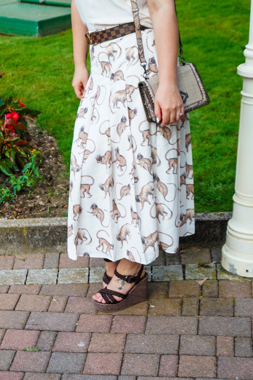 The background of the skirt is a light beige hue so I ended up pairing it with a ruffle sleeved t-shirt in the same color (just didn´t have a brown top). But all my other accessories (belt, bag and wedges) are in cold brown hues to macht the little monkeys.
