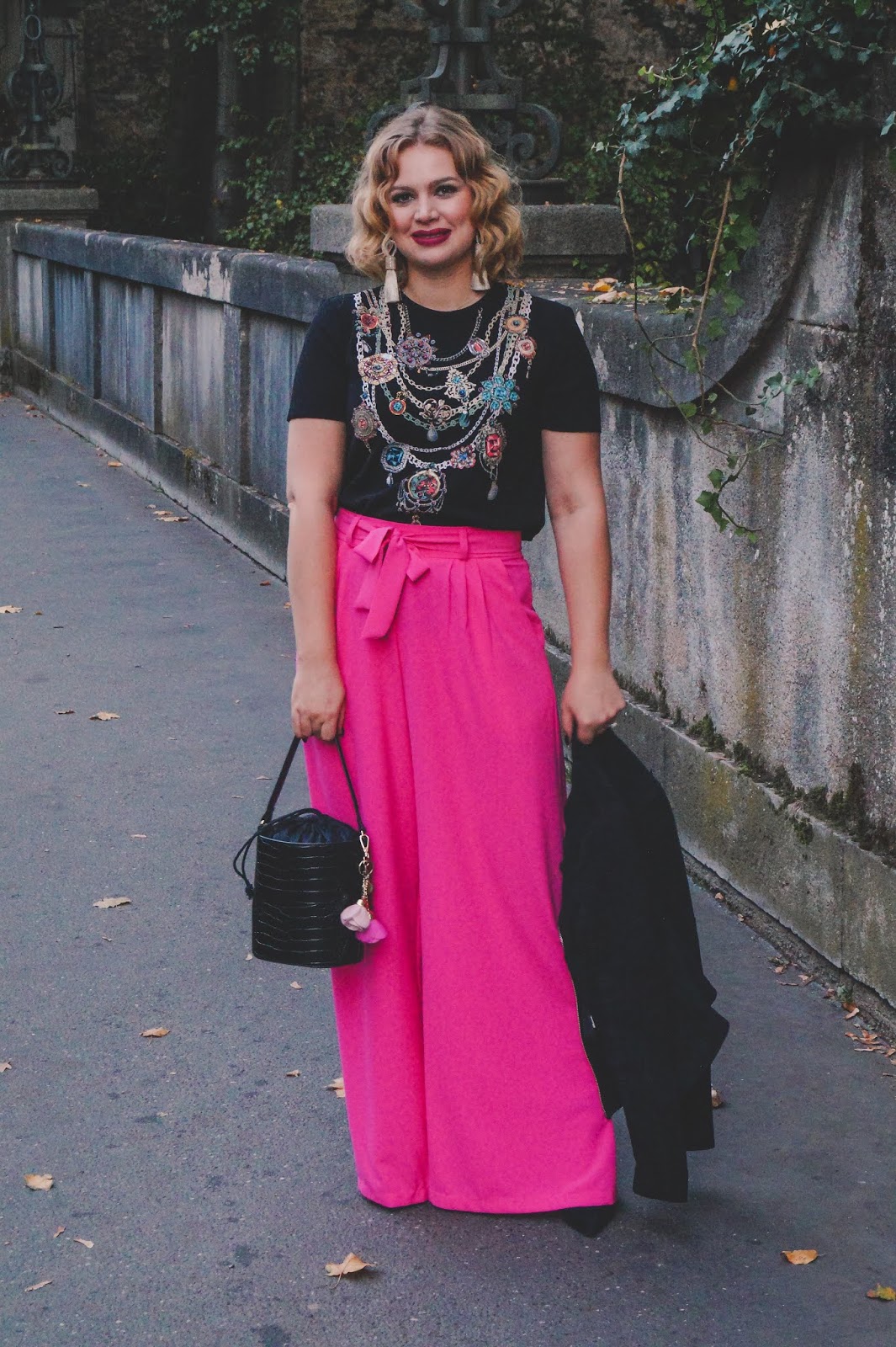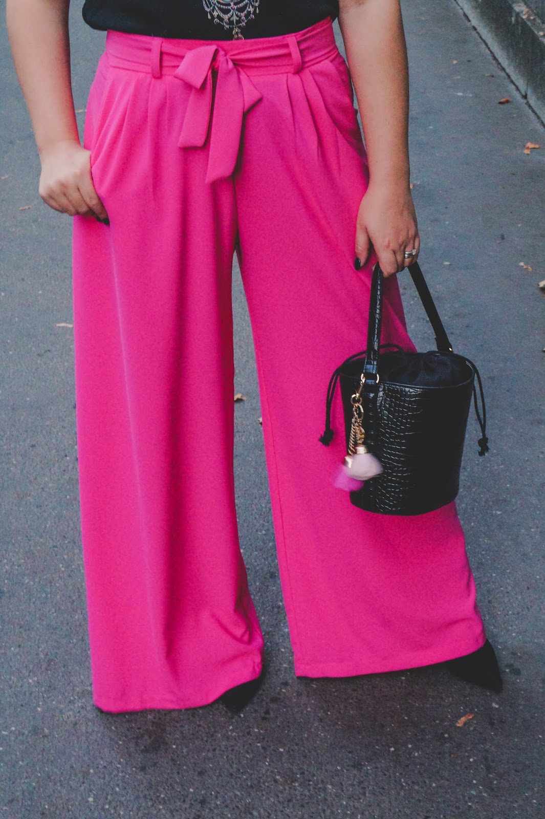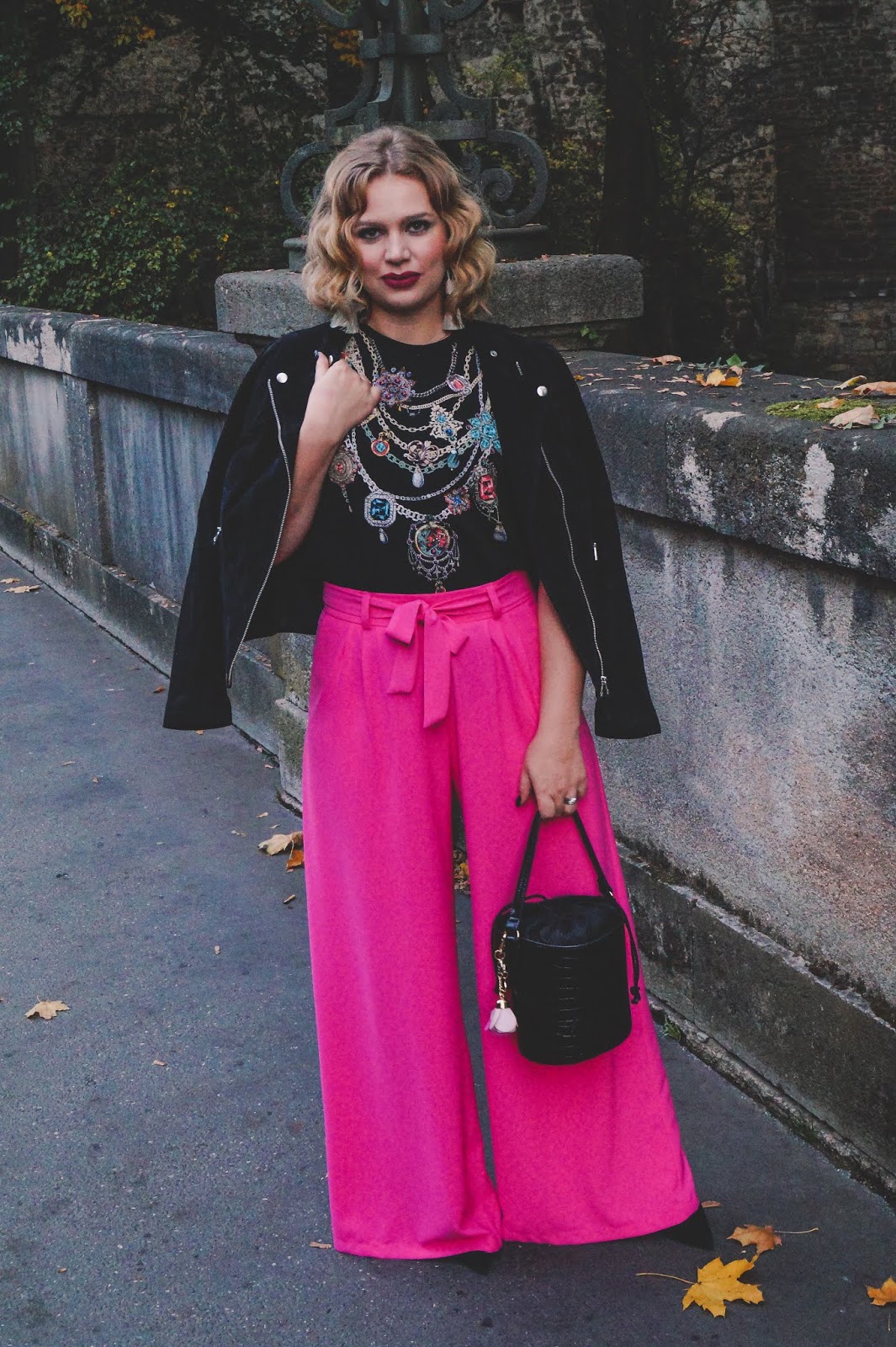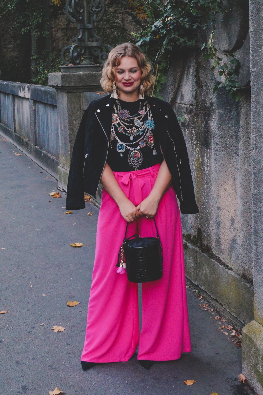 Since the pair of pants is chic itself I would recommend to dress it down with a t-shirt. The shirt I am wearing in the post is from Zara but I couldn´t find it online. Wearing a blouse to it can be a little too much (but of course that always depends on the restaurant you are going to).I also took a black suede leather jacket with me and the bucket bag I have been in love lately. For every outift I need a black bag it´s its turn.