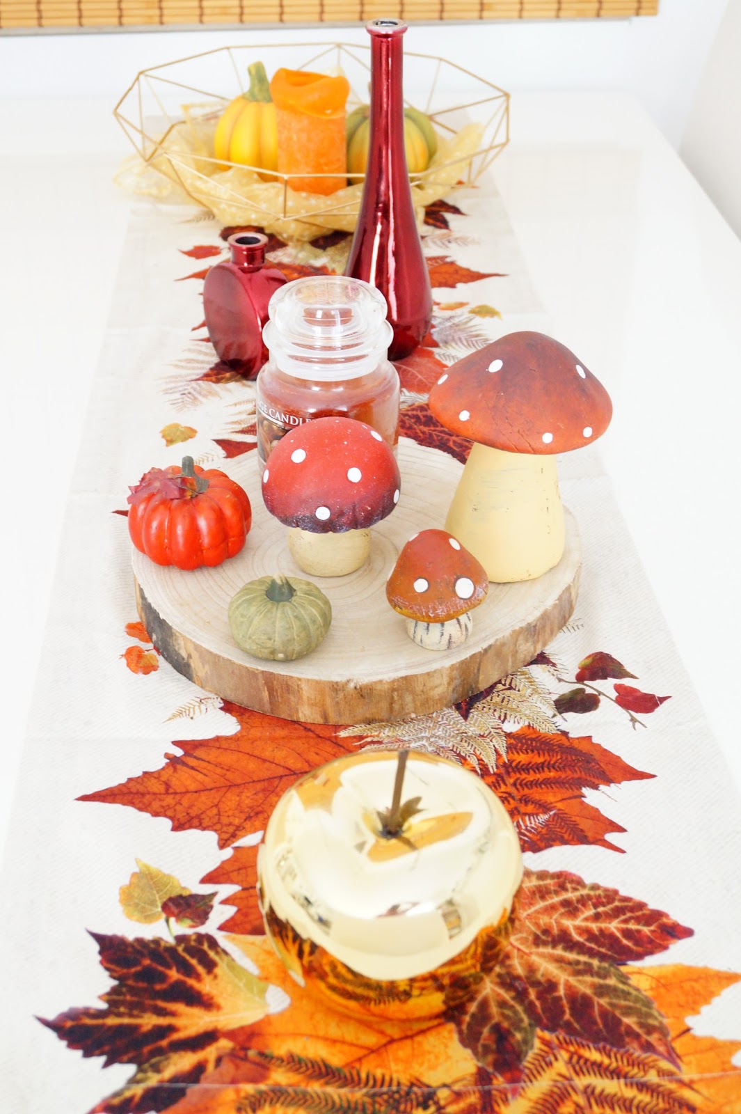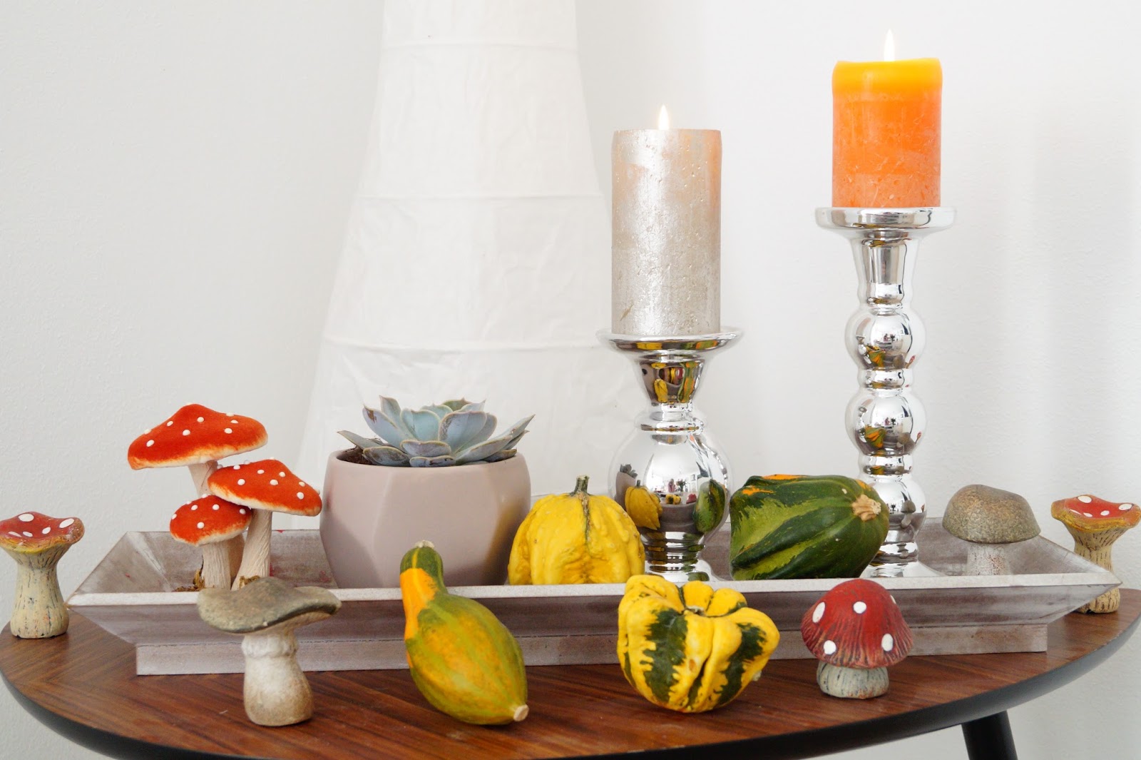 table runner Apelt through amazon / wood plate Nanu Nana / ceramic pumpkis Nanu Nana sold out similar here / orange candle here / mushrooms Nanu Nana sold out too similar here / golden apple old similar here / black plate available in white here Ikea / little brown table Ikea / candle stick silver small Nanu Nana / candle stick silver big Nanu Nana / grey candle plate Nanu Nana