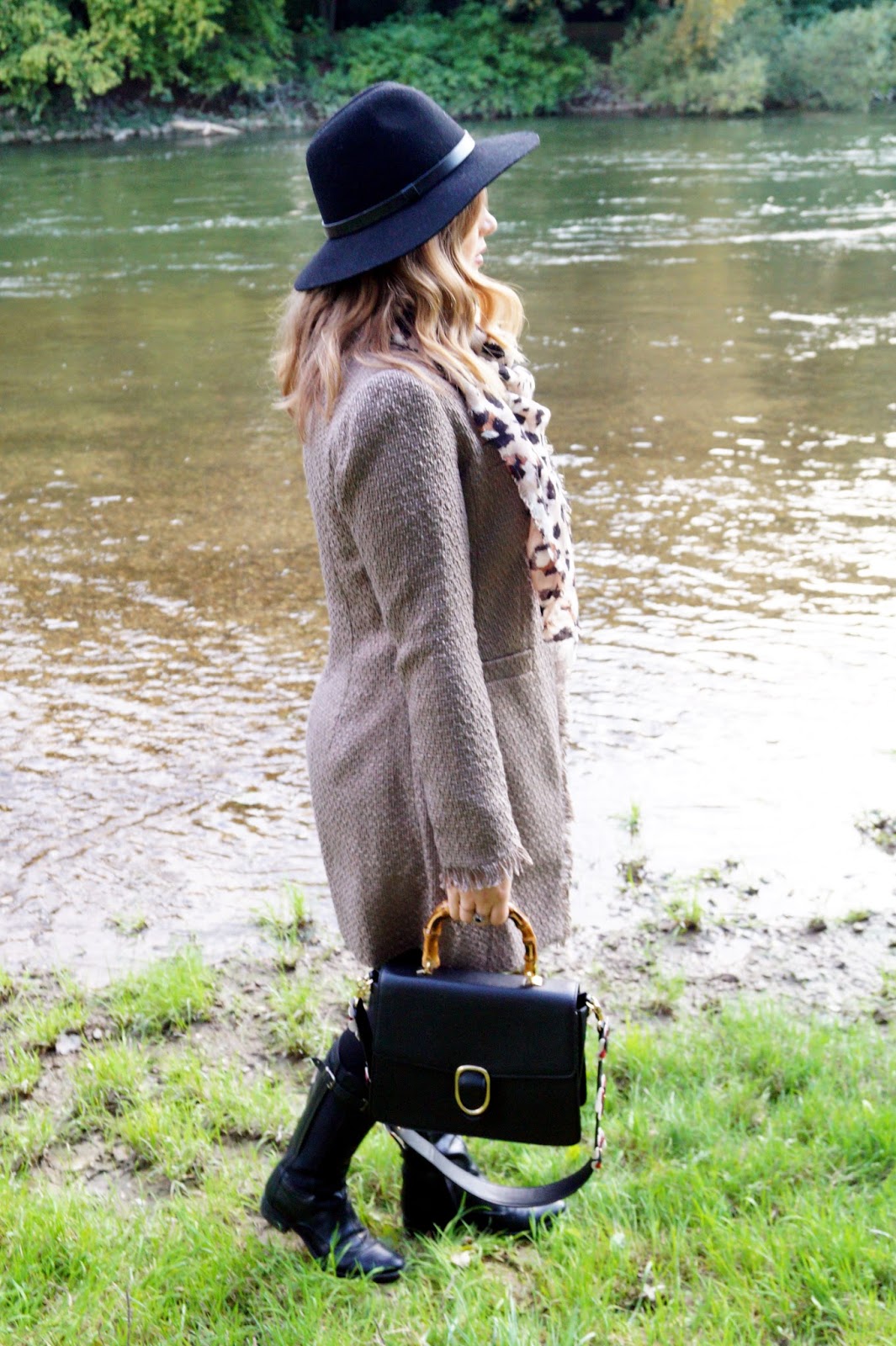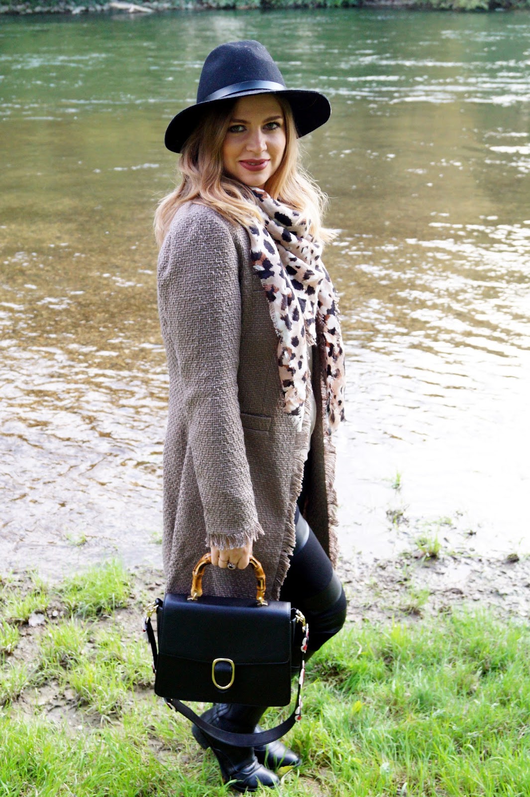 The leggins have this faux leather material in the front and a soft and warm fabric in the back of the pants. I like that a lot (also owned a similar pair before this one) cause it adds an interesting touch to the pants. For color combinations of brown and black I love pairing a leopard print scarf cause I think that fits so well. I got this one a few years ago but since leopard print is still so popular you won´t have a problem finding one these days.