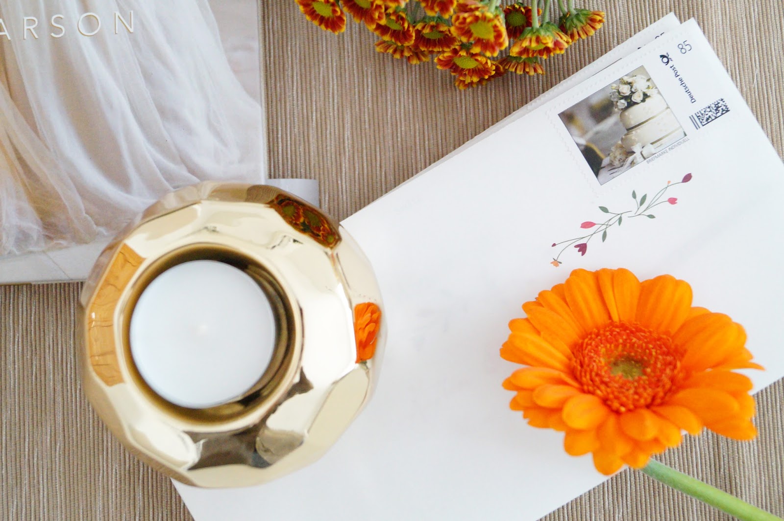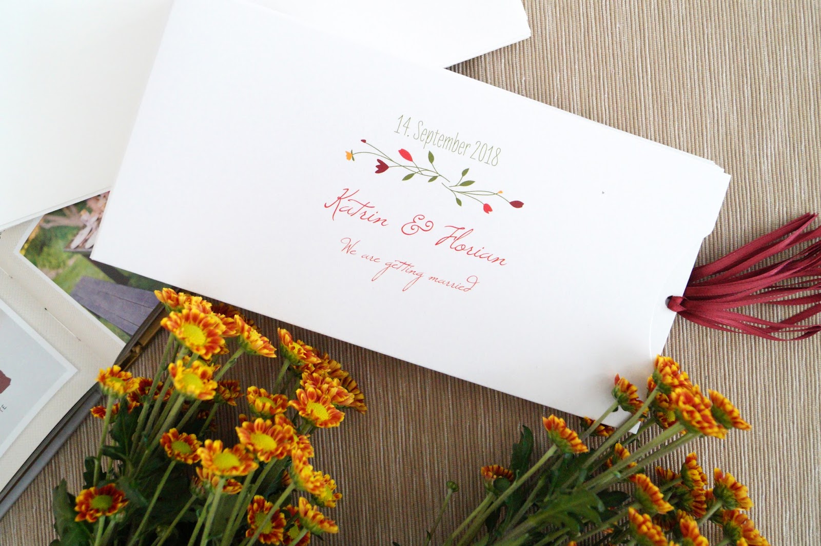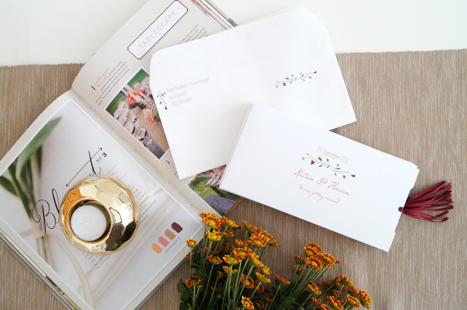This was the invitation which came closest to my romantic fall wedding theme I wanted. And in the end I love how it turned out. With the shiny paper and the small flowers on top of the card.