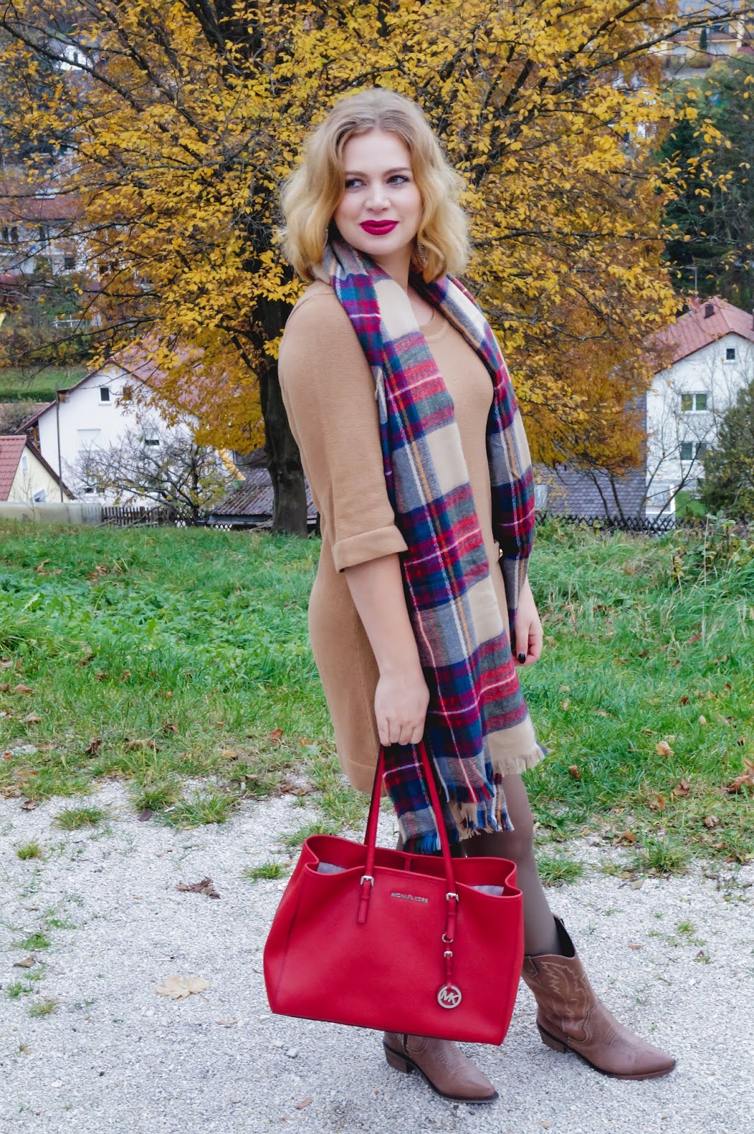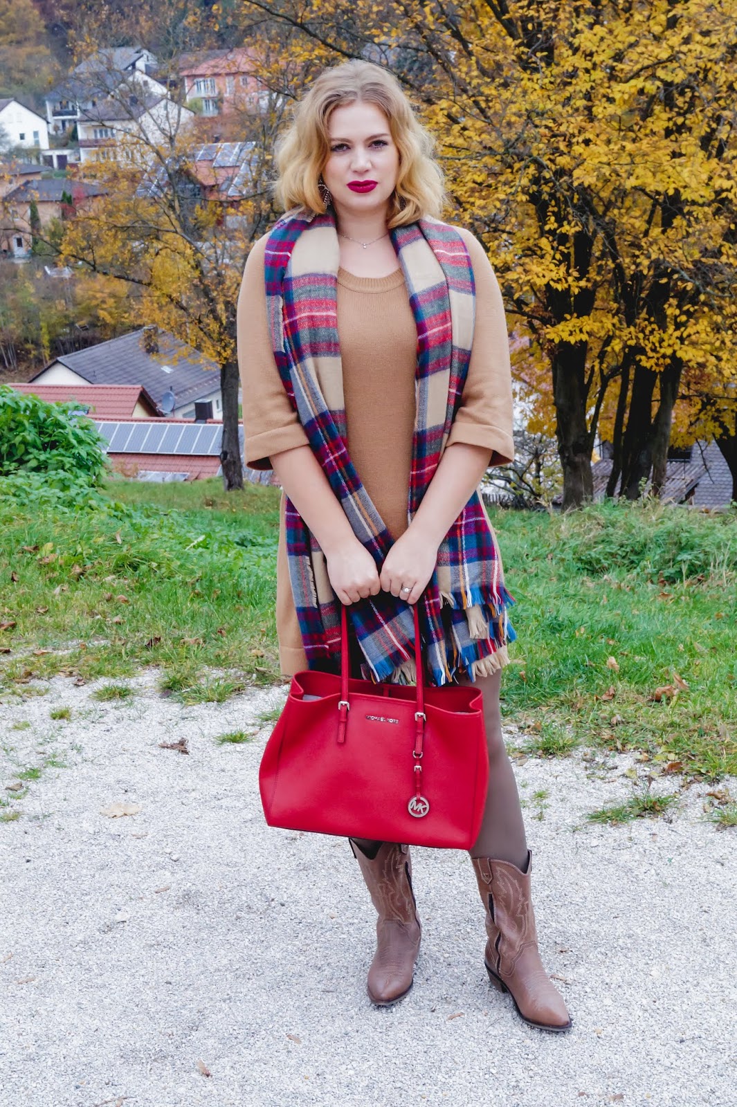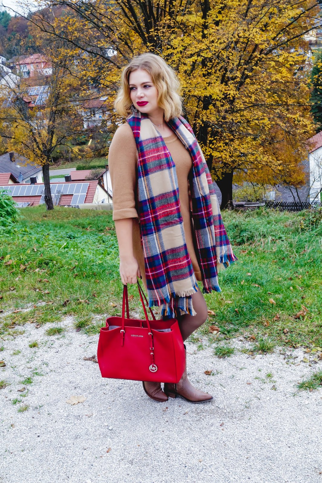 So for my look I paired a beige knitted dress and a plaid skirt with my latest shoe closet addition. The pops of red throughout the whole look (in the scarf, my lips and the bag) mixed in some statement and also loosened up the all beige/brown look.