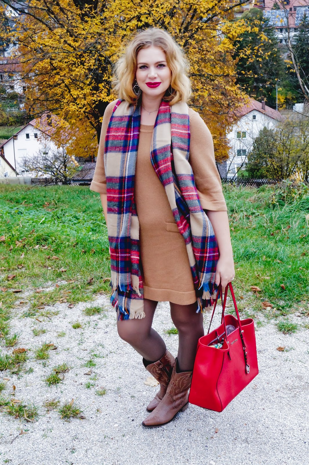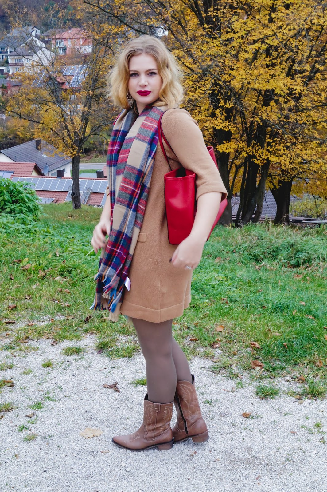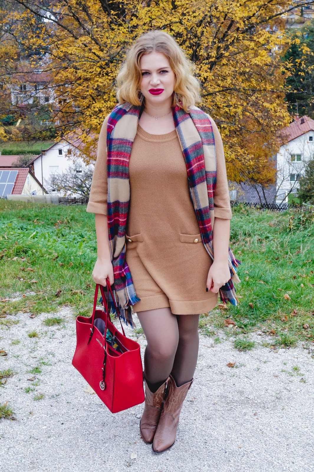 So for my look I paired a beige knitted dress and a plaid skirt with my latest shoe closet addition. The pops of red throughout the whole look (in the scarf, my lips and the bag) mixed in some statement and also loosened up the all beige/brown look.