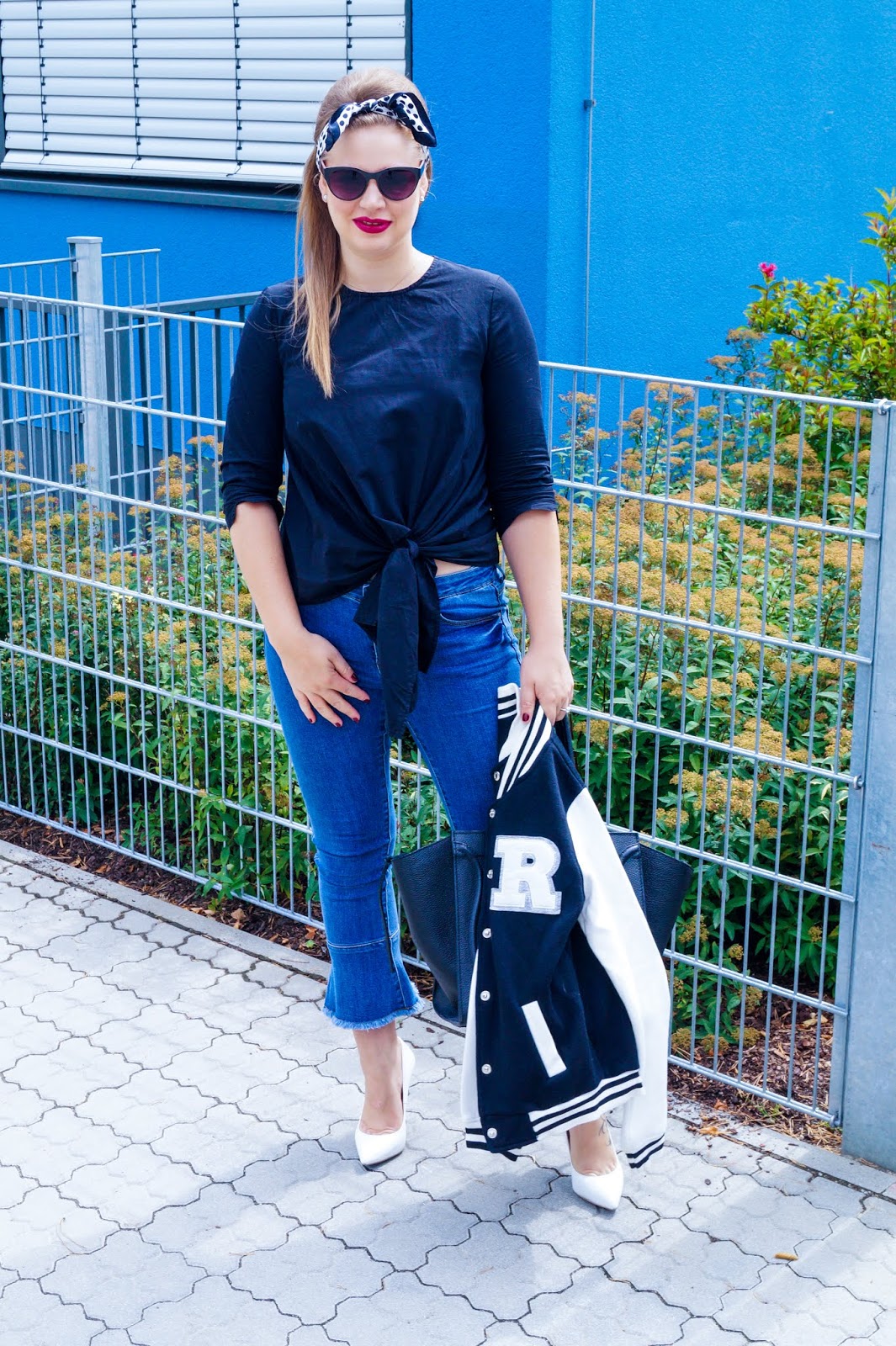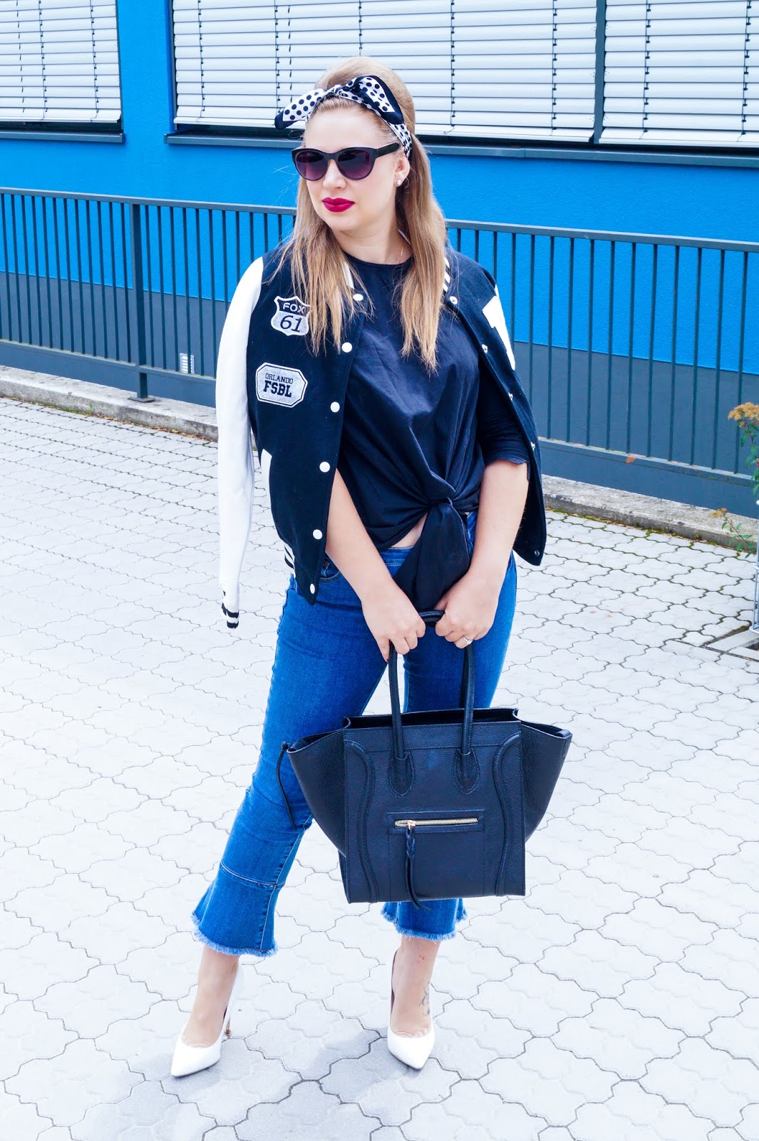 lips D for Danger MAC / headbank (I used a small scarf) similar here and here / side knot shirt Pieces old similar here and here / white leather pointed toe pumps Buffalo sold out similar here and here / Céline dupe bag Fashion Drug currently sold out similar here real one here / baseball jacket super old similar here and here / kick flare jeans old similar here and here