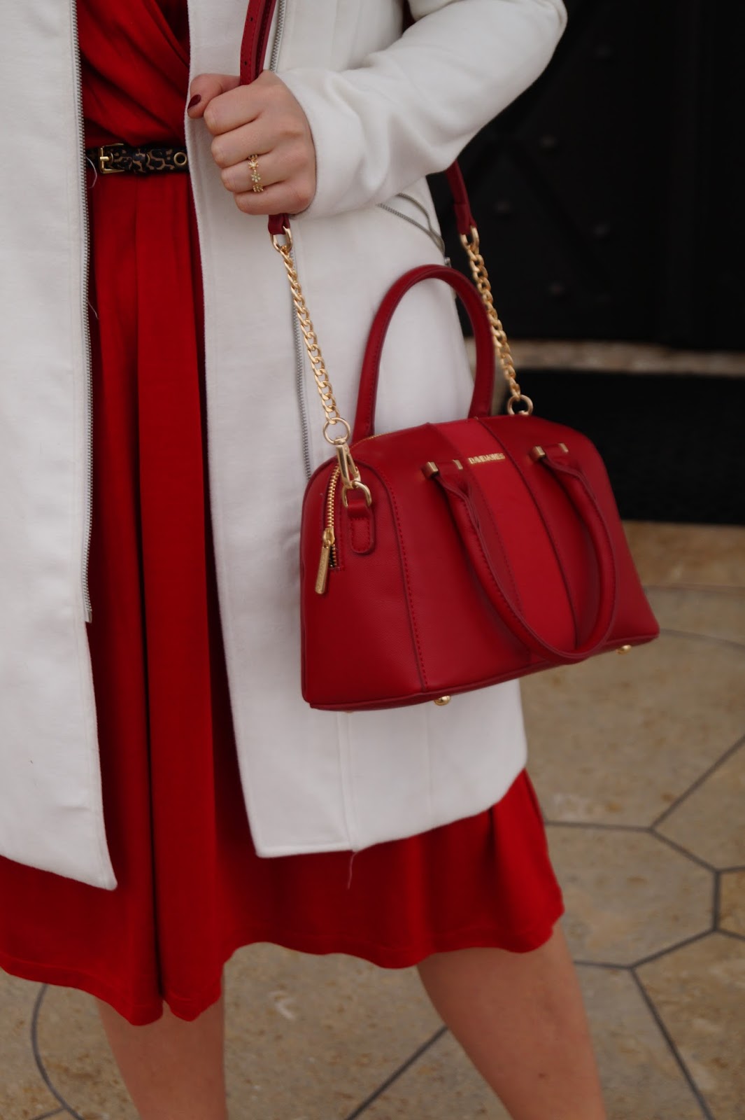 Dress similar here and here / Shoes / Bag similar here and here / Belt similar here / Earrings similar here / Coat similar here and here