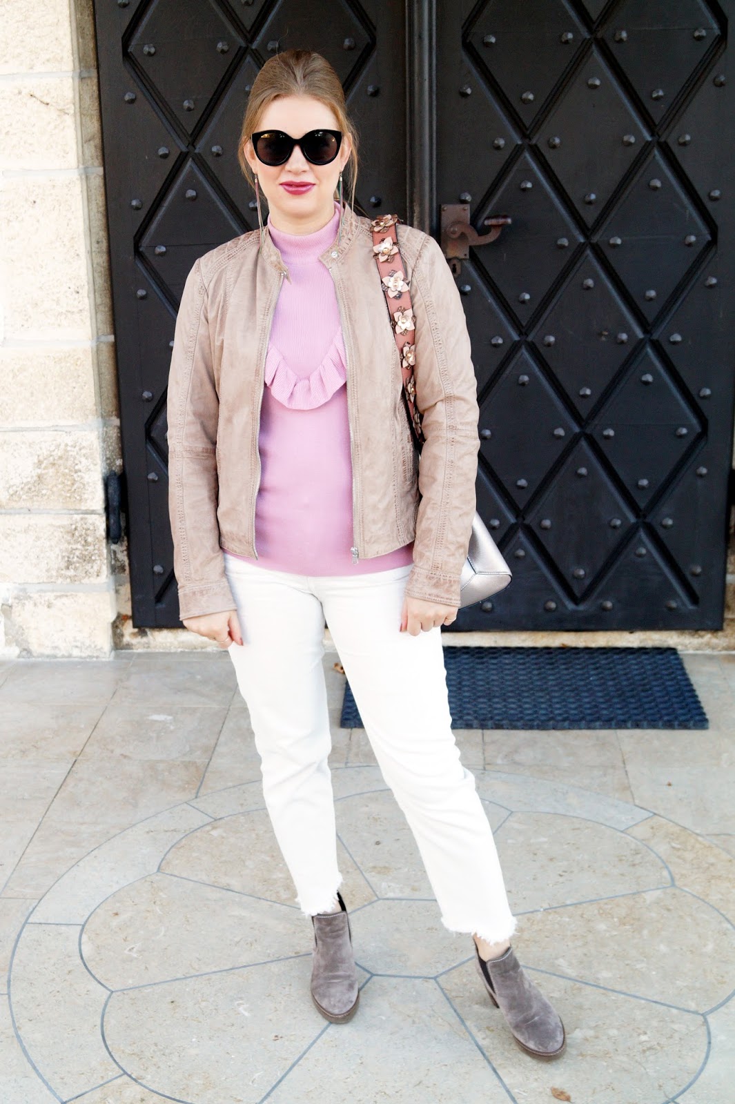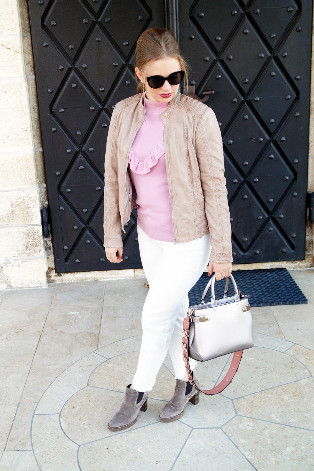 I paired this super cute pink ruffle sweater from New Look to my white pair of jeans. They are super comfortable and really high-waisted which I love at the moment. This style is really flattering for me and flattens my tummy a lot. And the hem is so cool and trendy. I love the pants so much I also got them in the dark blue and light blue shade (slightly obsessed).