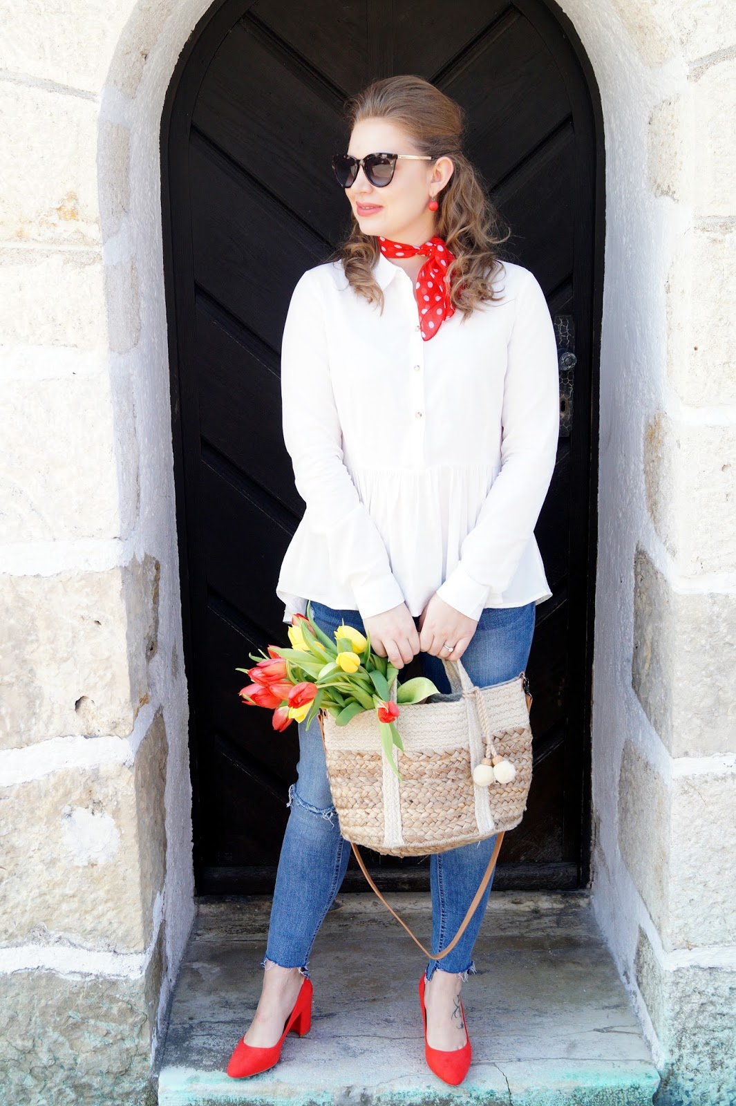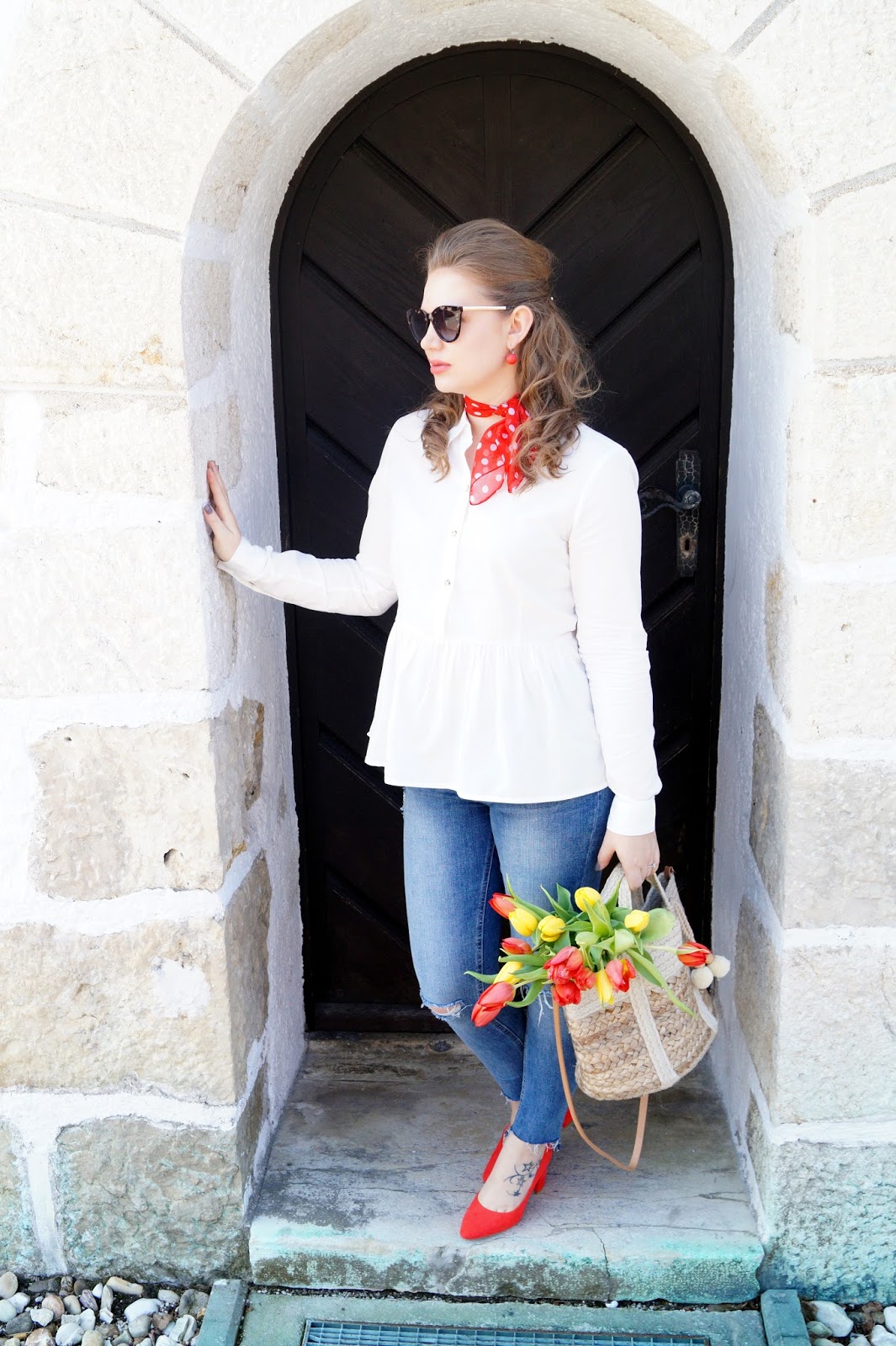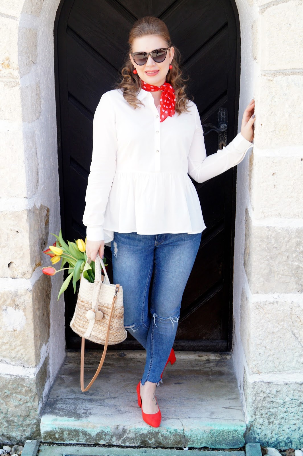 pumps H&M / peplum blouse Jacqueline de Yong / denim H&M similar here and here / sunnies H&M / raffia tote Mango last season similar here / neckerchief Bijou Brigitte similar here